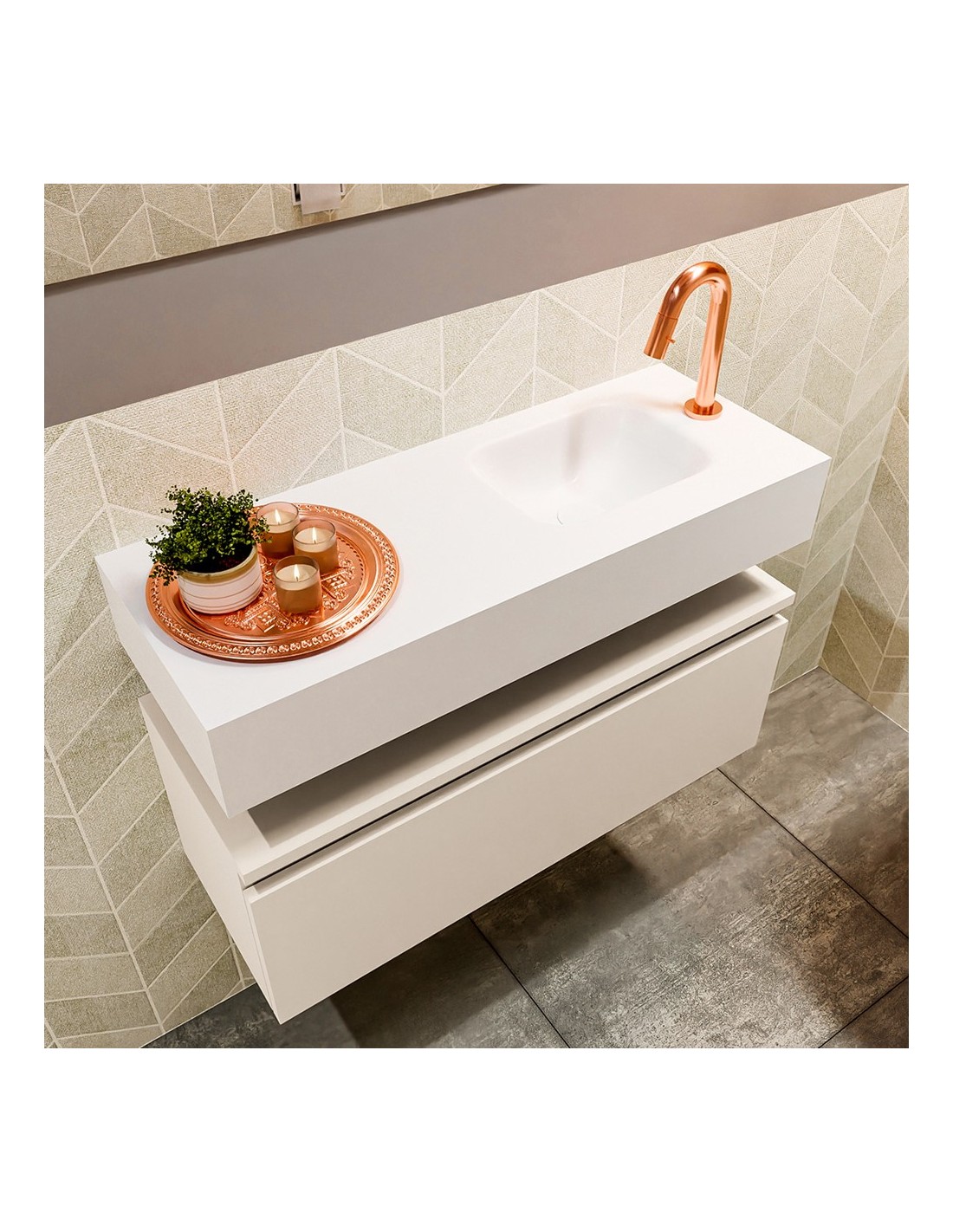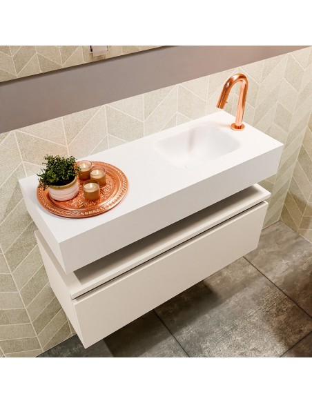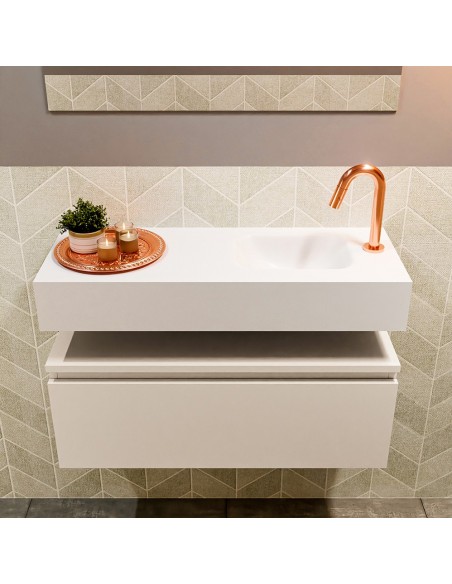 ANDOR Komplet badmiljø med højrevendt håndvask til bordmonteret armatur. Badmiljøet kommer med 1 skuffe med fuldt udtræk, og er fremstillet i MDF. Håndvasken er fremstillet i talkumsfarvet (mat hvid) solid surface. Badmiljøet måler 80 cm i bredden. Det viste armatur medfølger ikke i sættet.