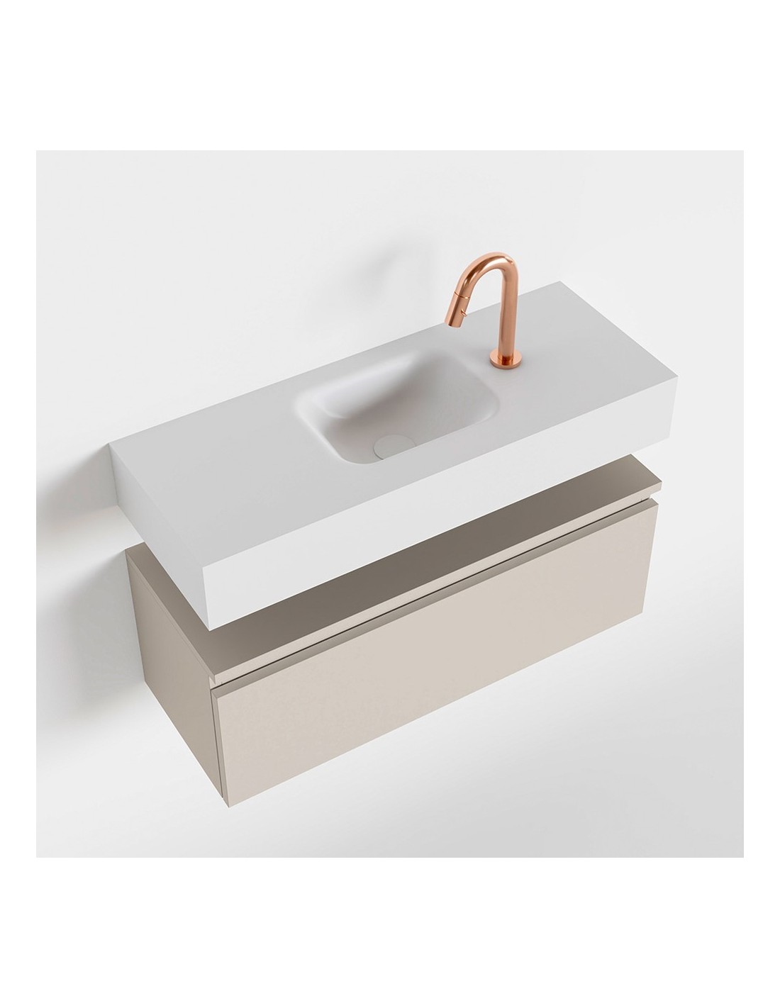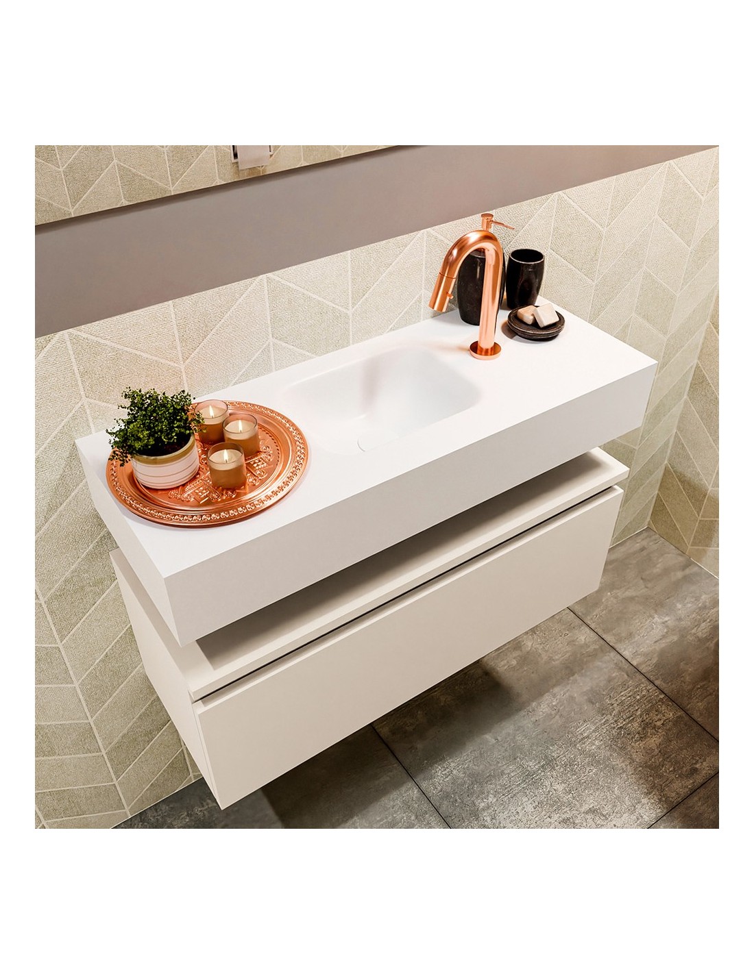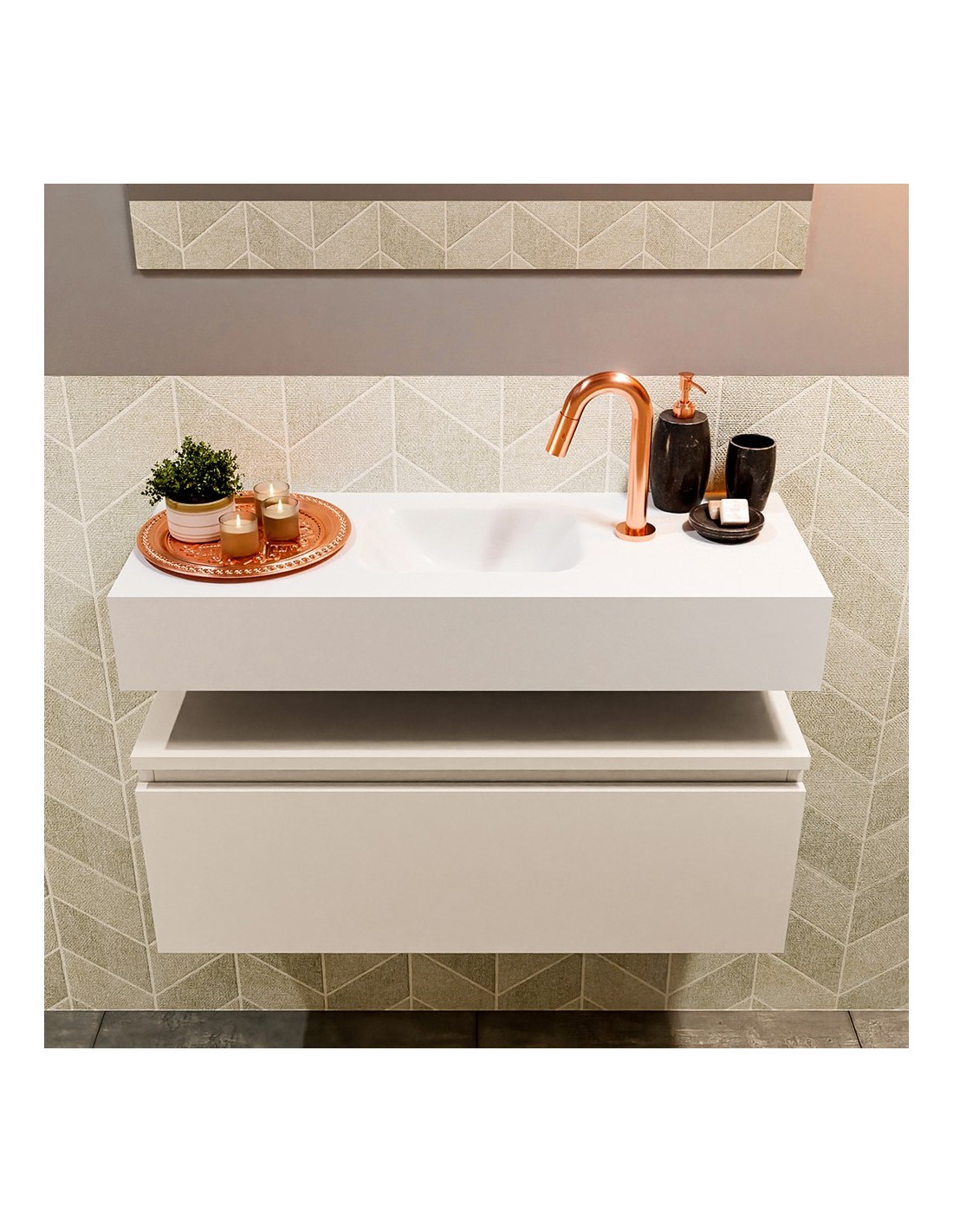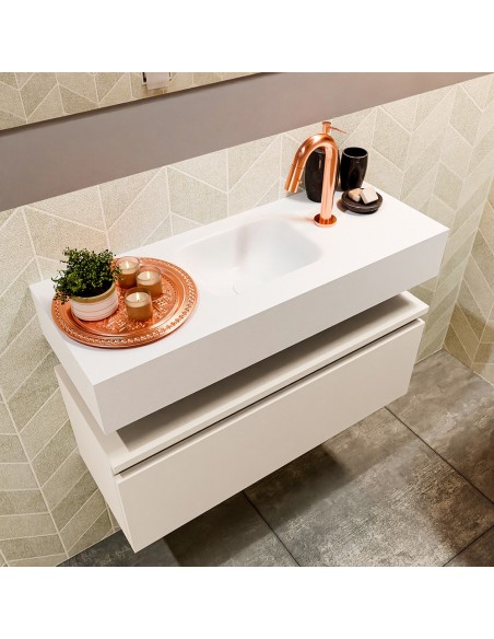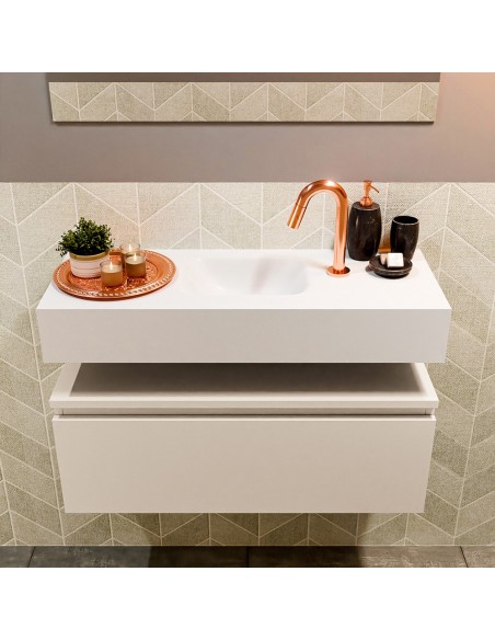 ANDOR Komplet badmiljø med midt centreret håndvask til bordmonteret armatur. Badmiljøet kommer med 1 skuffe med fuldt udtræk, og er fremstillet i MDF. Håndvasken er fremstillet i talkumsfarvet (mat hvid) solid surface. Badmiljøet måler 80 cm i bredden. Det viste armatur medfølger ikke i sættet.
