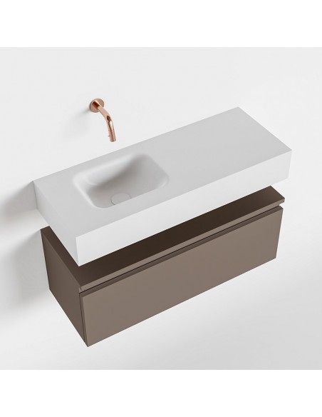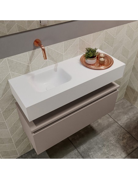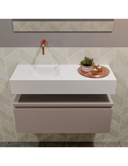 ANDOR Komplet badmiljø med venstrevendt håndvask til vægmonteret armatur. Badmiljøet kommer med 1 skuffe med fuldt udtræk, og er fremstillet i MDF. Håndvasken er fremstillet i talkumsfarvet (mat hvid) solid surface. Badmiljøet måler 80 cm i bredden. Det viste armatur medfølger ikke i sættet.