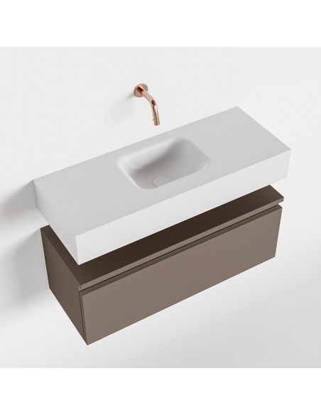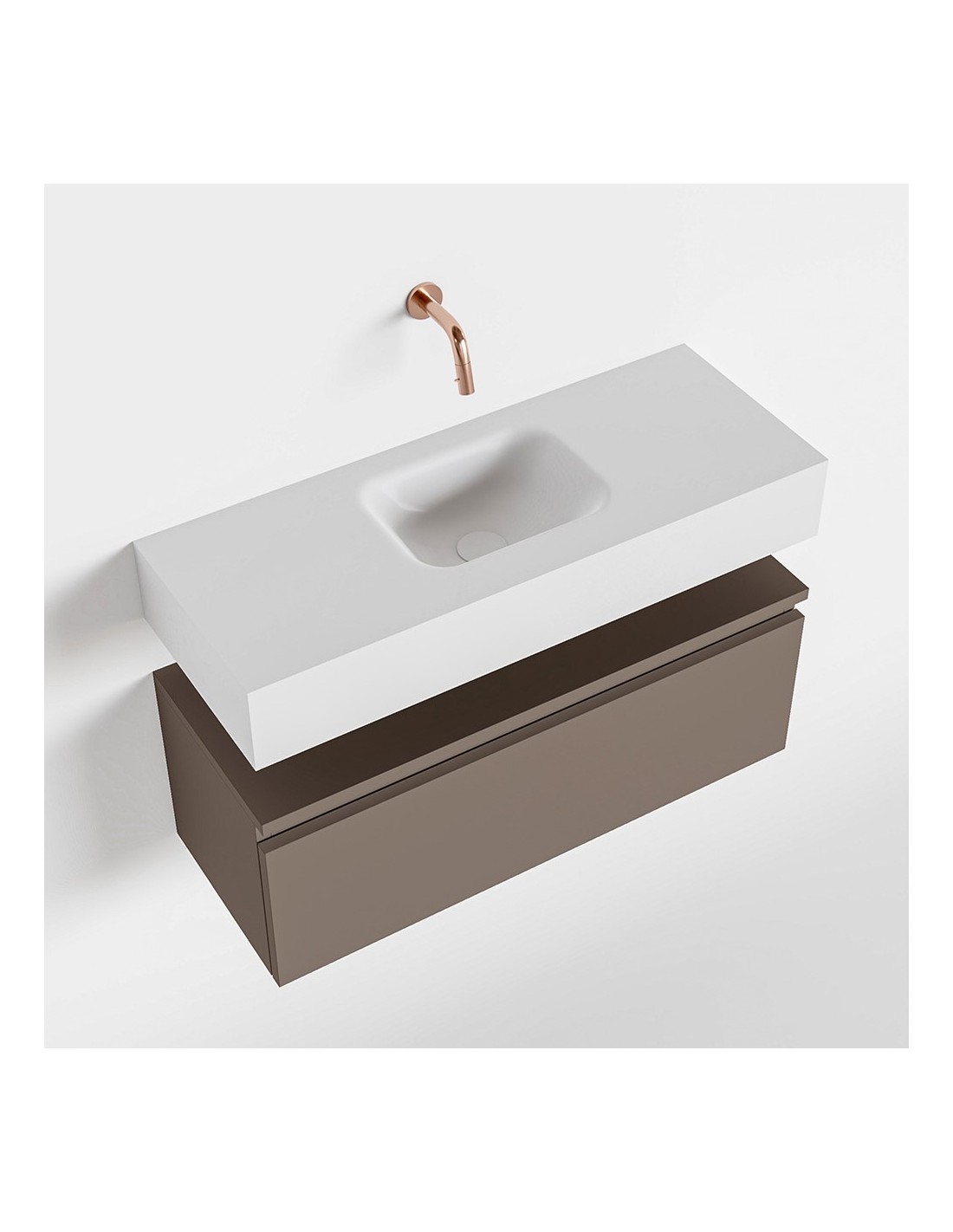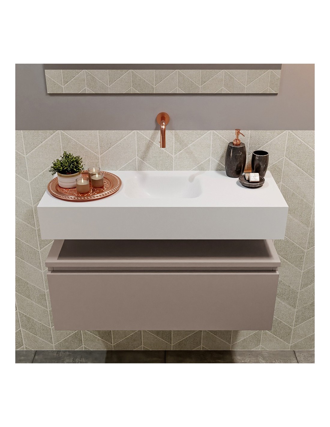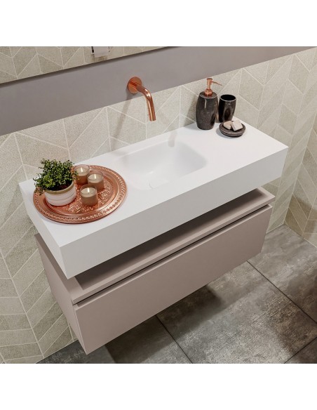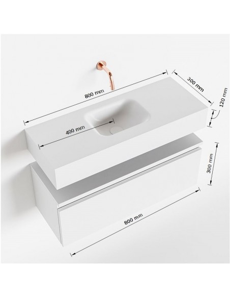 ANDOR Komplet badmiljø med midt centreret håndvask til vægmonteret armatur. Badmiljøet kommer med 1 skuffe med fuldt udtræk, og er fremstillet i MDF. Håndvasken er fremstillet i talkumsfarvet (mat hvid) solid surface. Badmiljøet måler 80 cm i bredden. Det viste armatur medfølger ikke i sættet.