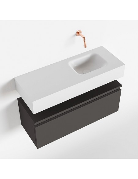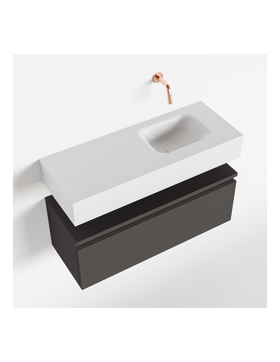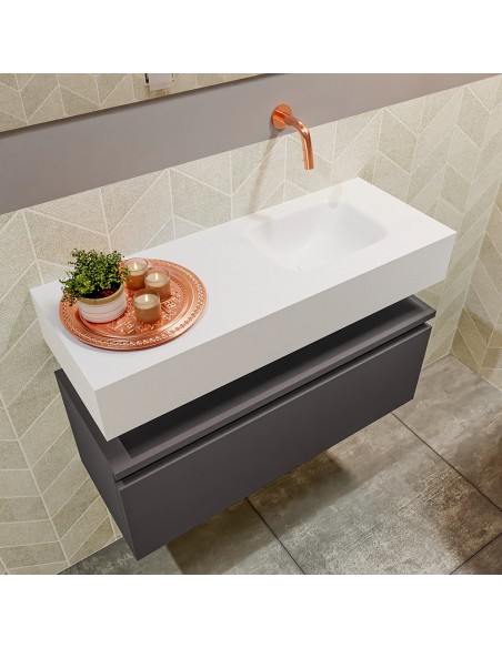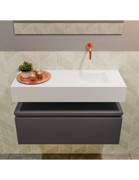 ANDOR Komplet badmiljø med højrevendt håndvask til vægmonteret armatur. Badmiljøet kommer med 1 skuffe med fuldt udtræk, og er fremstillet i MDF. Håndvasken er fremstillet i talkumsfarvet (mat hvid) solid surface. Badmiljøet måler 80 cm i bredden. Det viste armatur medfølger ikke i sættet.
