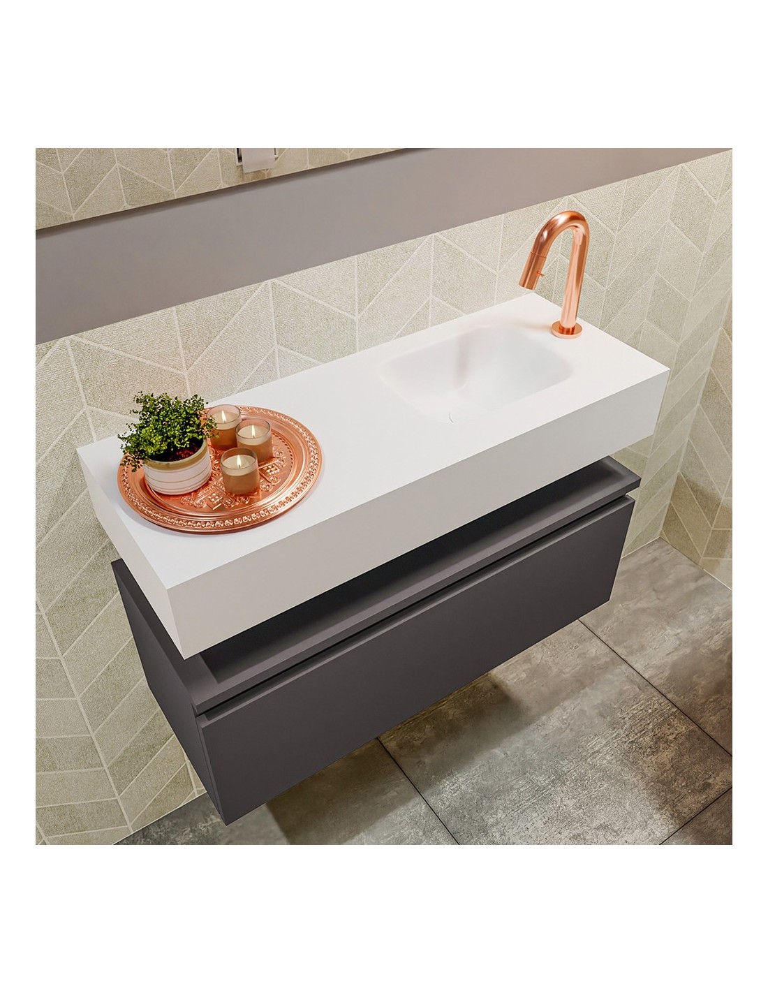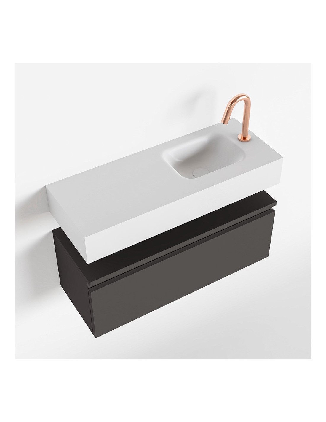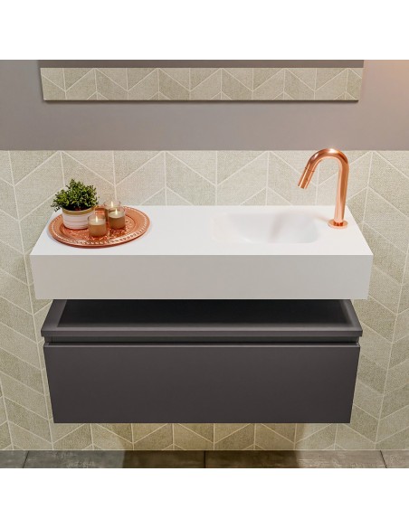 ANDOR Komplet badmiljø med højrevendt håndvask til bordmonteret armatur. Badmiljøet kommer med 1 skuffe med fuldt udtræk, og er fremstillet i MDF. Håndvasken er fremstillet i talkumsfarvet (mat hvid) solid surface. Badmiljøet måler 80 cm i bredden. Det viste armatur medfølger ikke i sættet.