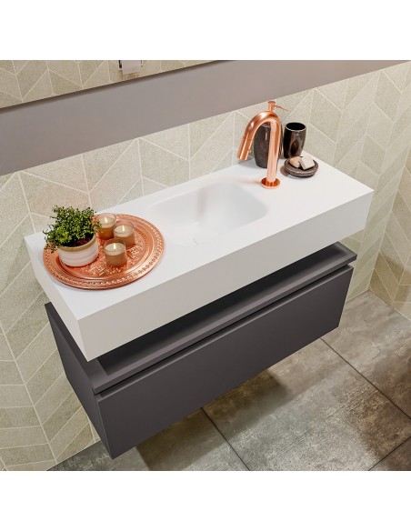 ANDOR Komplet badmiljø med midt centreret håndvask til bordmonteret armatur. Badmiljøet kommer med 1 skuffe med fuldt udtræk, og er fremstillet i MDF. Håndvasken er fremstillet i talkumsfarvet (mat hvid) solid surface. Badmiljøet måler 80 cm i bredden. Det viste armatur medfølger ikke i sættet.