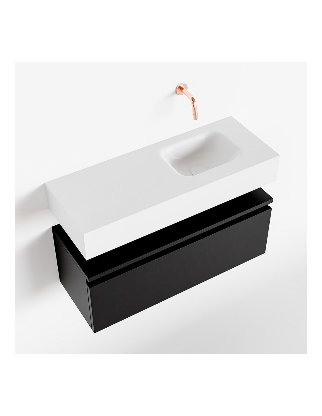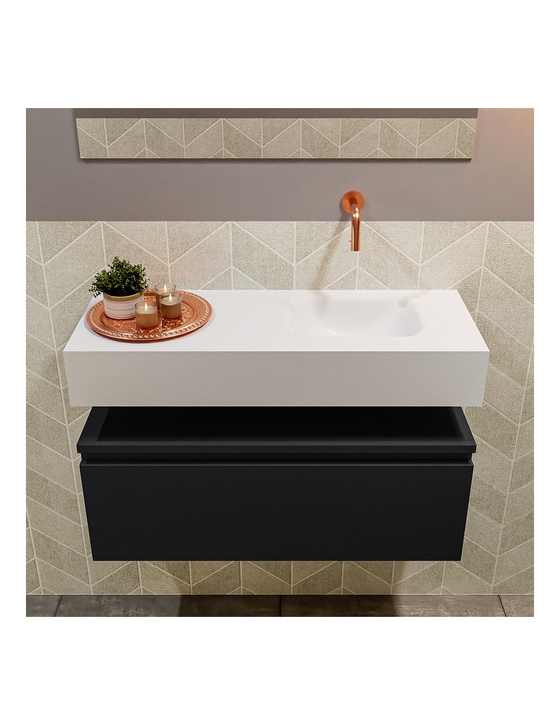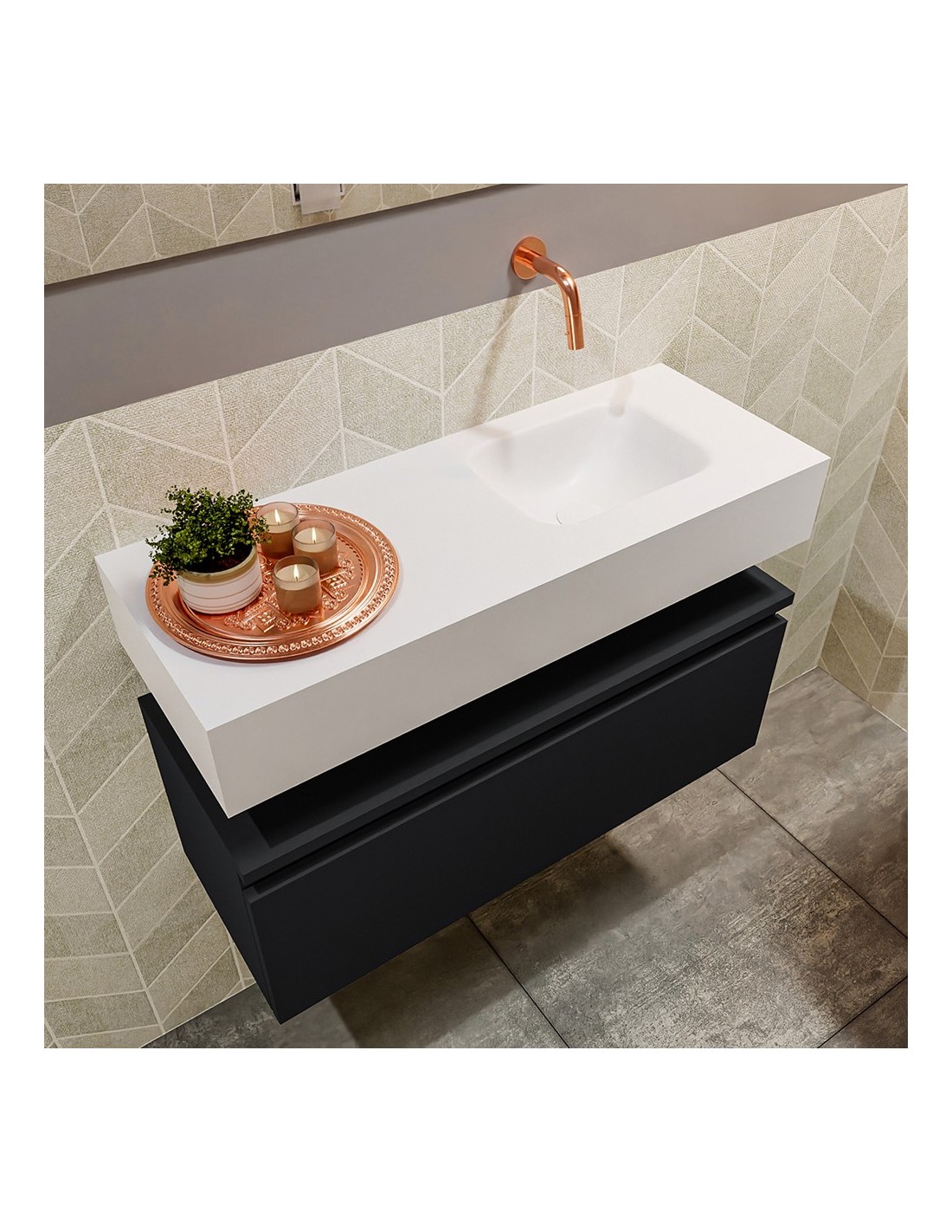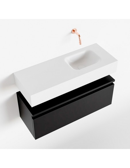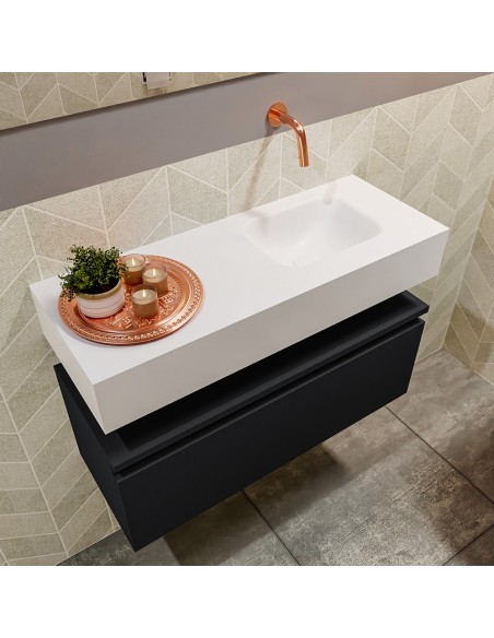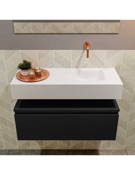 ANDOR Komplet badmiljø med højrevendt håndvask til vægmonteret armatur. Badmiljøet kommer med 1 skuffe med fuldt udtræk, og er fremstillet i MDF. Håndvasken er fremstillet i talkumsfarvet (mat hvid) solid surface. Badmiljøet måler 80 cm i bredden. Det viste armatur medfølger ikke i sættet.