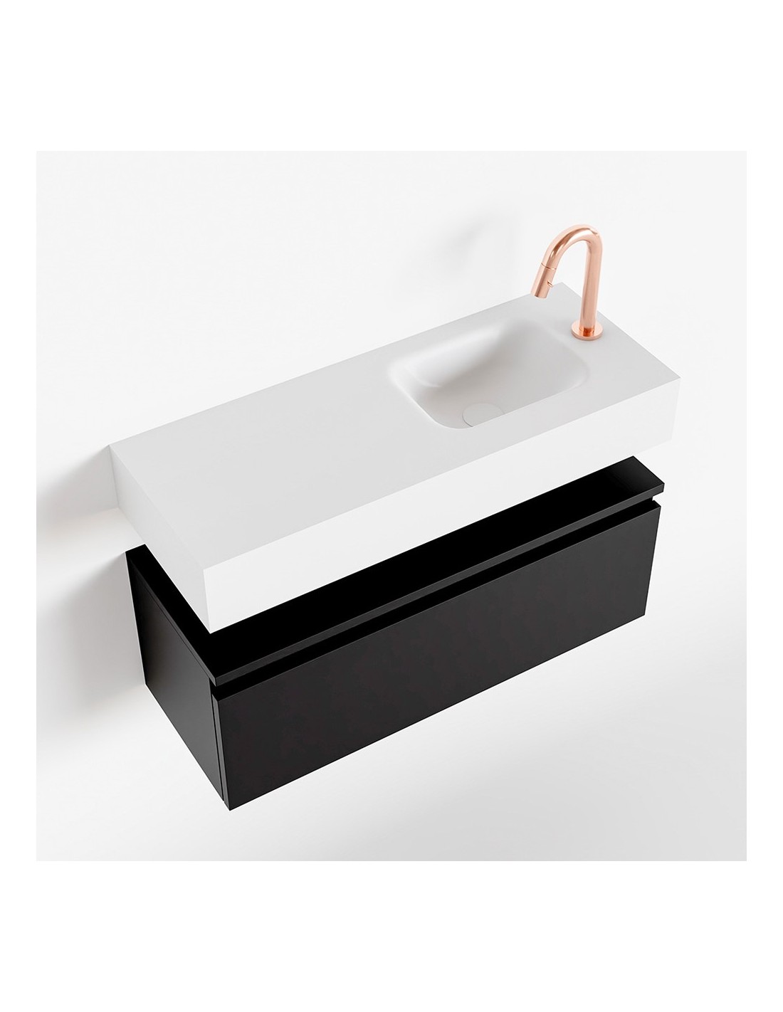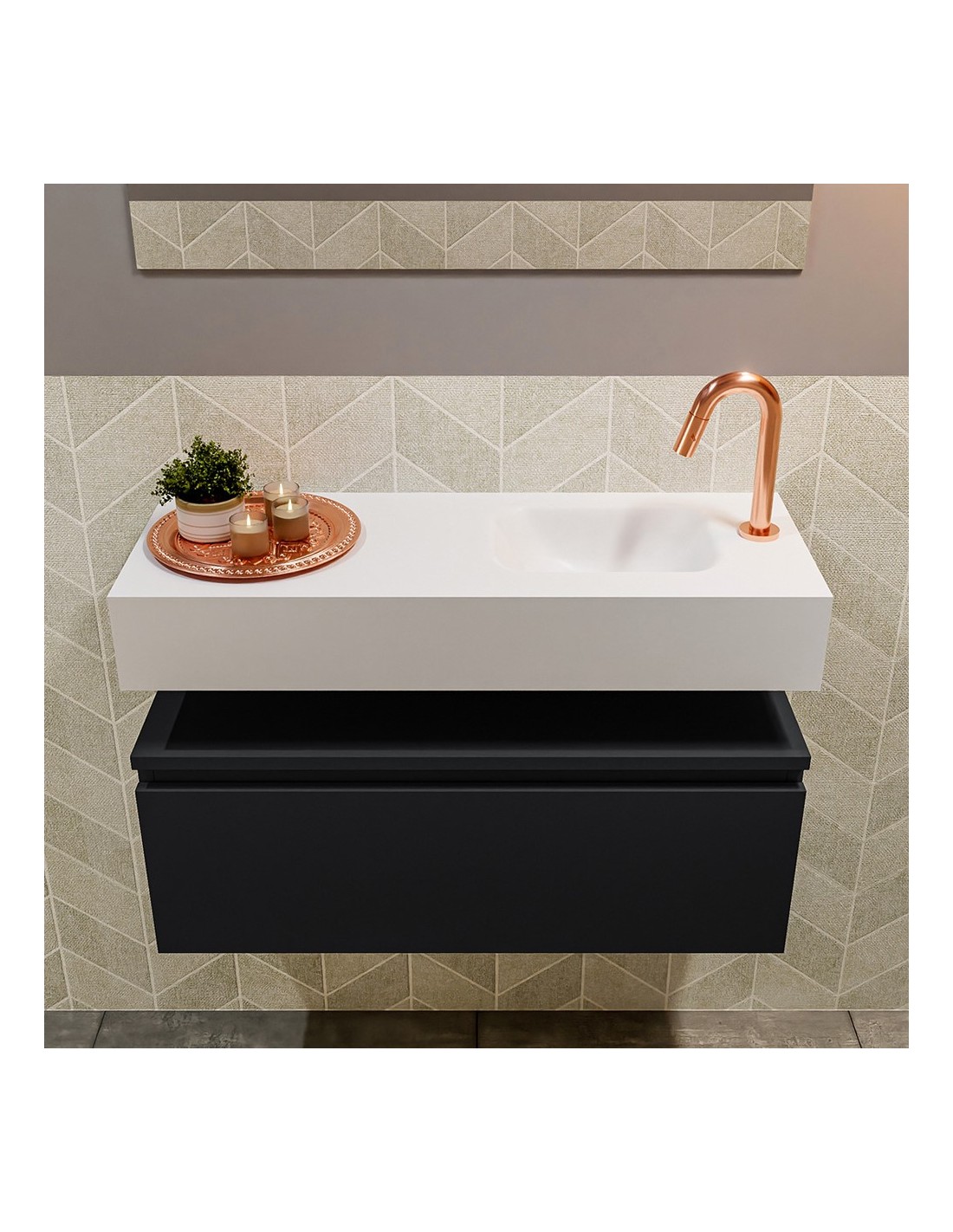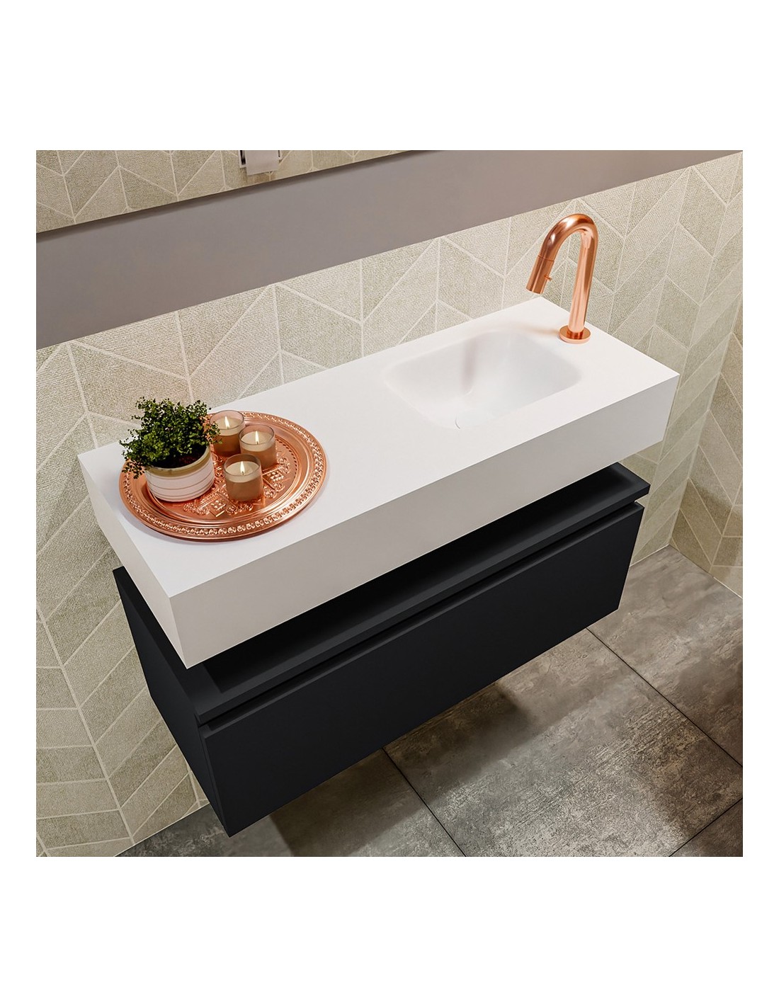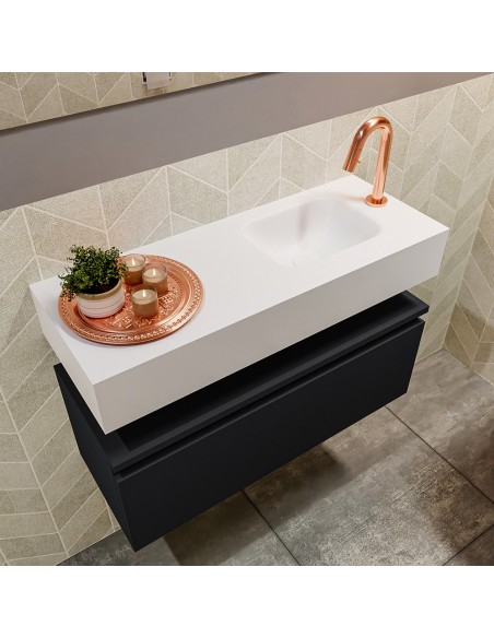 ANDOR Komplet badmiljø med højrevendt håndvask til bordmonteret armatur. Badmiljøet kommer med 1 skuffe med fuldt udtræk, og er fremstillet i MDF. Håndvasken er fremstillet i talkumsfarvet (mat hvid) solid surface. Badmiljøet måler 80 cm i bredden. Det viste armatur medfølger ikke i sættet.