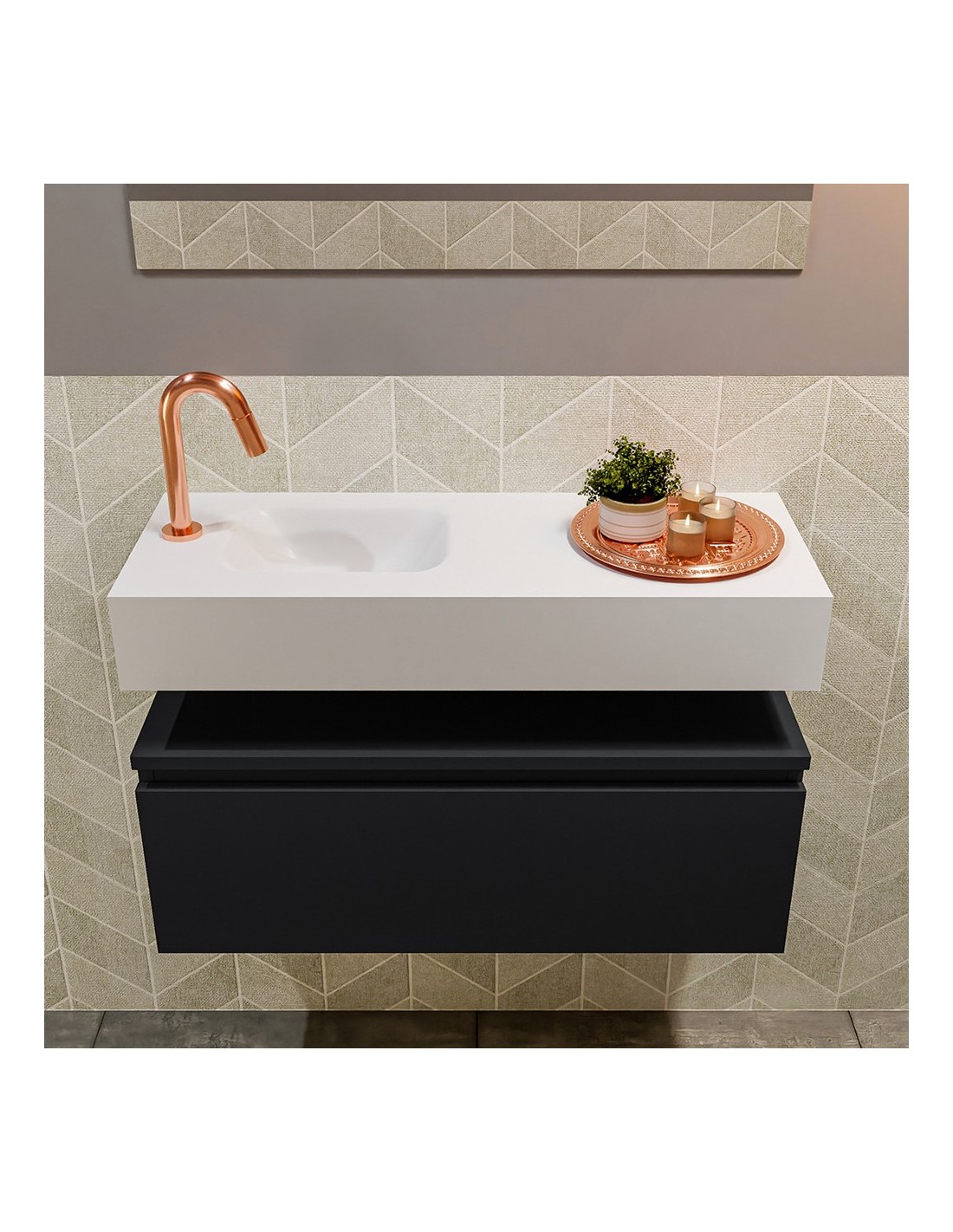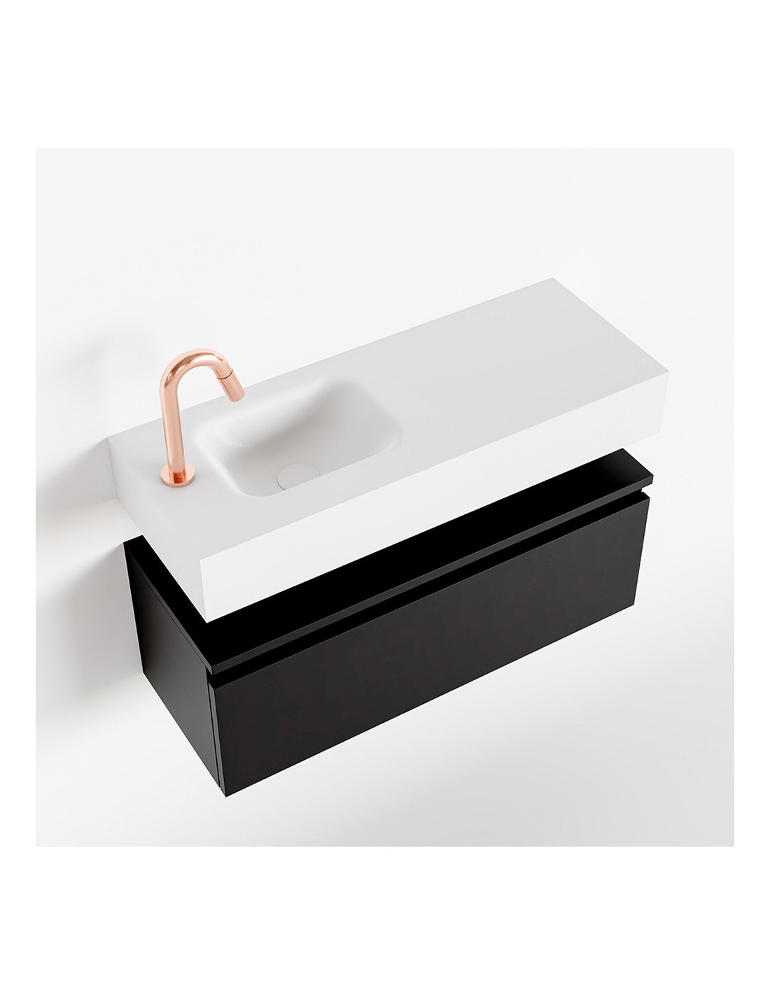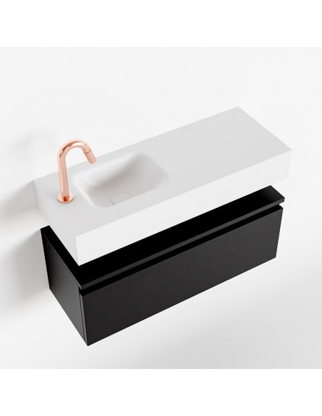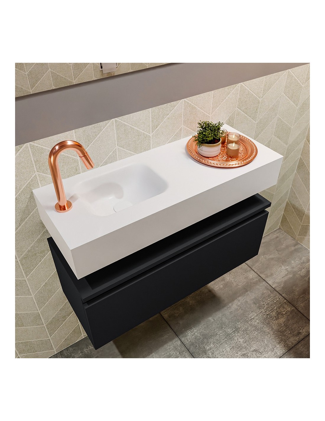 ANDOR Komplet badmiljø med venstrevendt håndvask til bordmonteret armatur. Badmiljøet kommer med 1 skuffe med fuldt udtræk, og er fremstillet i MDF. Håndvasken er fremstillet i talkumsfarvet (mat hvid) solid surface. Badmiljøet måler 80 cm i bredden. Det viste armatur medfølger ikke i sættet.