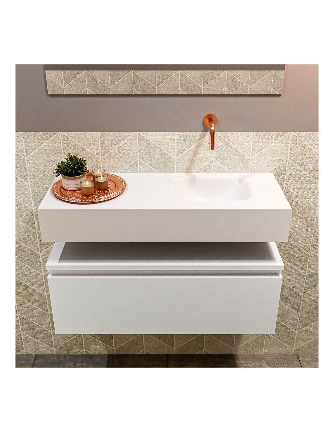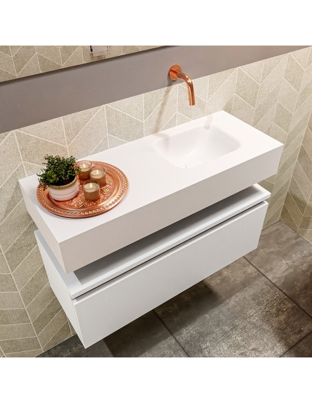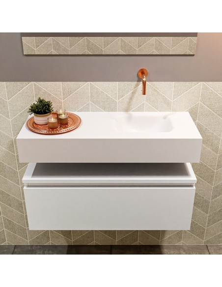 ANDOR Komplet badmiljø med højrevendt håndvask til vægmonteret armatur. Badmiljøet kommer med 1 skuffe med fuldt udtræk, og er fremstillet i MDF. Håndvasken er fremstillet i talkumsfarvet (mat hvid) solid surface. Badmiljøet måler 80 cm i bredden. Det viste armatur medfølger ikke i sættet.