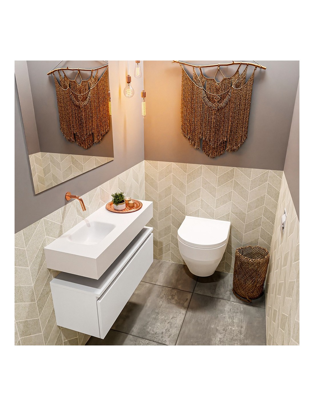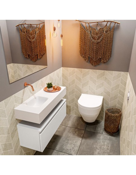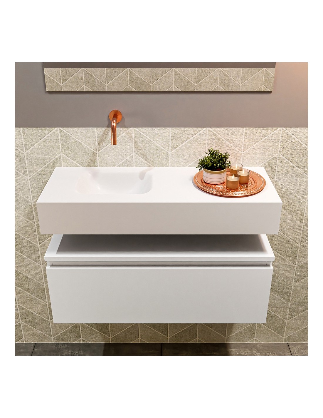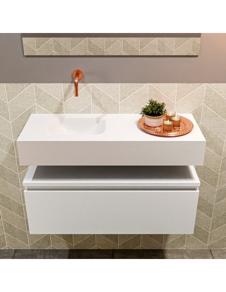 ANDOR Komplet badmiljø med venstrevendt håndvask til vægmonteret armatur. Badmiljøet kommer med 1 skuffe med fuldt udtræk, og er fremstillet i MDF. Håndvasken er fremstillet i talkumsfarvet (mat hvid) solid surface. Badmiljøet måler 80 cm i bredden. Det viste armatur medfølger ikke i sættet.