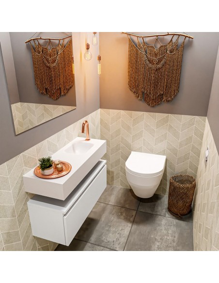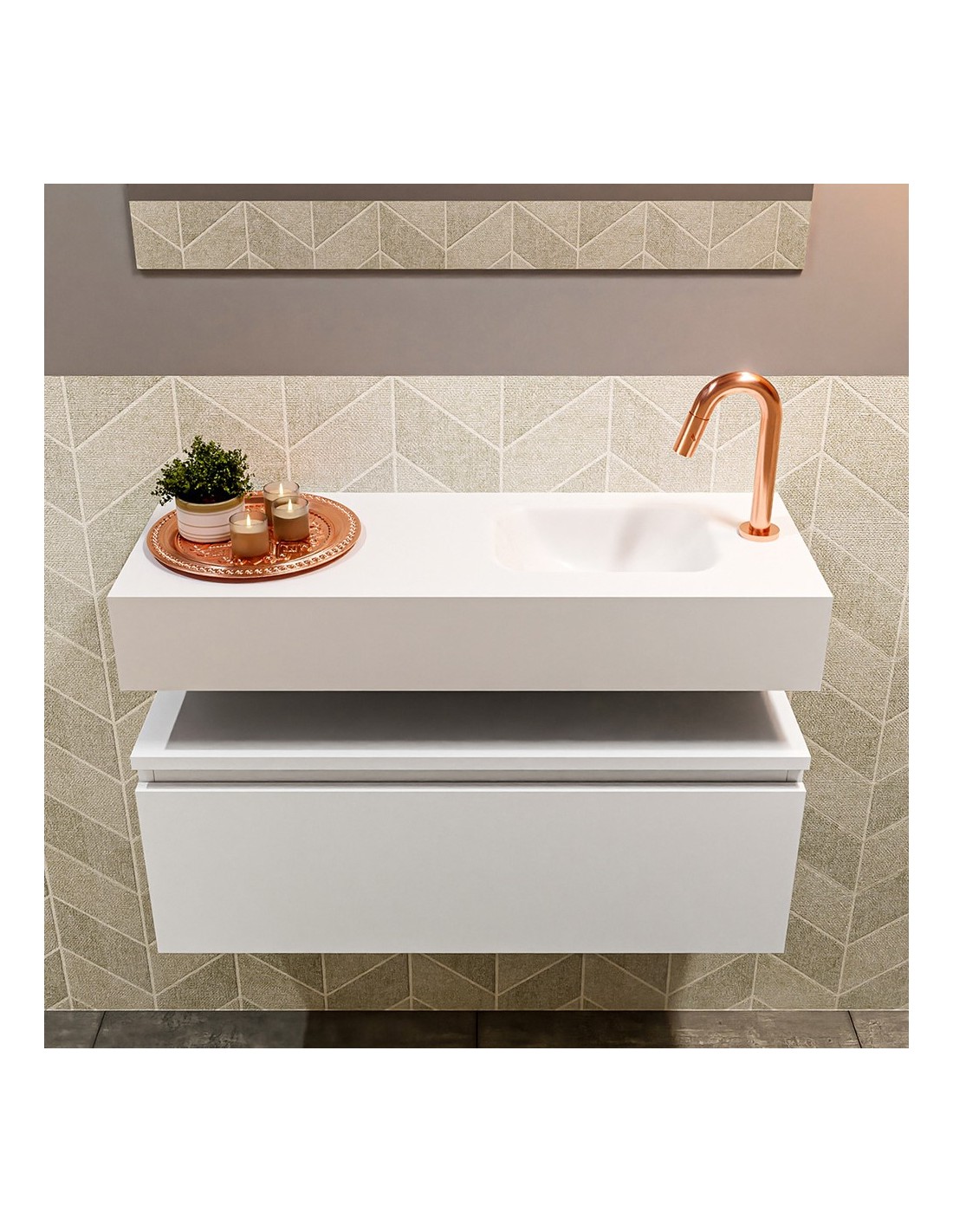 ANDOR Komplet badmiljø med højrevendt håndvask til bordmonteret armatur. Badmiljøet kommer med 1 skuffe med fuldt udtræk, og er fremstillet i MDF. Håndvasken er fremstillet i talkumsfarvet (mat hvid) solid surface. Badmiljøet måler 80 cm i bredden. Det viste armatur medfølger ikke i sættet.