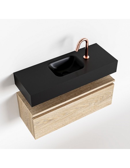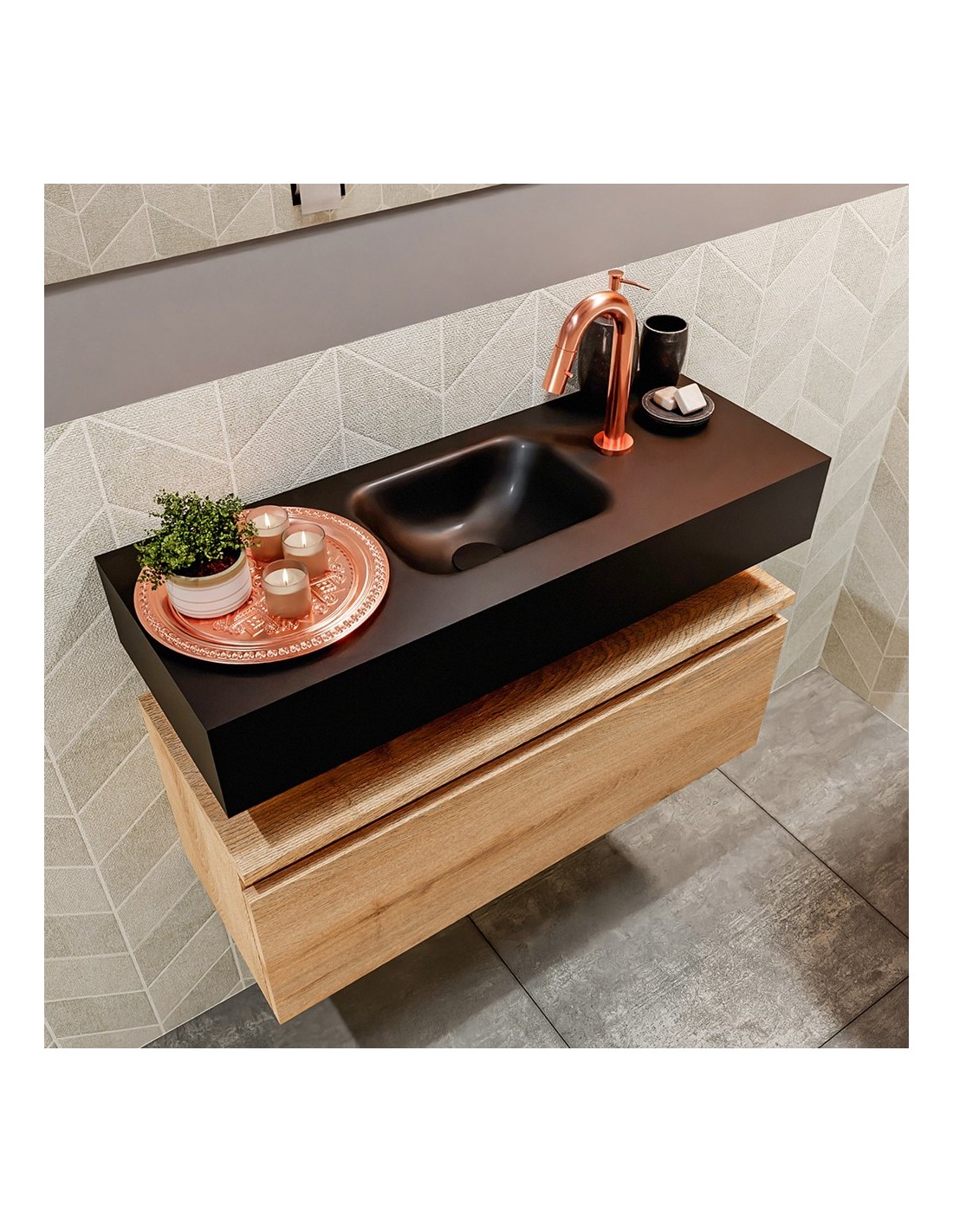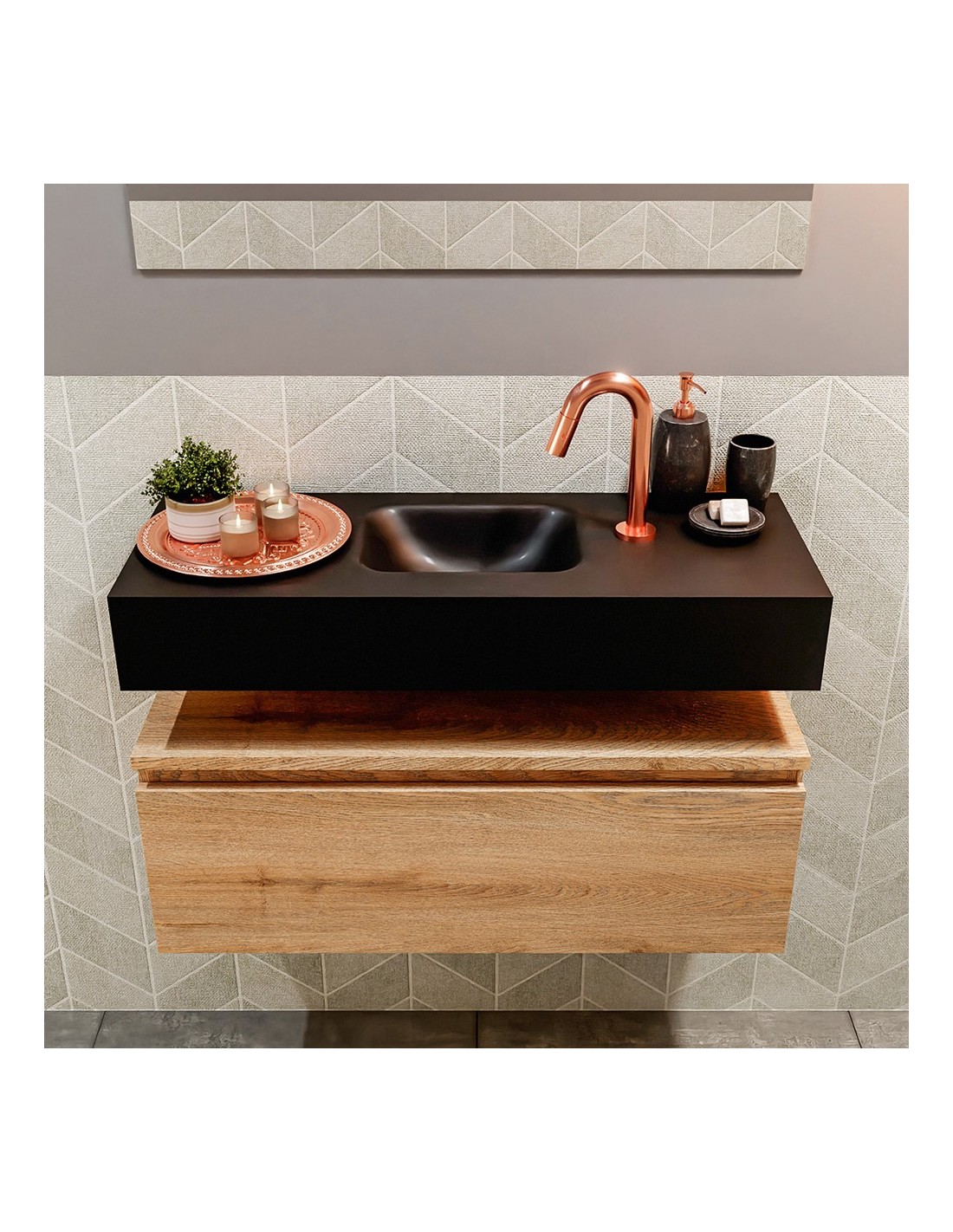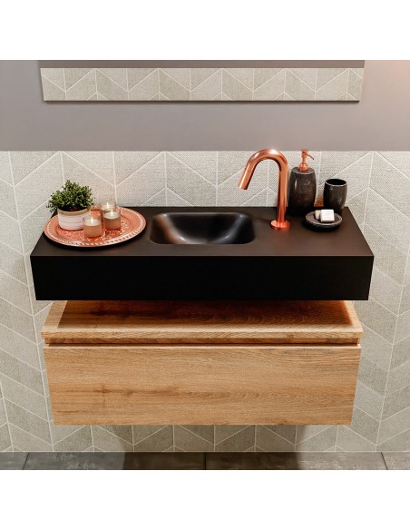 ANDOR Komplet badmiljø med midt centreret håndvask til bordmonteret armatur. Badmiljøet kommer med 1 skuffe med fuldt udtræk, og er fremstillet i MDF med design af vasket eg. Håndvasken er fremstillet i sort solid surface. Badmiljøet måler 80 cm i bredden. Det viste armatur medfølger ikke i sættet.