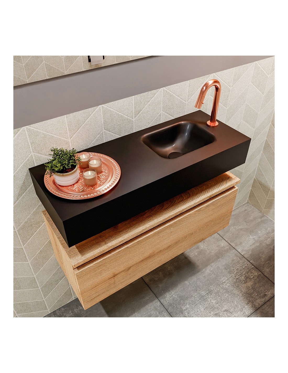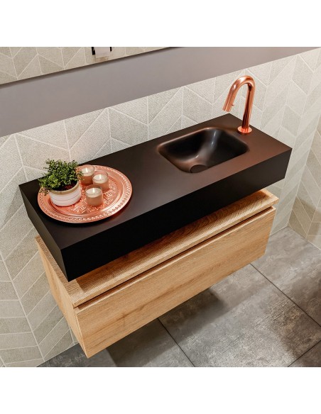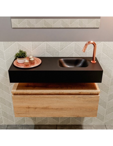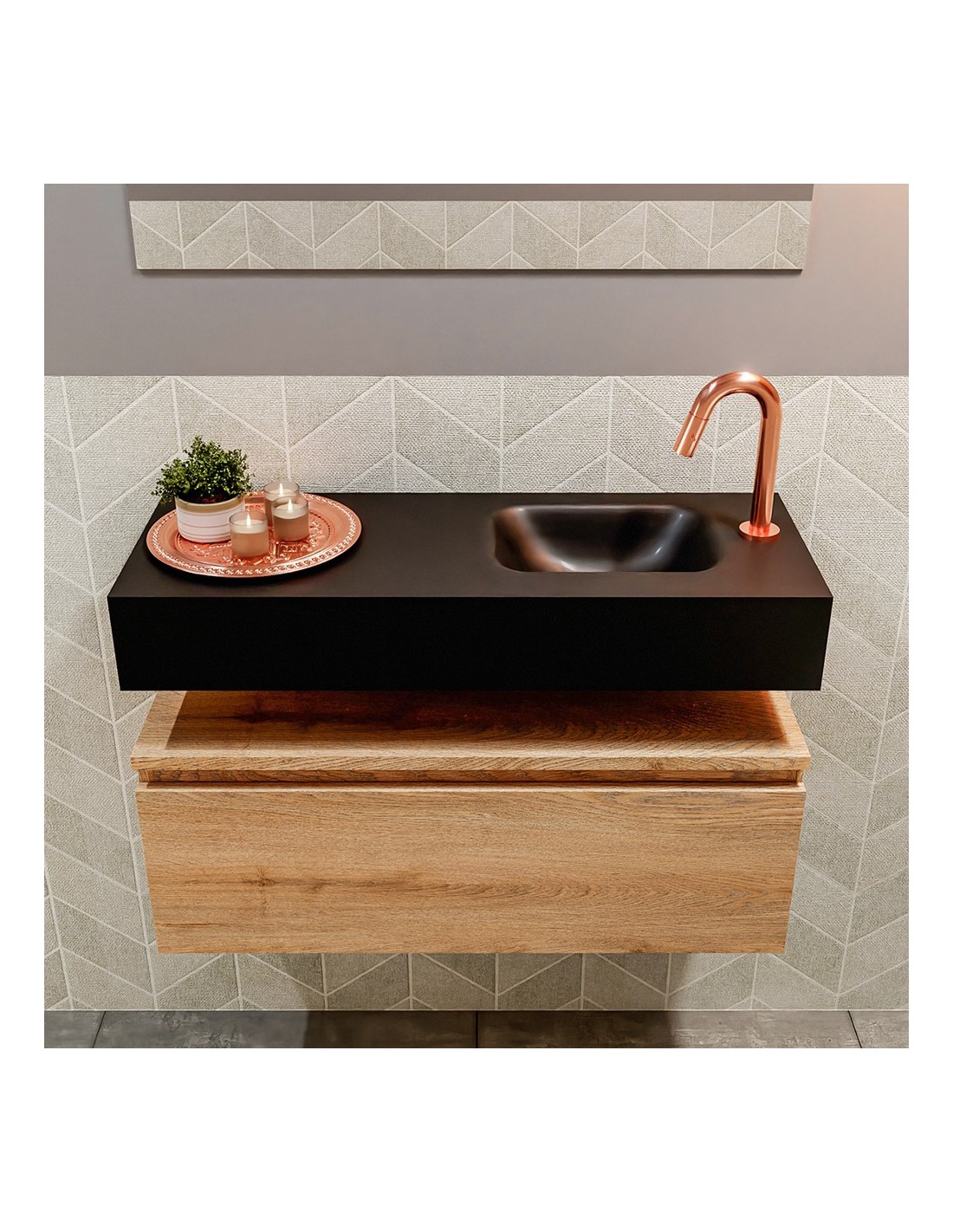 ANDOR Komplet badmiljø med højrevendt håndvask til bordmonteret armatur. Badmiljøet kommer med 1 skuffe med fuldt udtræk, og er fremstillet i MDF med design af vasket eg. Håndvasken er fremstillet i sort solid surface. Badmiljøet måler 80 cm i bredden. Det viste armatur medfølger ikke i sættet.