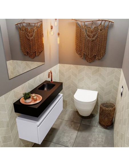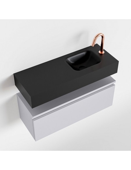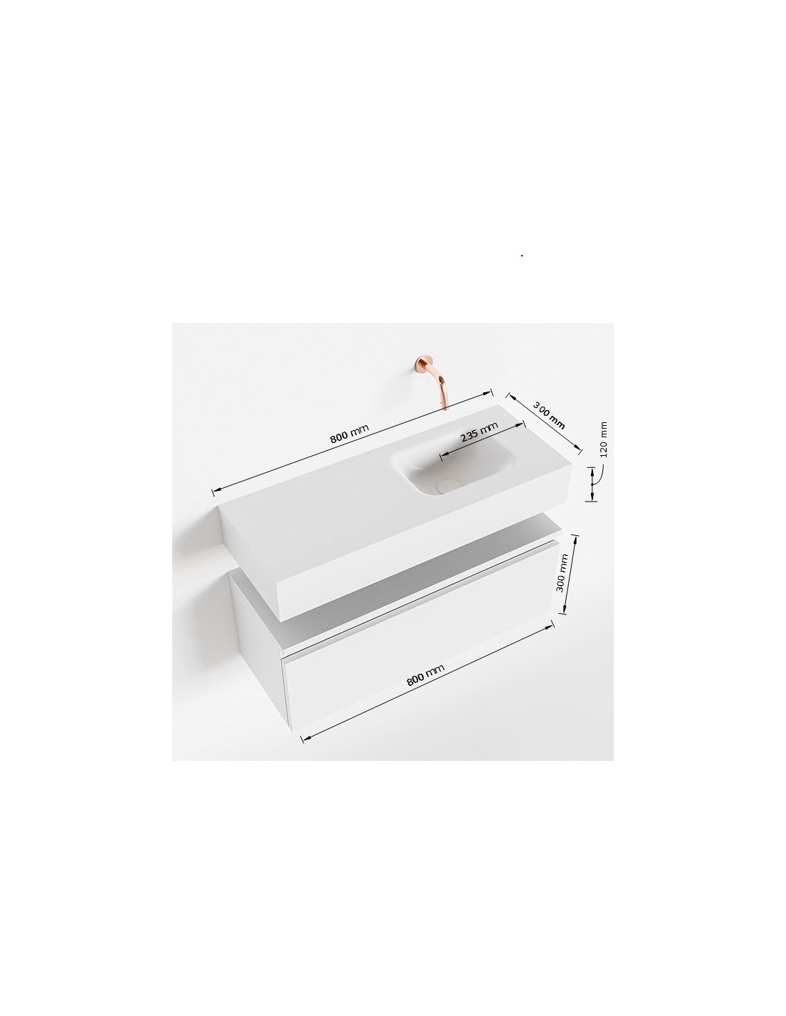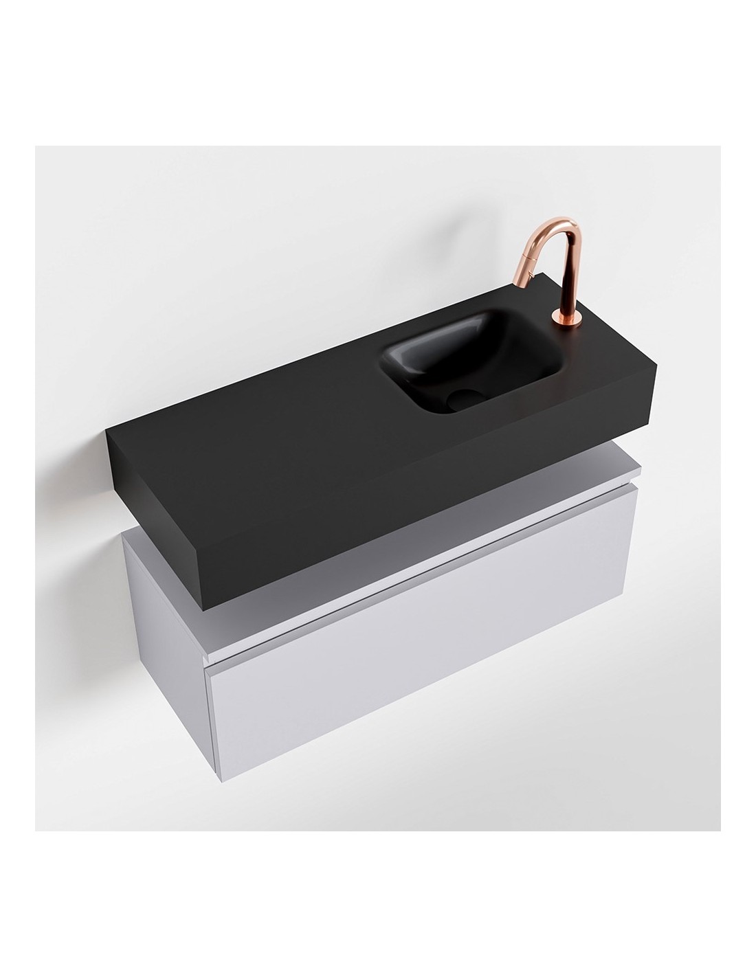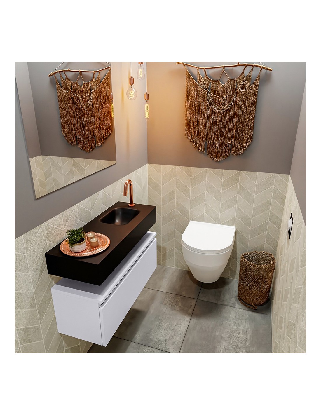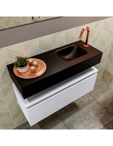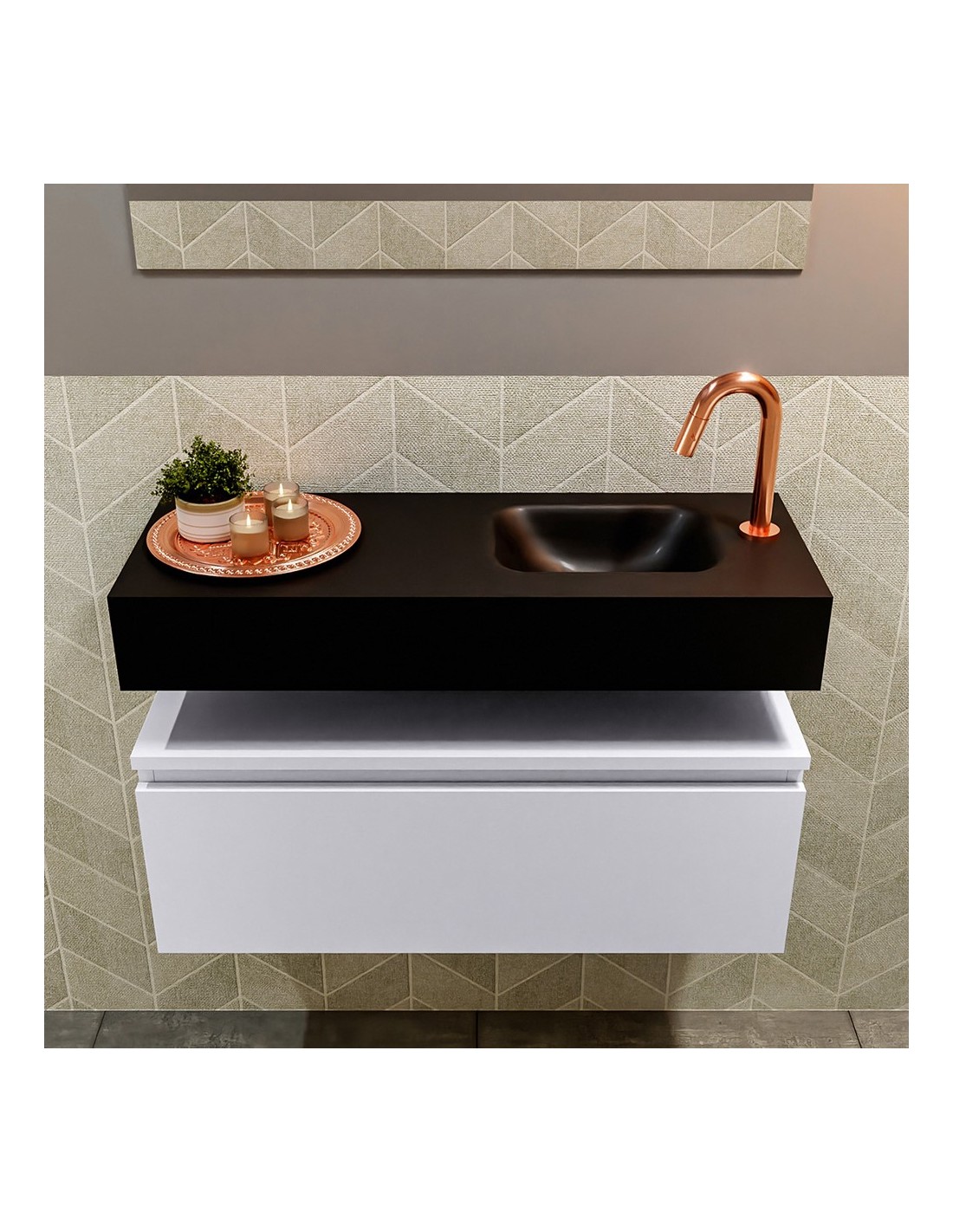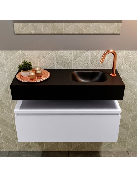 ANDOR Komplet badmiljø med højrevendt håndvask til bordmonteret armatur. Badmiljøet kommer med 1 skuffe med fuldt udtræk, og er fremstillet i MDF. Håndvasken er fremstillet i sort solid surface. Badmiljøet måler 80 cm i bredden. Det viste armatur medfølger ikke i sættet.