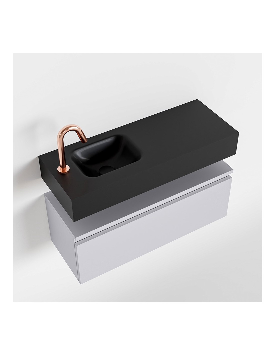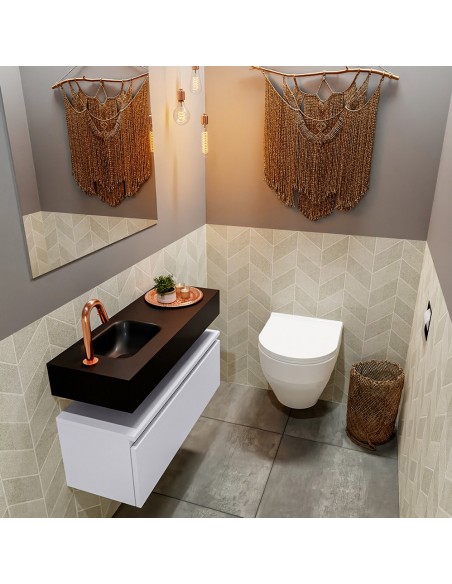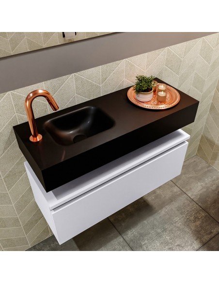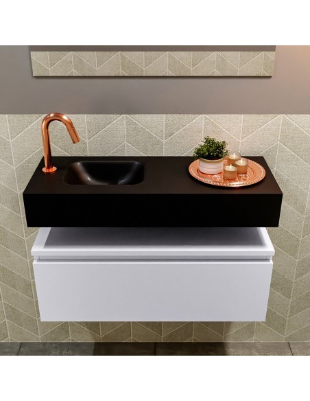 ANDOR Komplet badmiljø med venstrevendt håndvask til bordmonteret armatur. Badmiljøet kommer med 1 skuffe med fuldt udtræk, og er fremstillet i MDF. Håndvasken er fremstillet i sort solid surface. Badmiljøet måler 80 cm i bredden. Det viste armatur medfølger ikke i sættet.
