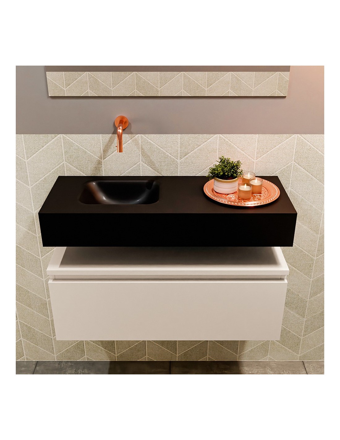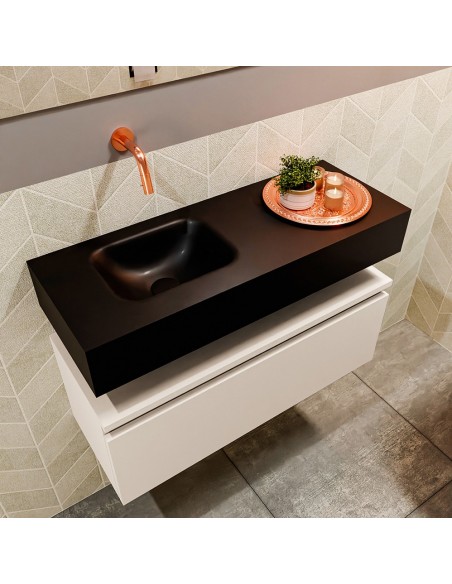 ANDOR Komplet badmiljø med venstrevendt håndvask til vægmonteret armatur. Badmiljøet kommer med 1 skuffe med fuldt udtræk, og er fremstillet i MDF. Håndvasken er fremstillet i sort solid surface. Badmiljøet måler 80 cm i bredden. Det viste armatur medfølger ikke i sættet.