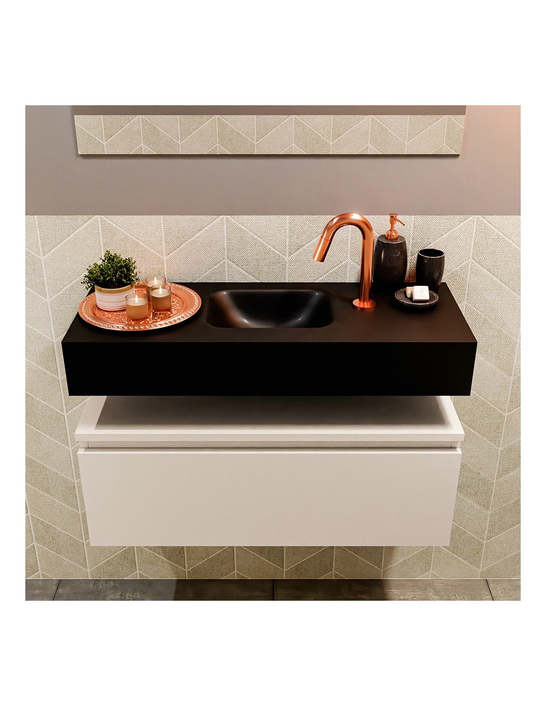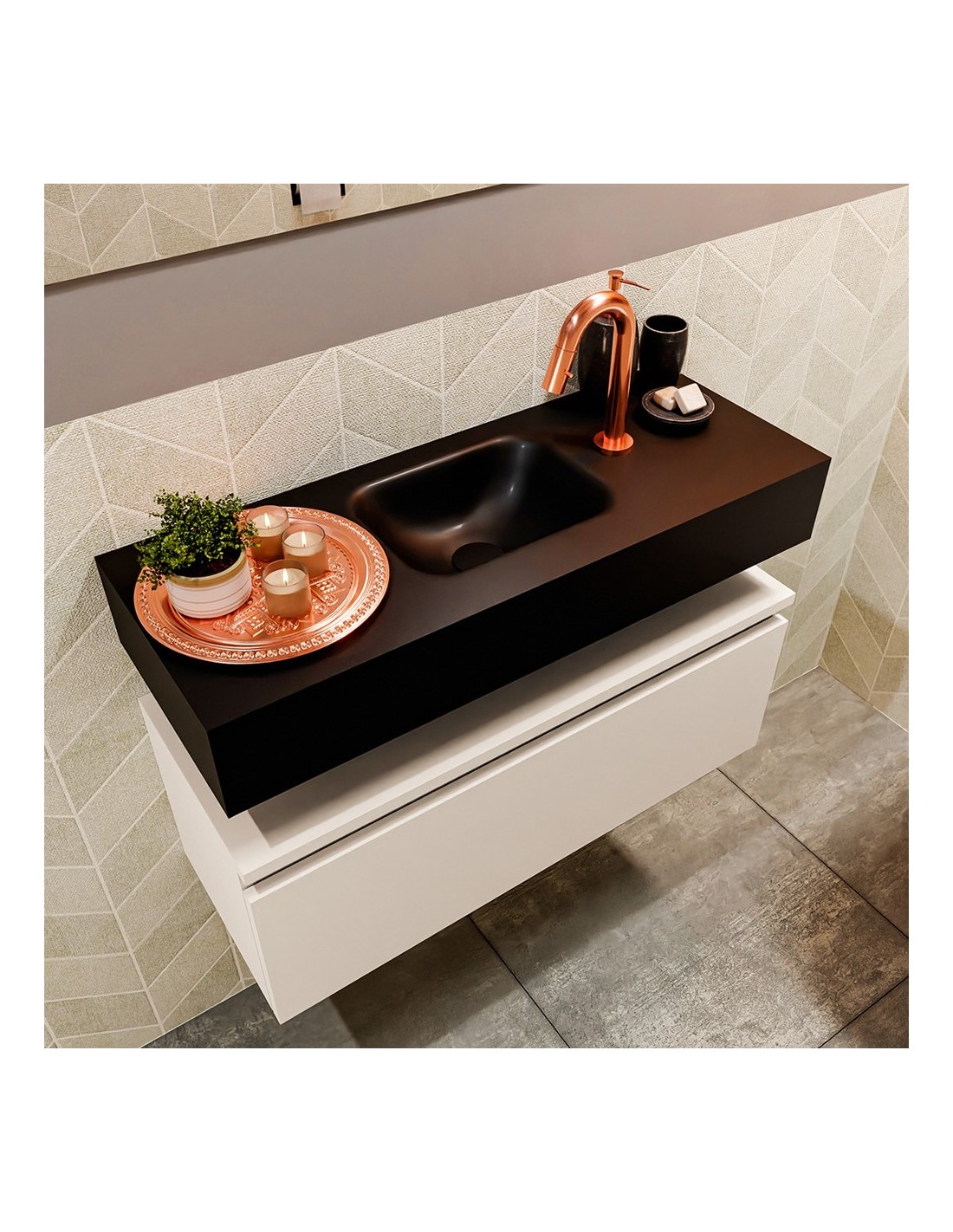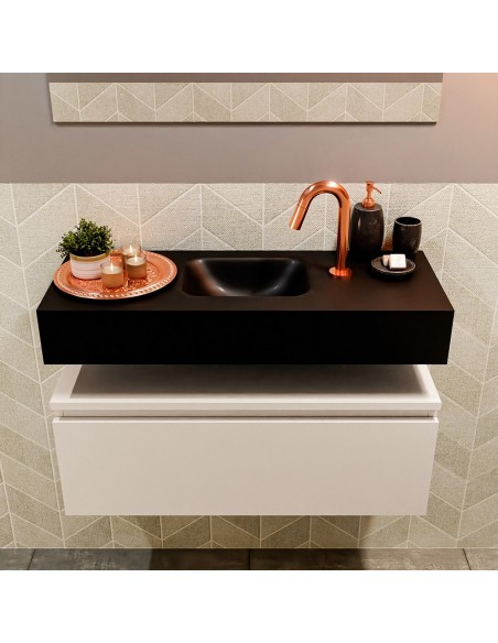 ANDOR Komplet badmiljø med midt centreret håndvask til bordmonteret armatur. Badmiljøet kommer med 1 skuffe med fuldt udtræk, og er fremstillet i MDF. Håndvasken er fremstillet i sort solid surface. Badmiljøet måler 80 cm i bredden. Det viste armatur medfølger ikke i sættet.