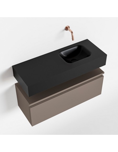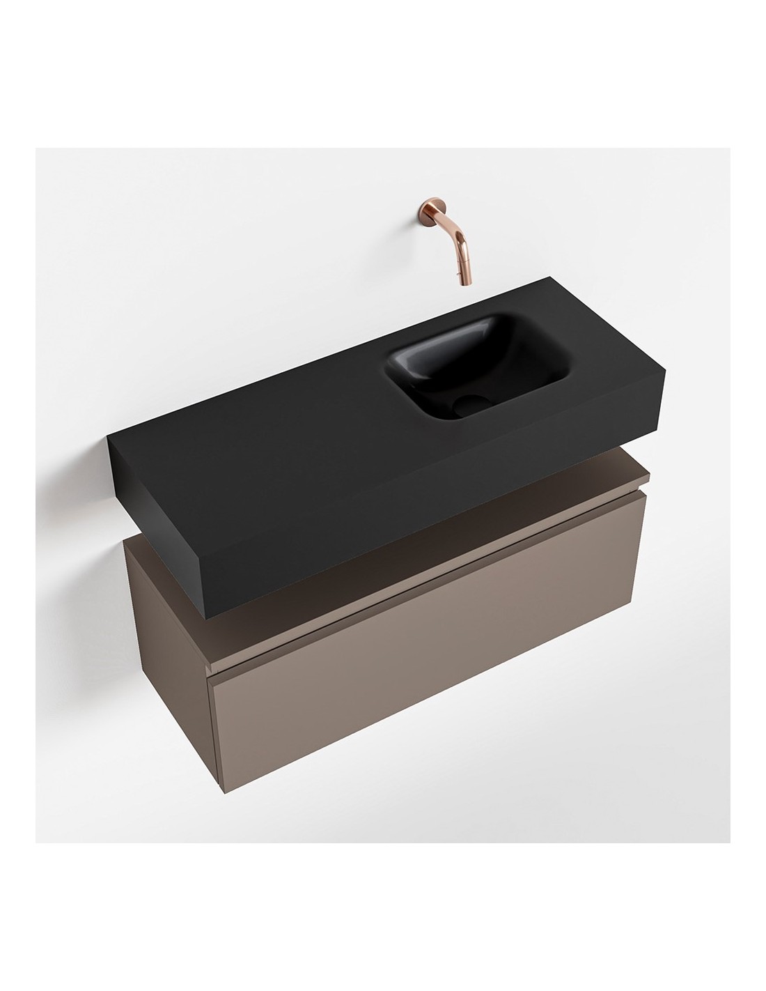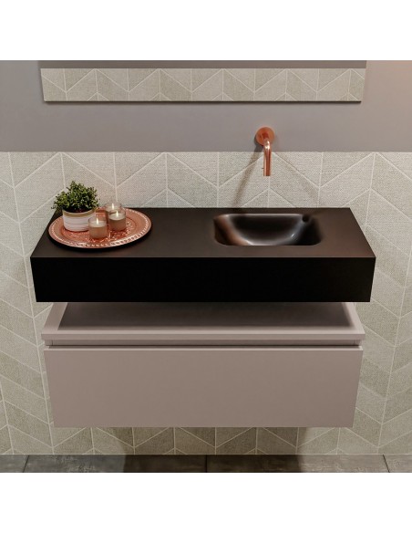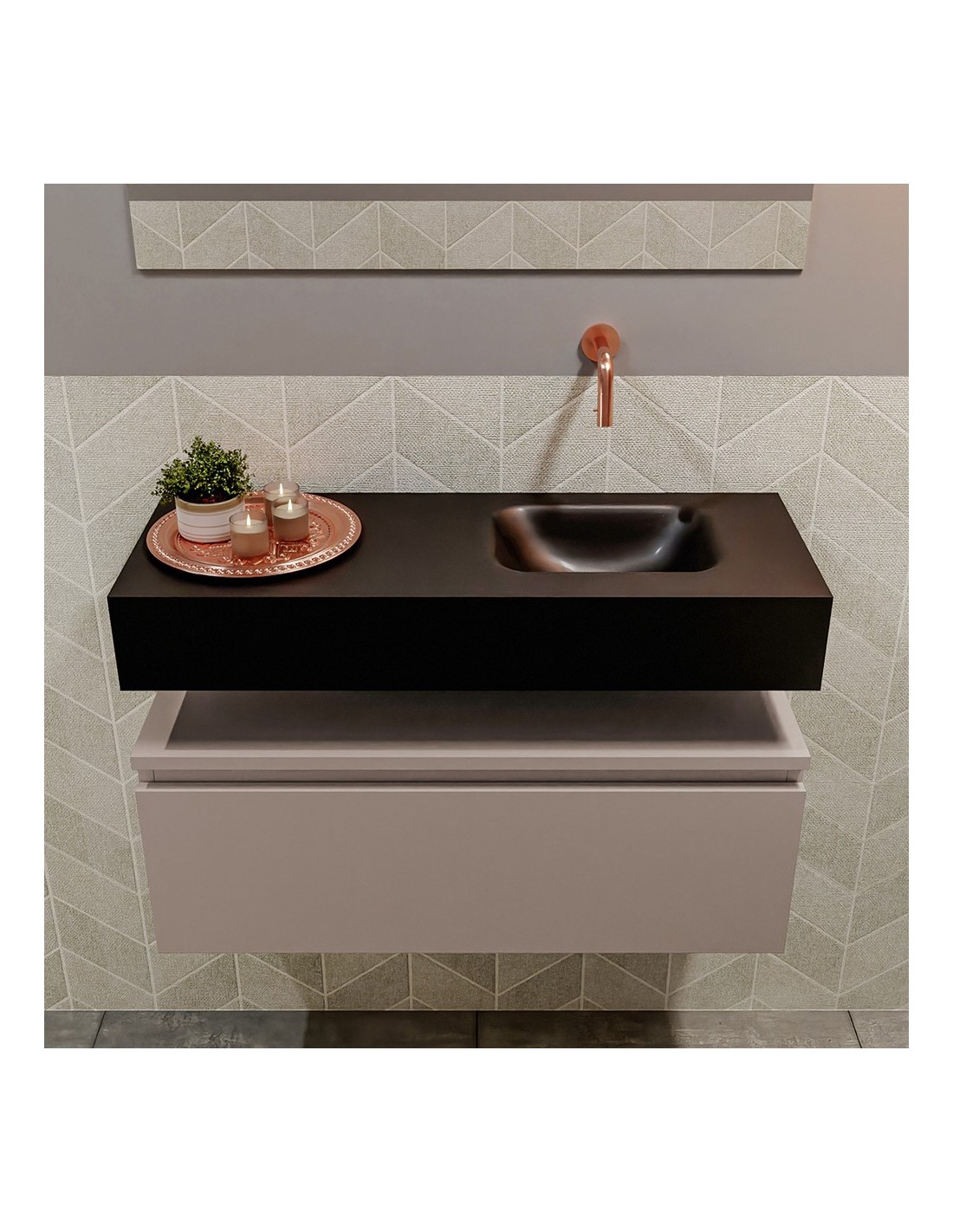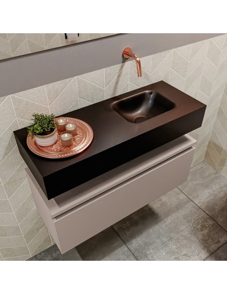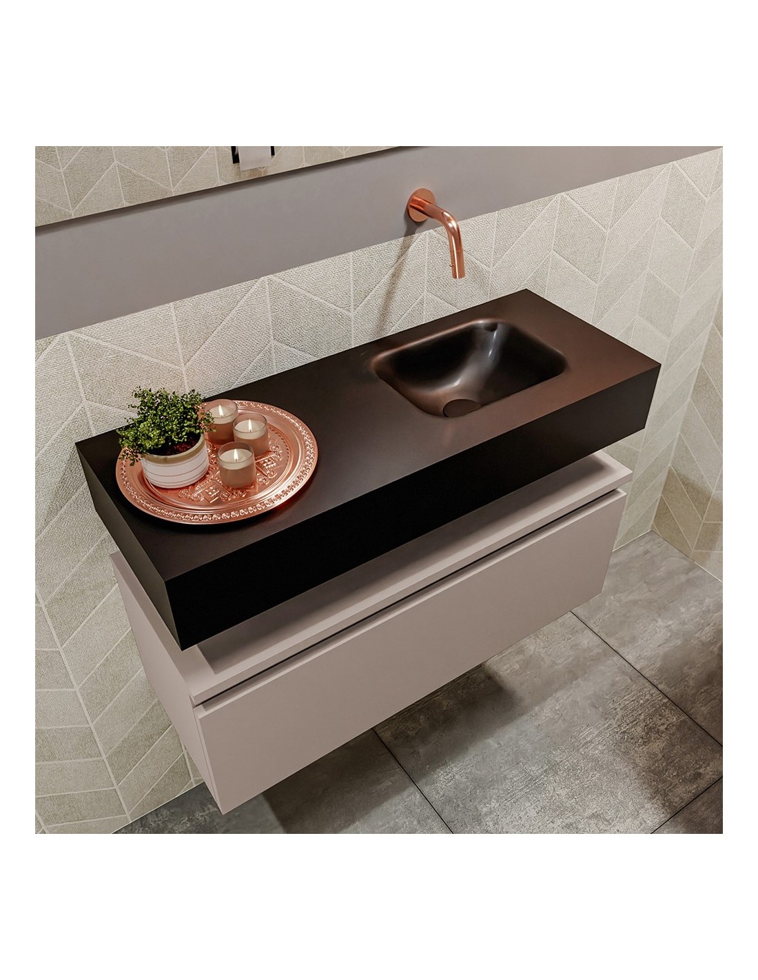 ANDOR Komplet badmiljø med højrevendt håndvask til vægmonteret armatur. Badmiljøet kommer med 1 skuffe med fuldt udtræk, og er fremstillet i MDF. Håndvasken er fremstillet i sort solid surface. Badmiljøet måler 80 cm i bredden. Det viste armatur medfølger ikke i sættet.