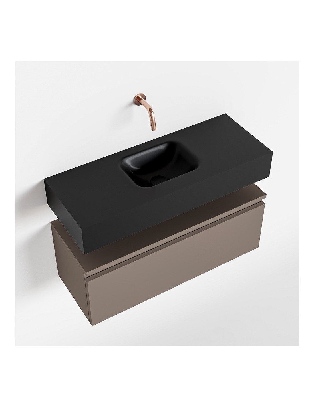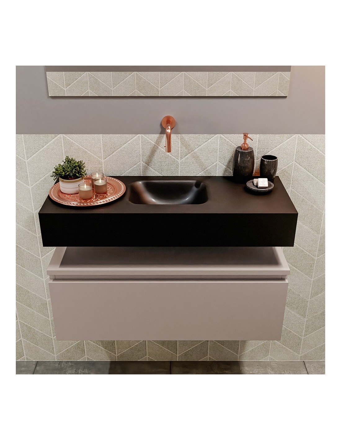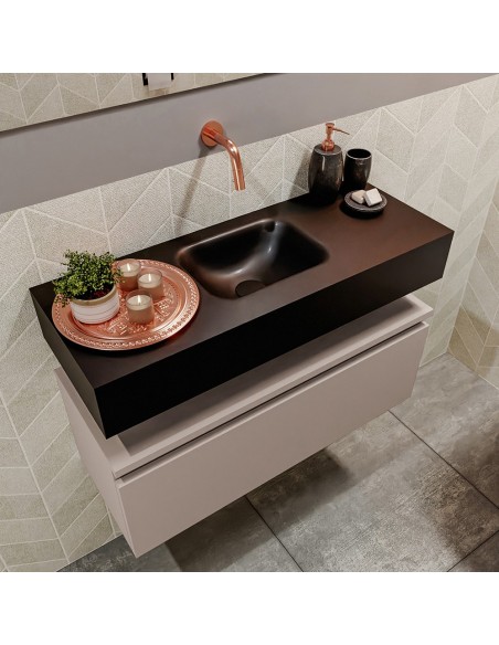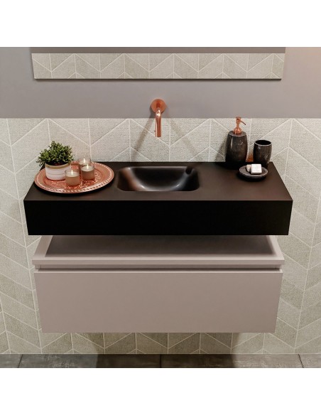 ANDOR Komplet badmiljø med midt centreret håndvask til vægmonteret armatur. Badmiljøet kommer med 1 skuffe med fuldt udtræk, og er fremstillet i MDF. Håndvasken er fremstillet i sort solid surface. Badmiljøet måler 80 cm i bredden. Det viste armatur medfølger ikke i sættet.