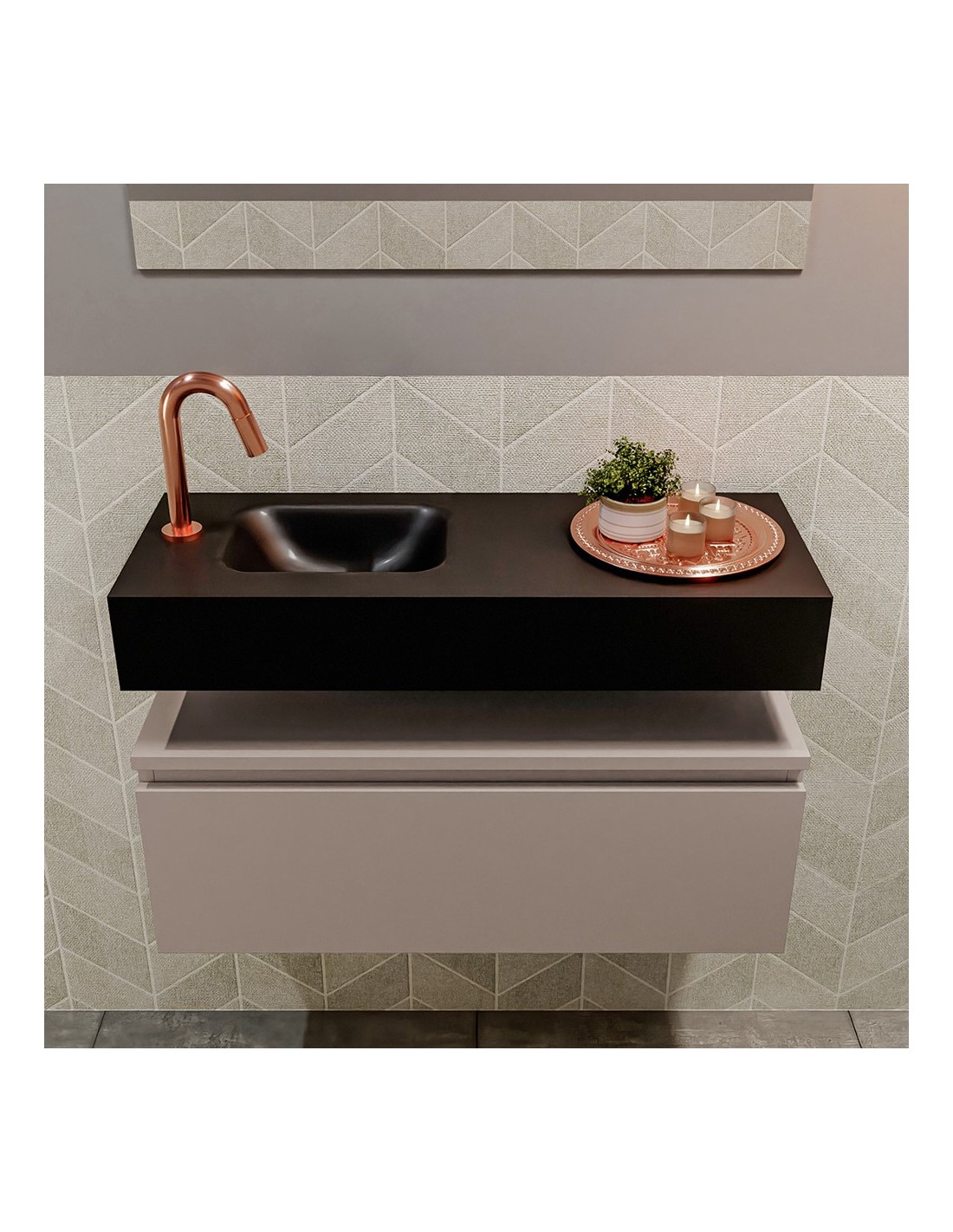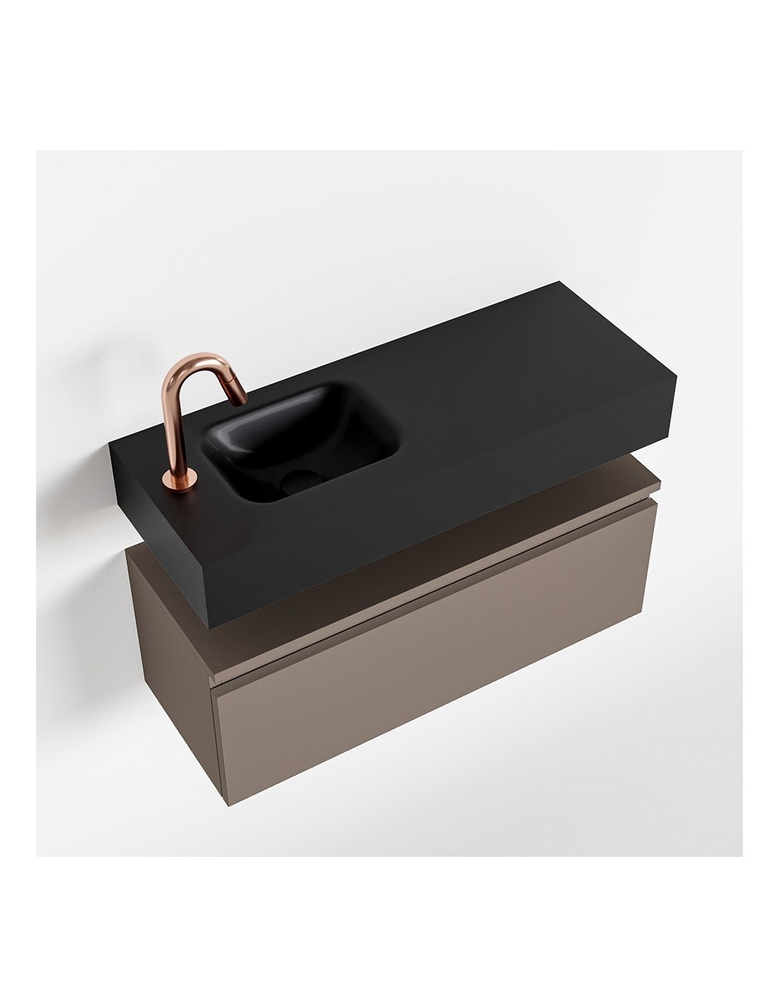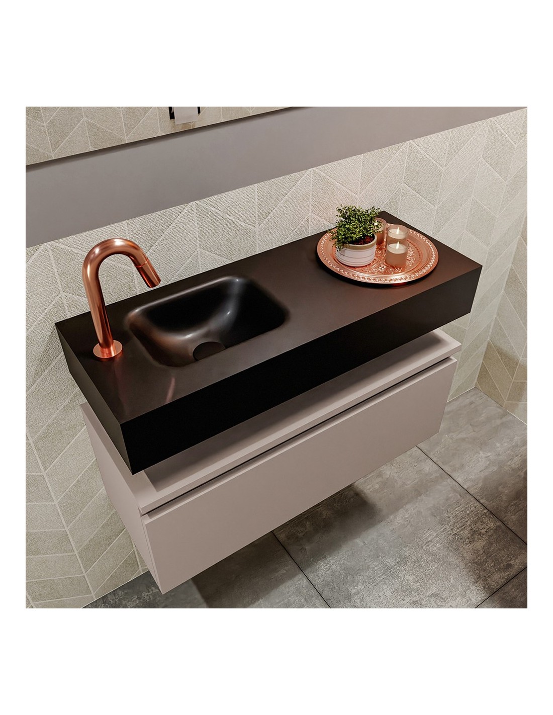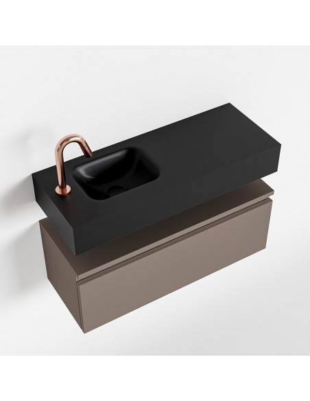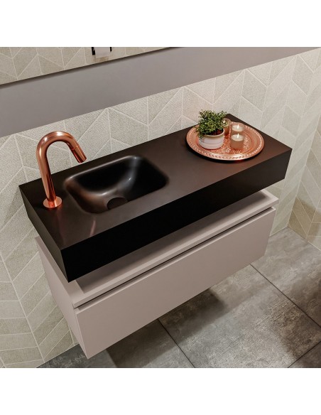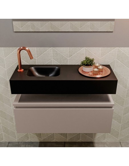 ANDOR Komplet badmiljø med venstrevendt håndvask til bordmonteret armatur. Badmiljøet kommer med 1 skuffe med fuldt udtræk, og er fremstillet i MDF. Håndvasken er fremstillet i sort solid surface. Badmiljøet måler 80 cm i bredden. Det viste armatur medfølger ikke i sættet.