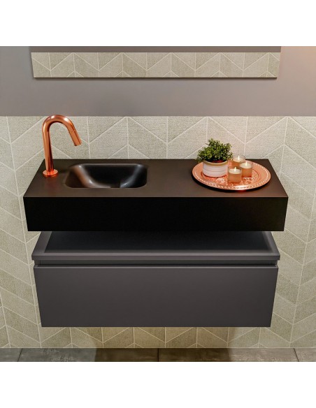 ANDOR Komplet badmiljø med venstrevendt håndvask til bordmonteret armatur. Badmiljøet kommer med 1 skuffe med fuldt udtræk, og er fremstillet i MDF. Håndvasken er fremstillet i sort solid surface. Badmiljøet måler 80 cm i bredden. Det viste armatur medfølger ikke i sættet.