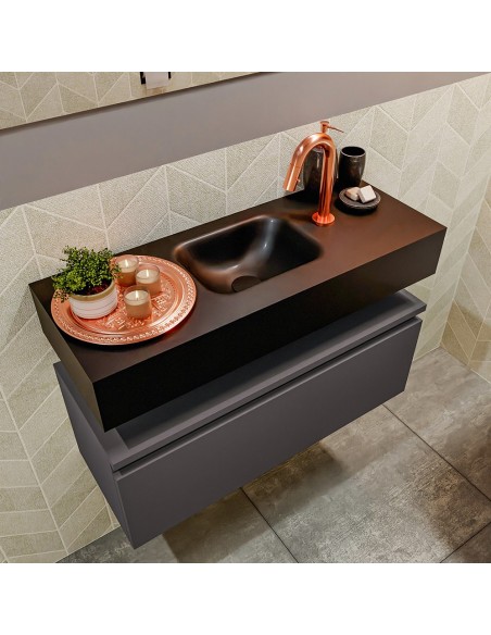 ANDOR Komplet badmiljø med midt centreret håndvask til bordmonteret armatur. Badmiljøet kommer med 1 skuffe med fuldt udtræk, og er fremstillet i MDF. Håndvasken er fremstillet i sort solid surface. Badmiljøet måler 80 cm i bredden. Det viste armatur medfølger ikke i sættet.