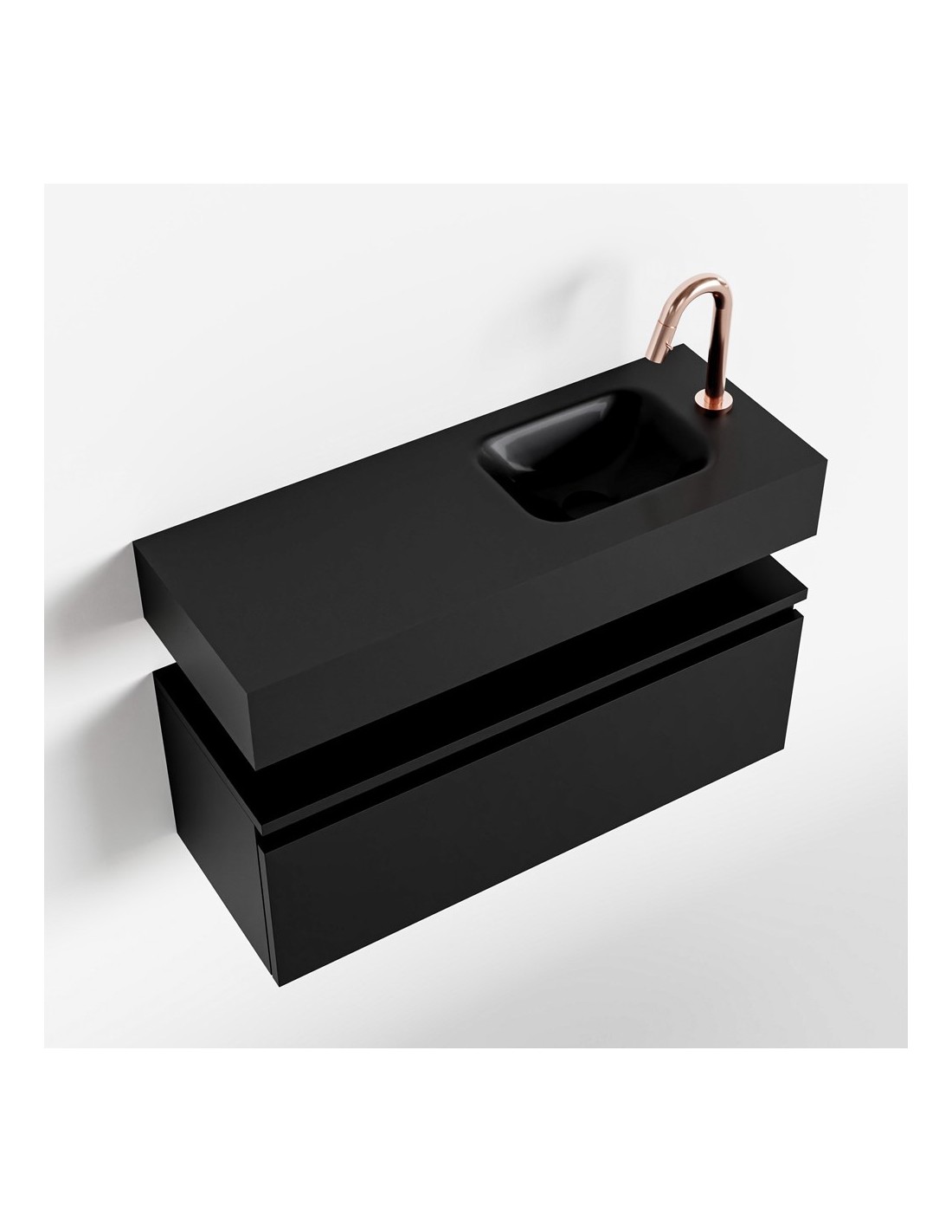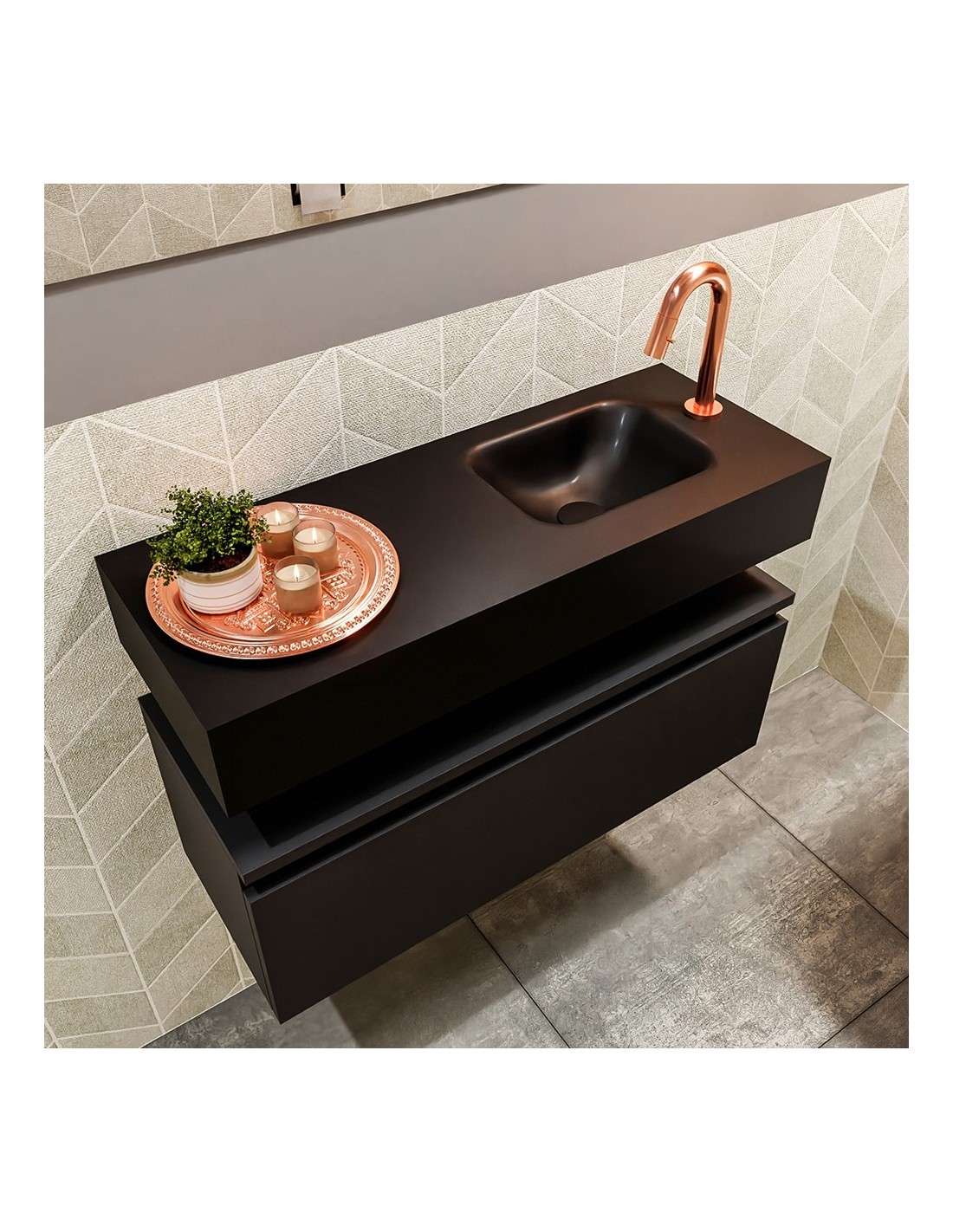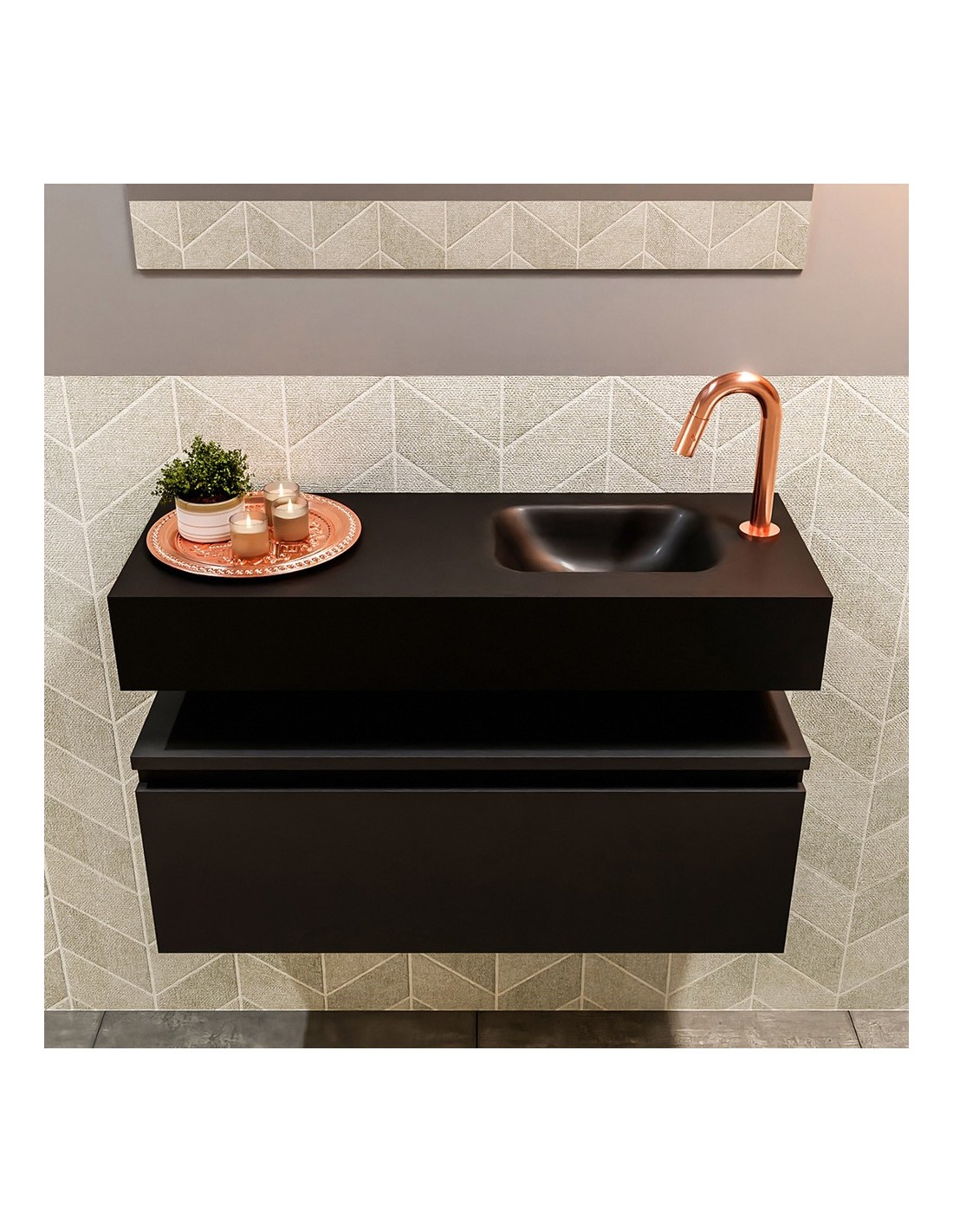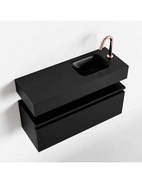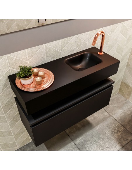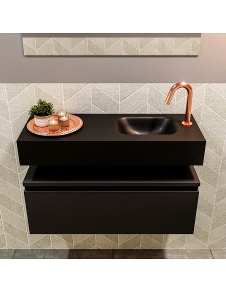 ANDOR Komplet badmiljø med højrevendt håndvask til bordmonteret armatur. Badmiljøet kommer med 1 skuffe med fuldt udtræk, og er fremstillet i MDF. Håndvasken er fremstillet i sort solid surface. Badmiljøet måler 80 cm i bredden. Det viste armatur medfølger ikke i sættet.