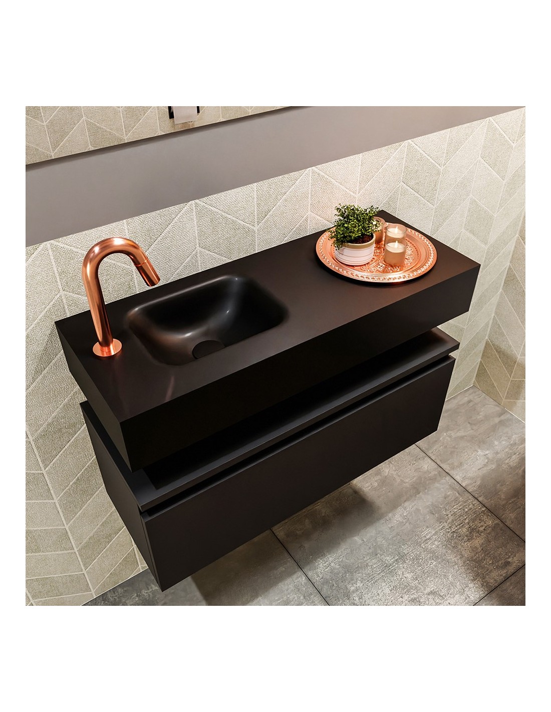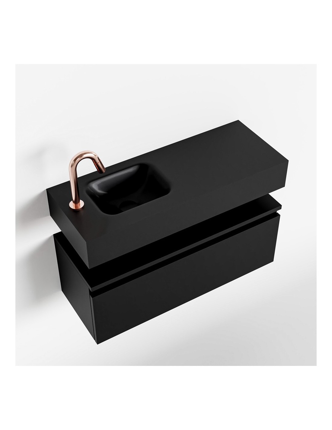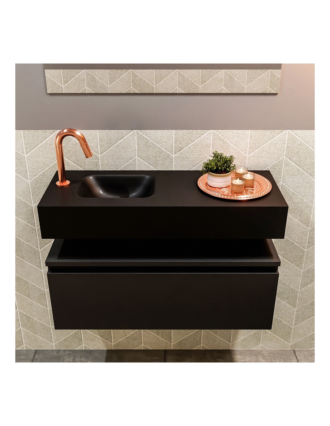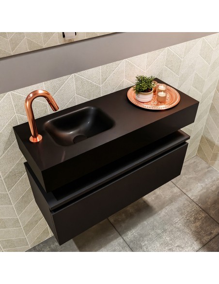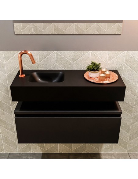 ANDOR Komplet badmiljø med venstrevendt håndvask til bordmonteret armatur. Badmiljøet kommer med 1 skuffe med fuldt udtræk, og er fremstillet i MDF. Håndvasken er fremstillet i sort solid surface. Badmiljøet måler 80 cm i bredden. Det viste armatur medfølger ikke i sættet.