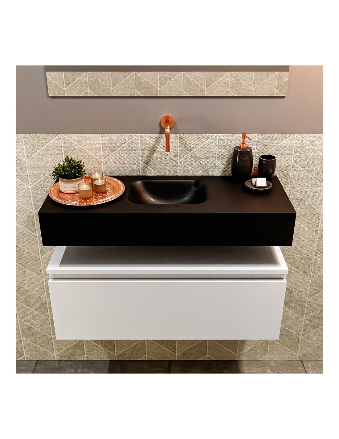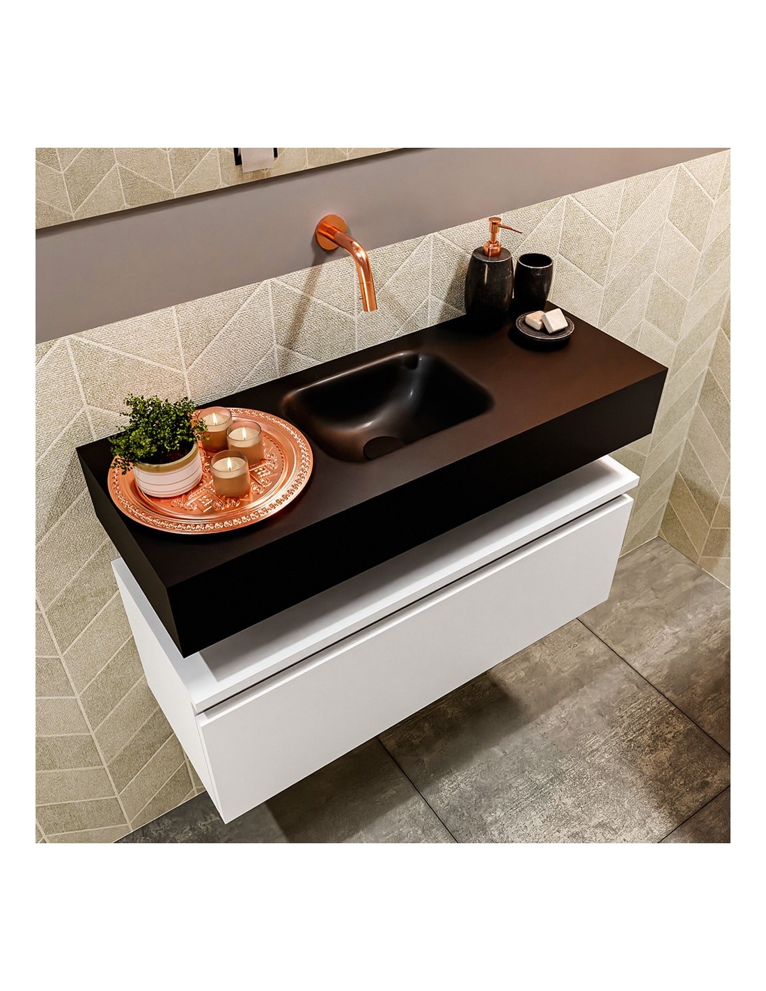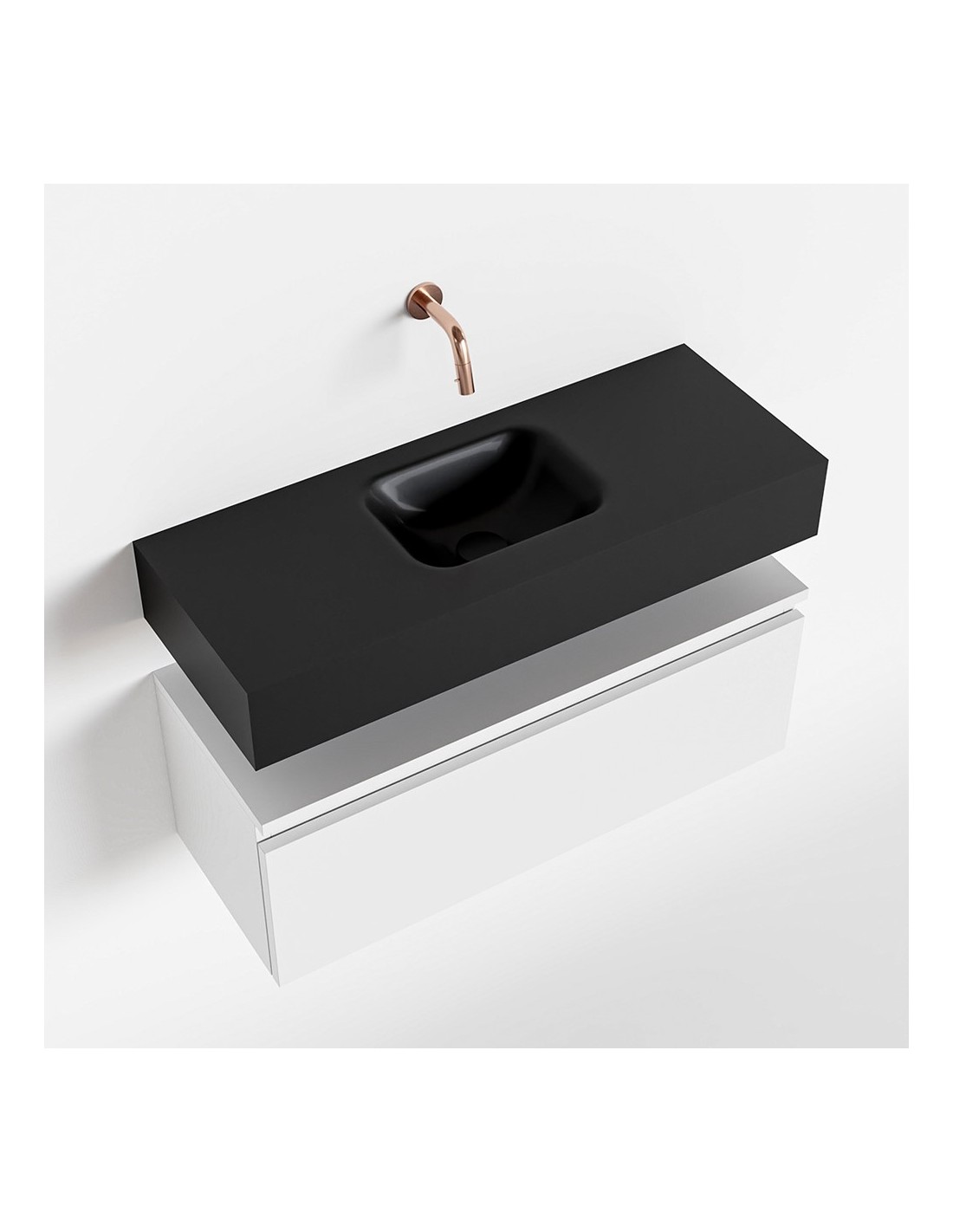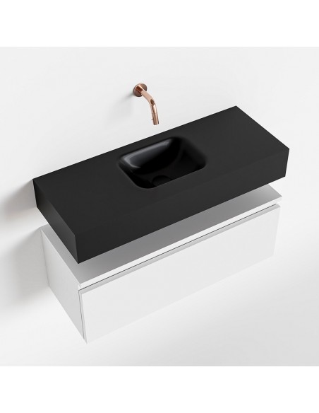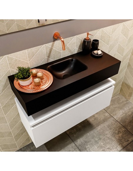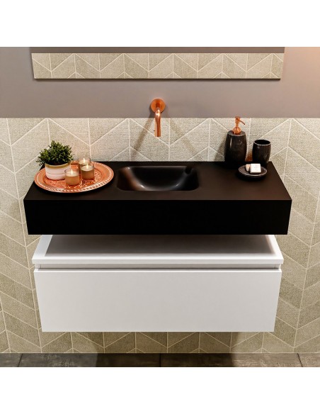 ANDOR Komplet badmiljø med midt centreret håndvask til vægmonteret armatur. Badmiljøet kommer med 1 skuffe med fuldt udtræk, og er fremstillet i MDF. Håndvasken er fremstillet i sort solid surface. Badmiljøet måler 80 cm i bredden. Det viste armatur medfølger ikke i sættet.