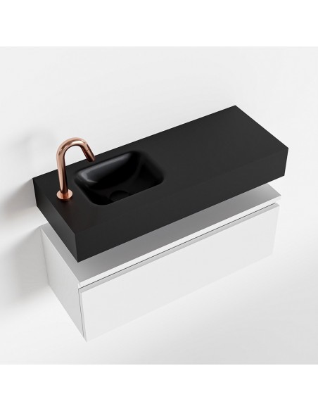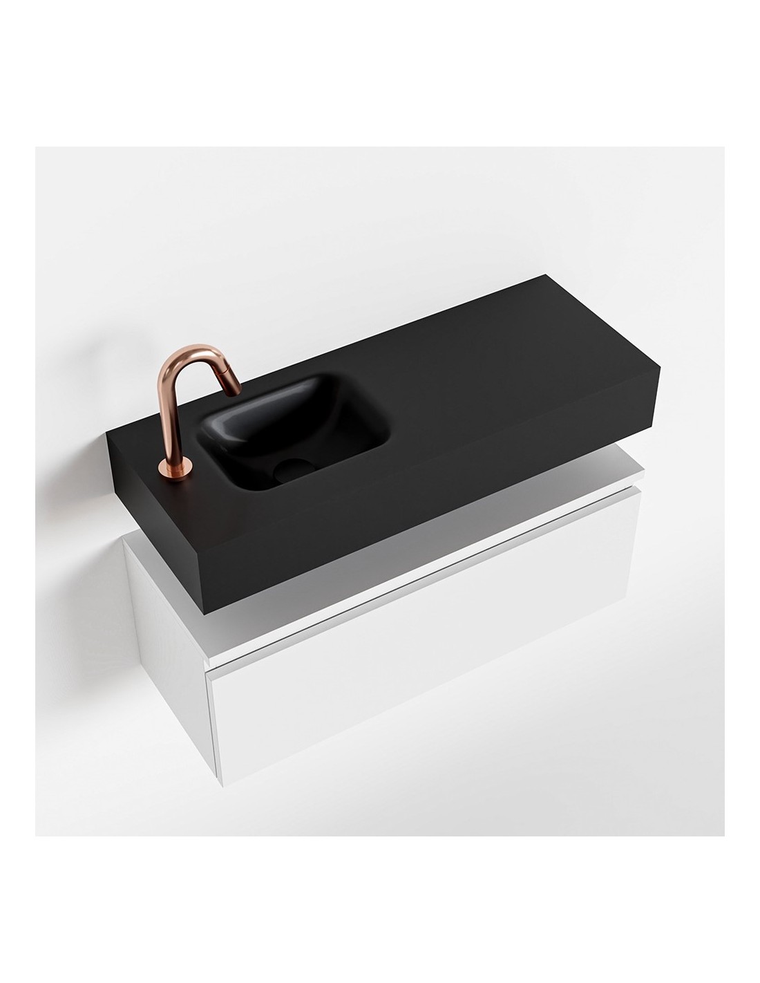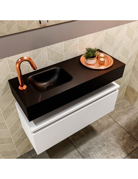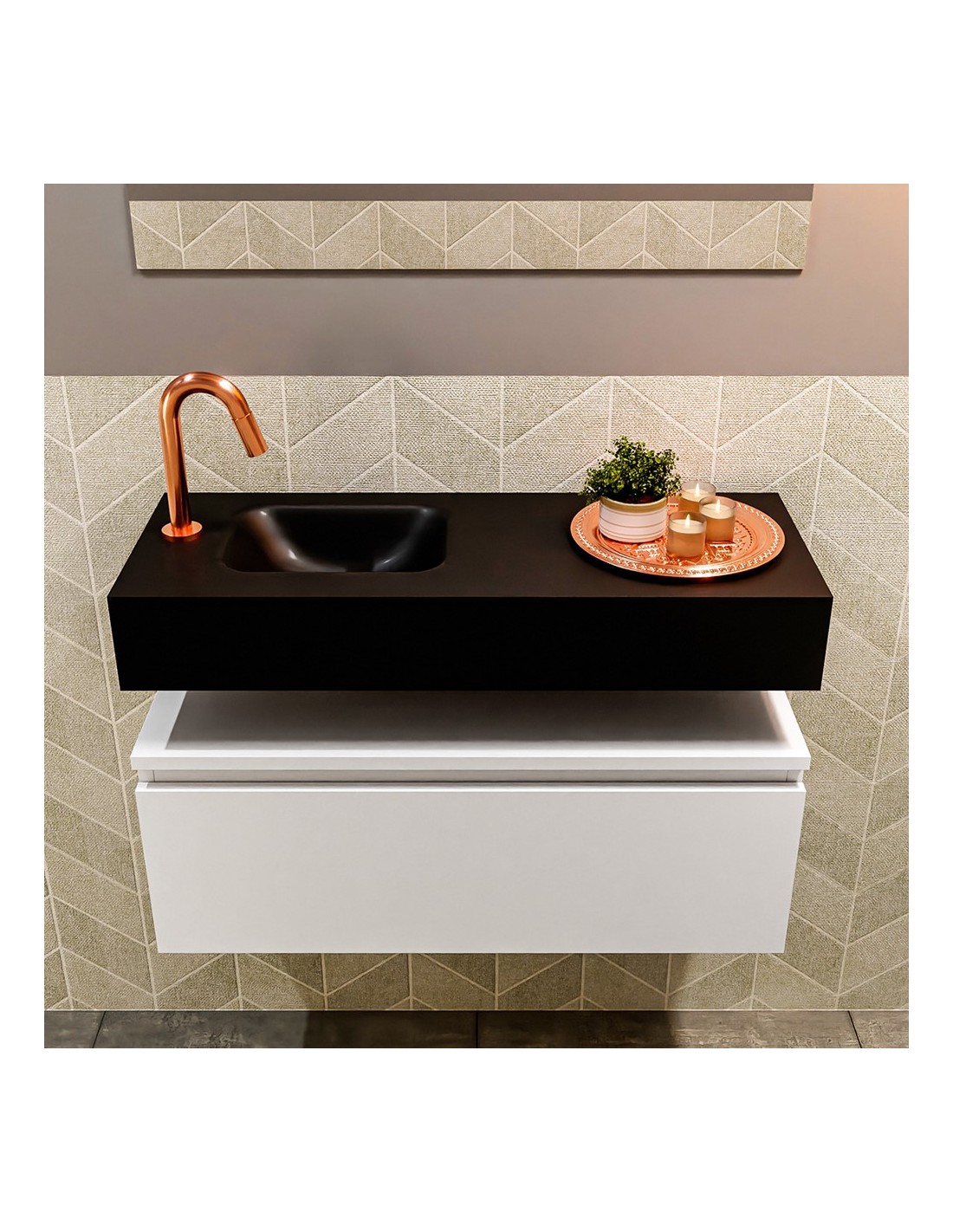 ANDOR Komplet badmiljø med venstrevendt håndvask til bordmonteret armatur. Badmiljøet kommer med 1 skuffe med fuldt udtræk, og er fremstillet i MDF. Håndvasken er fremstillet i sort solid surface. Badmiljøet måler 80 cm i bredden. Det viste armatur medfølger ikke i sættet.