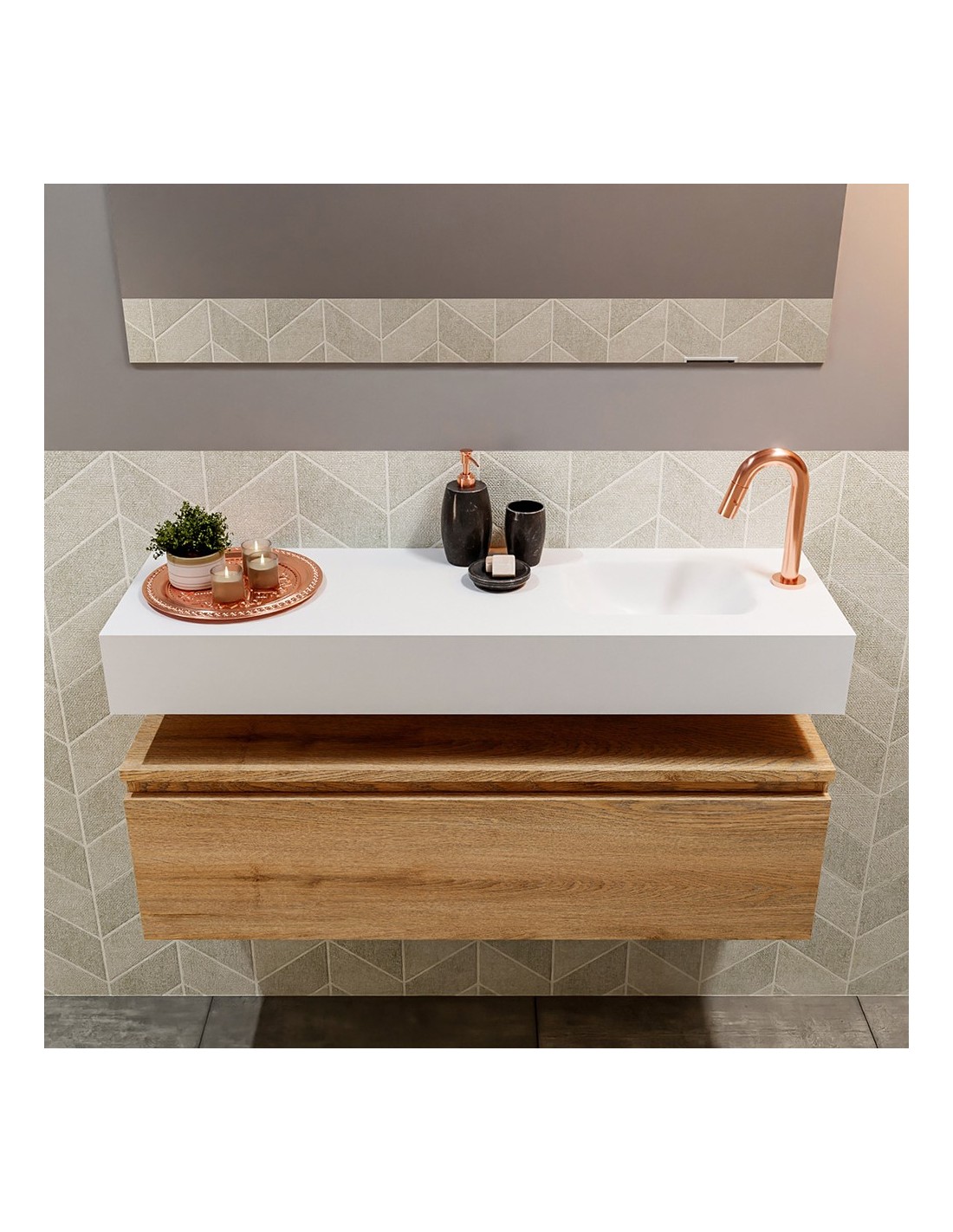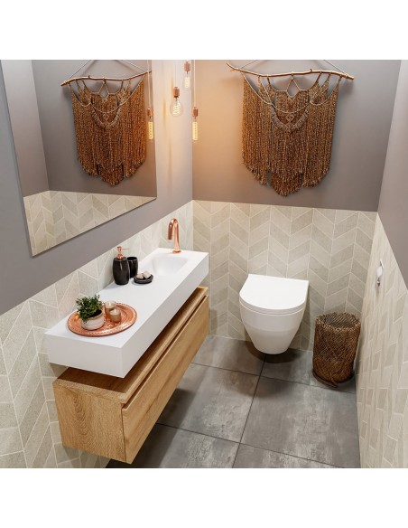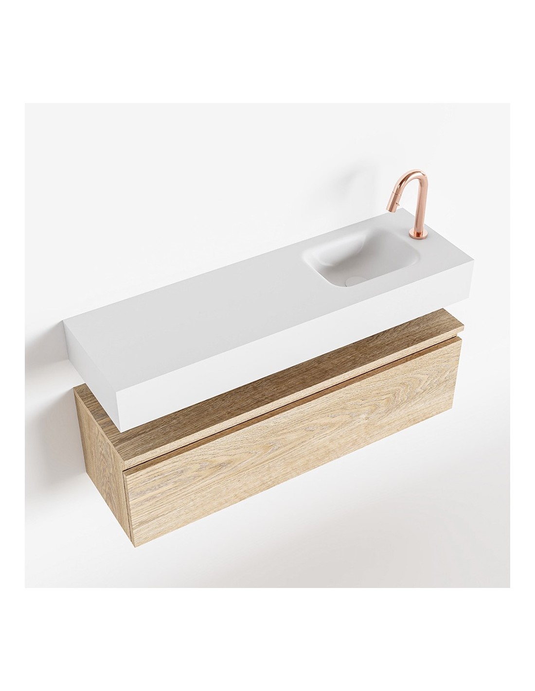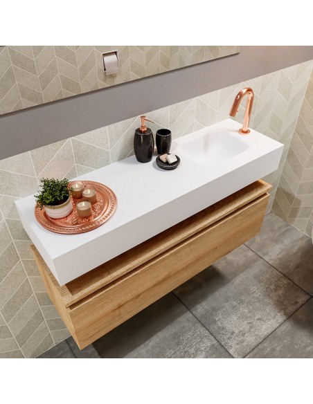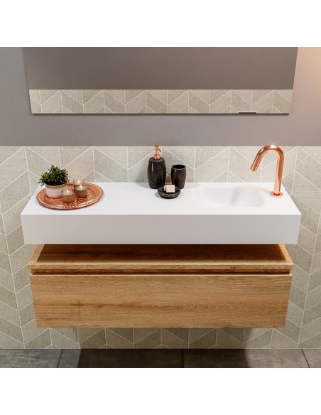 ANDOR Komplet badmiljø med højrevendt håndvask til bordmonteret armatur. Badmiljøet kommer med 1 skuffe med fuldt udtræk, og er fremstillet i MDF med design af vasket eg. Håndvasken er fremstillet i talkumsfarvet (mat hvid) solid surface. Badmiljøet måler 100 cm i bredden. Det viste armatur medfølger ikke i sættet.
