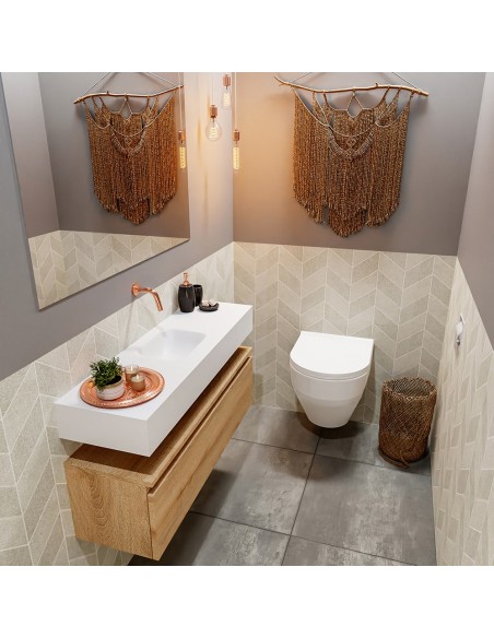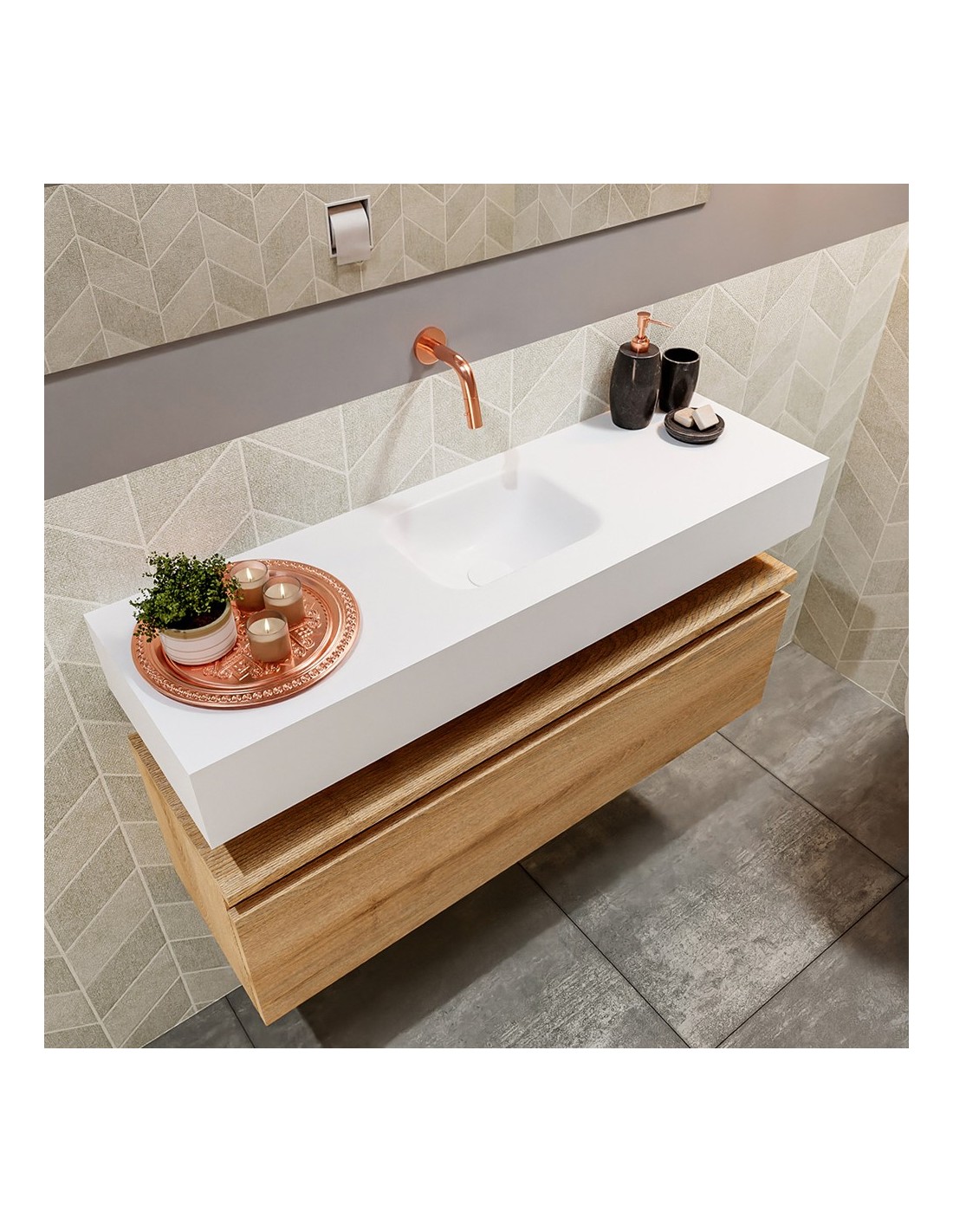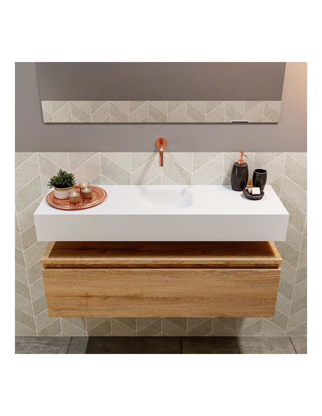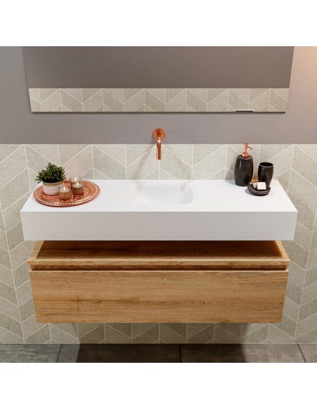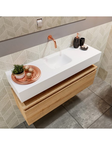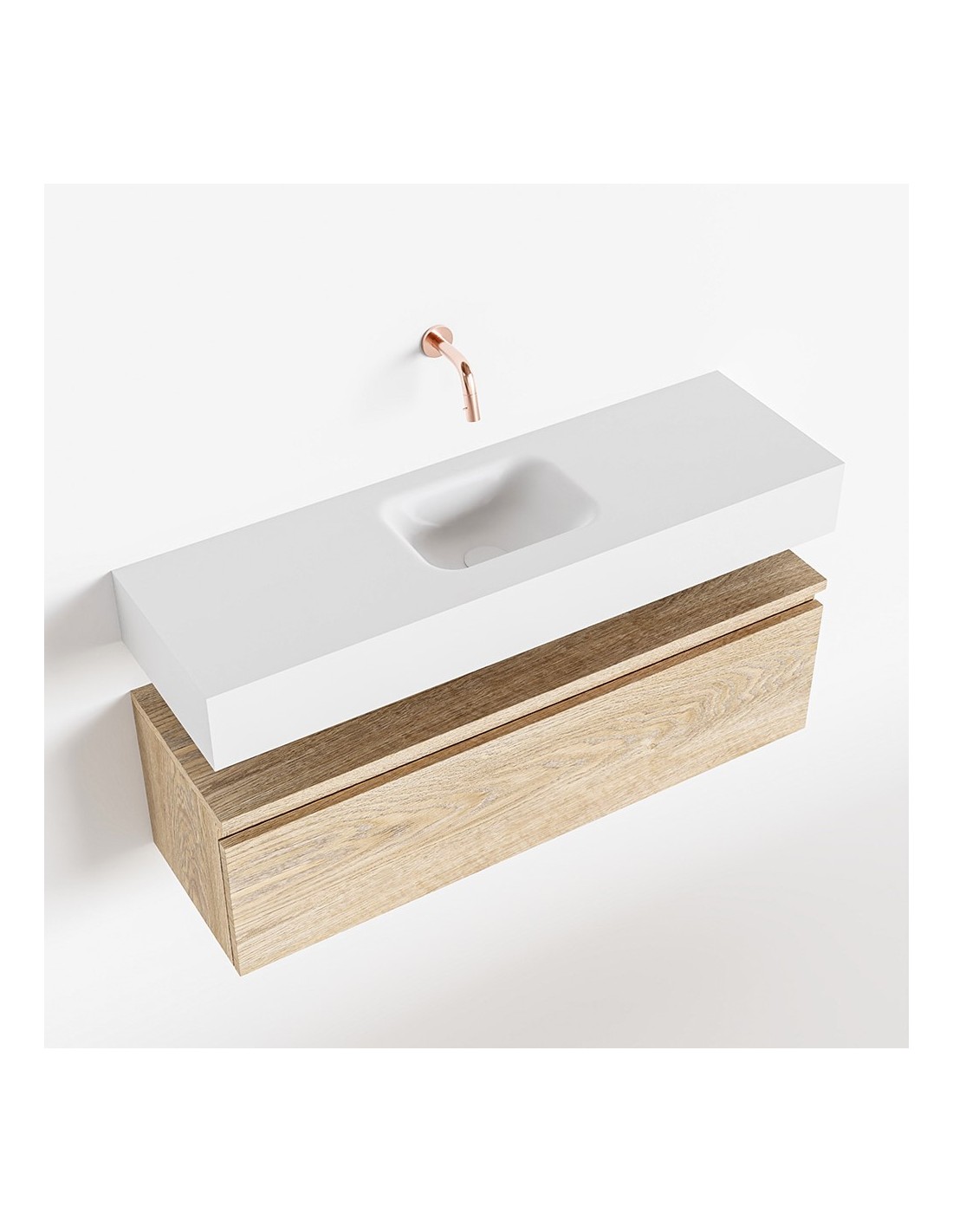 ANDOR Komplet badmiljø med midt centreret håndvask til vægmonteret armatur. Badmiljøet kommer med 1 skuffe med fuldt udtræk, og er fremstillet i MDF med design af vasket eg. Håndvasken er fremstillet i talkumsfarvet (mat hvid) solid surface. Badmiljøet måler 100 cm i bredden. Det viste armatur medfølger ikke i sættet.