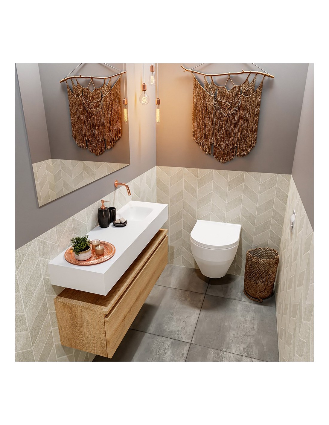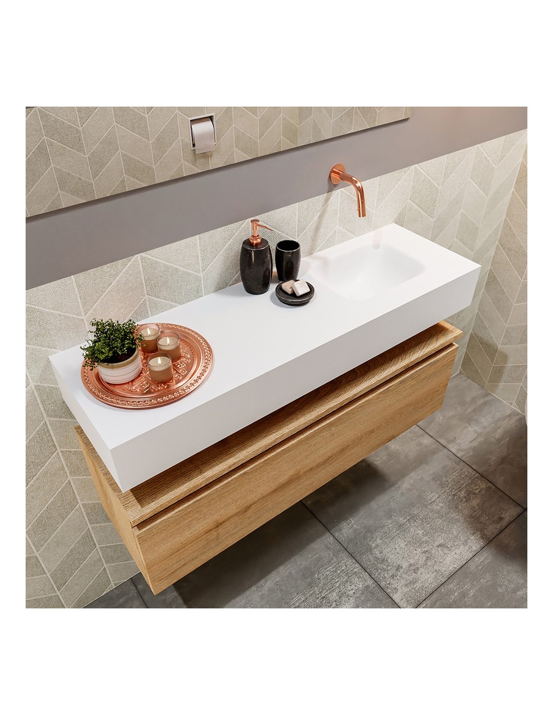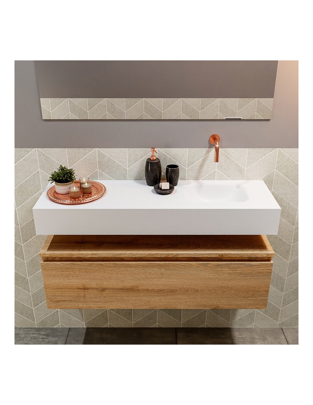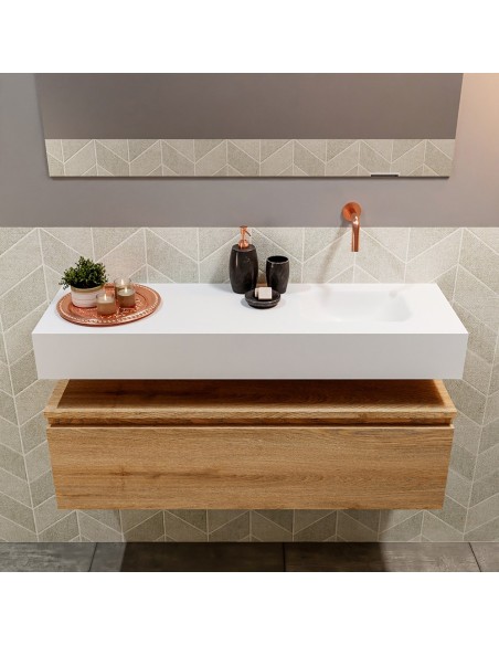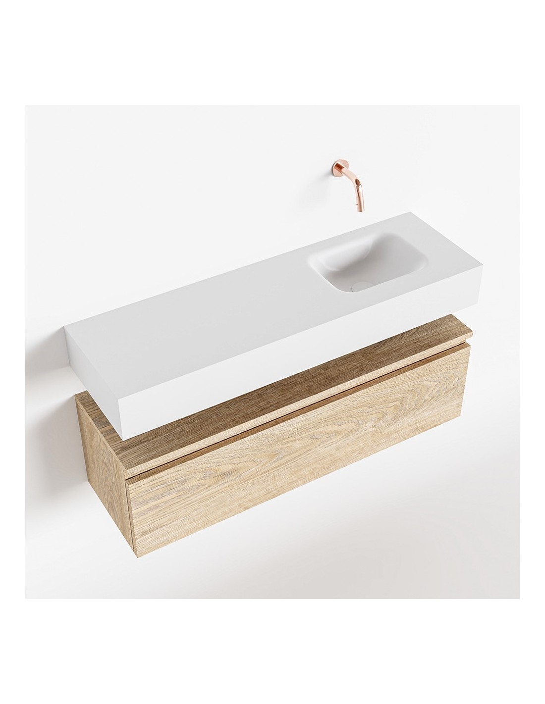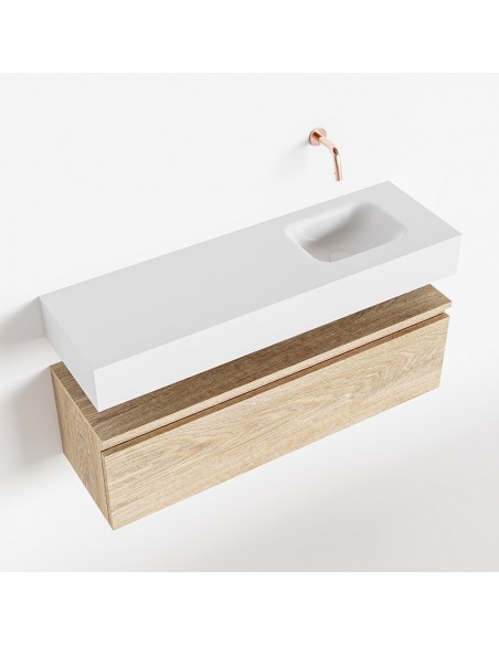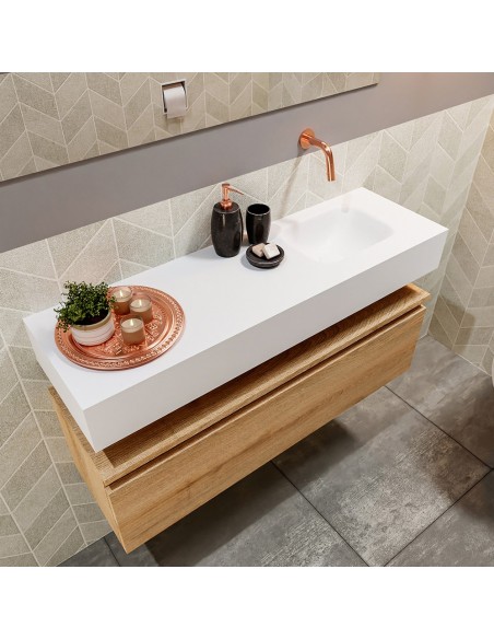 ANDOR Komplet badmiljø med højrevendt håndvask til vægmonteret armatur. Badmiljøet kommer med 1 skuffe med fuldt udtræk, og er fremstillet i MDF med design af vasket eg. Håndvasken er fremstillet i talkumsfarvet (mat hvid) solid surface. Badmiljøet måler 100 cm i bredden. Det viste armatur medfølger ikke i sættet.