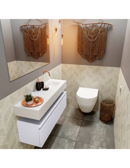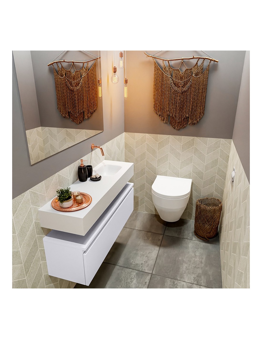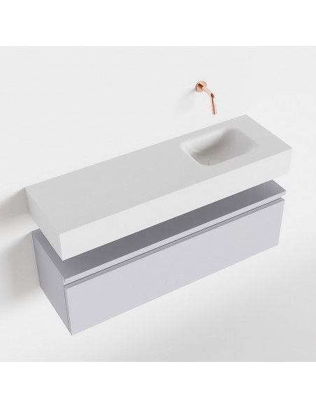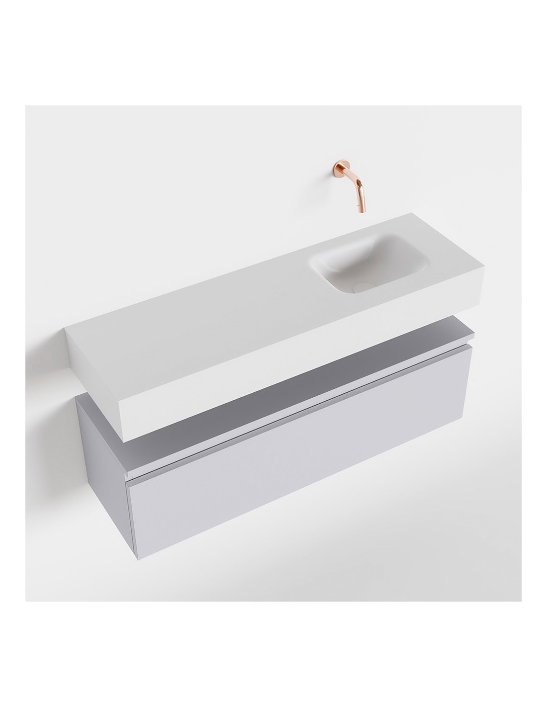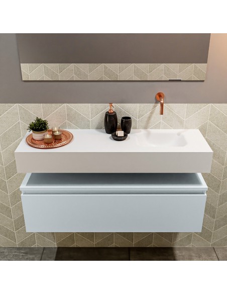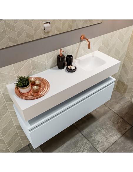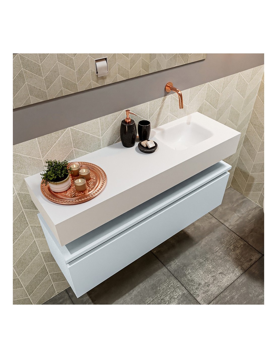 ANDOR Komplet badmiljø med højrevendt håndvask til vægmonteret armatur. Badmiljøet kommer med 1 skuffe med fuldt udtræk, og er fremstillet i MDF. Håndvasken er fremstillet i talkumsfarvet (mat hvid) solid surface. Badmiljøet måler 100 cm i bredden. Det viste armatur medfølger ikke i sættet.