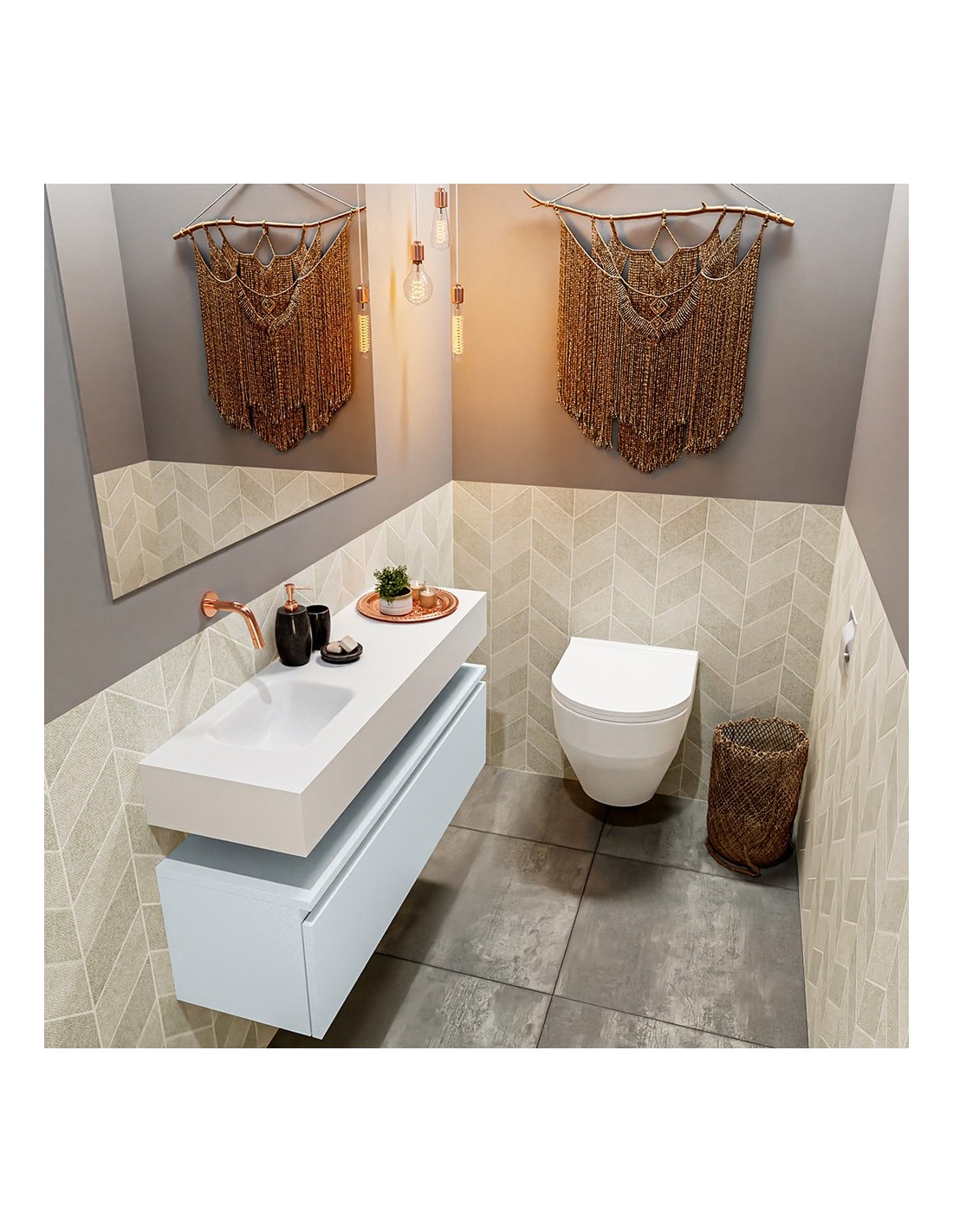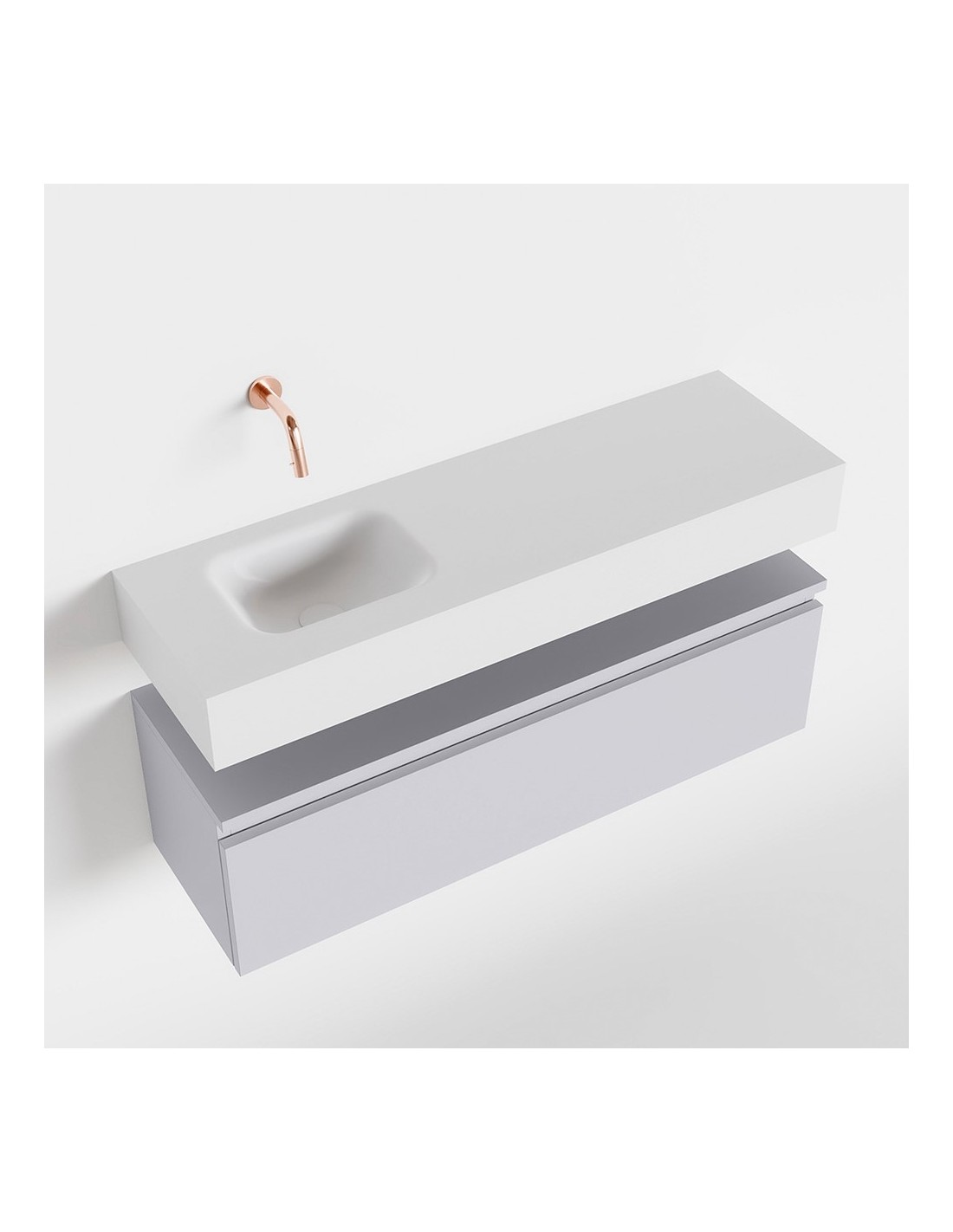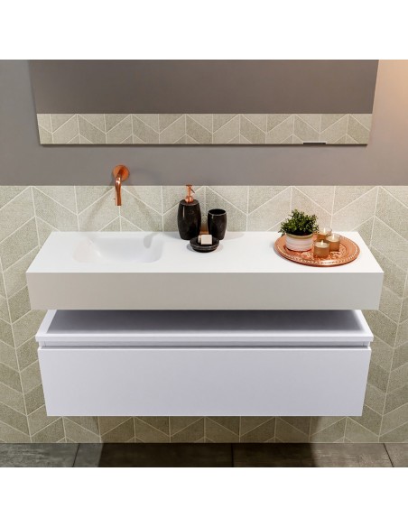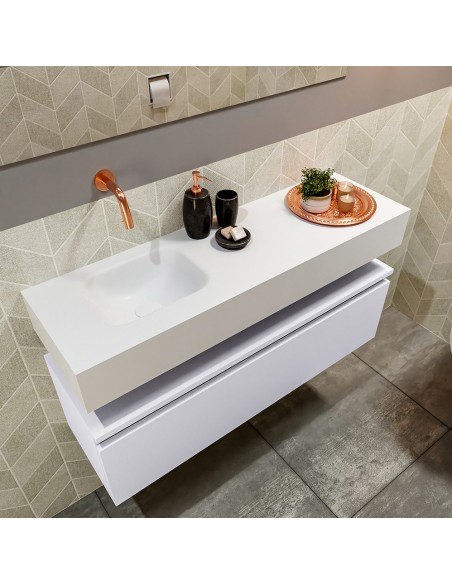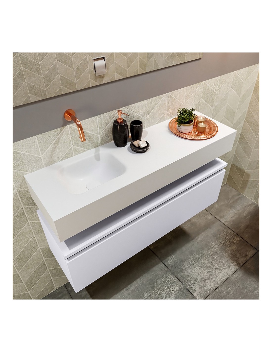 ANDOR Komplet badmiljø med venstrevendt håndvask til vægmonteret armatur. Badmiljøet kommer med 1 skuffe med fuldt udtræk, og er fremstillet i MDF. Håndvasken er fremstillet i talkumsfarvet (mat hvid) solid surface. Badmiljøet måler 100 cm i bredden. Det viste armatur medfølger ikke i sættet.