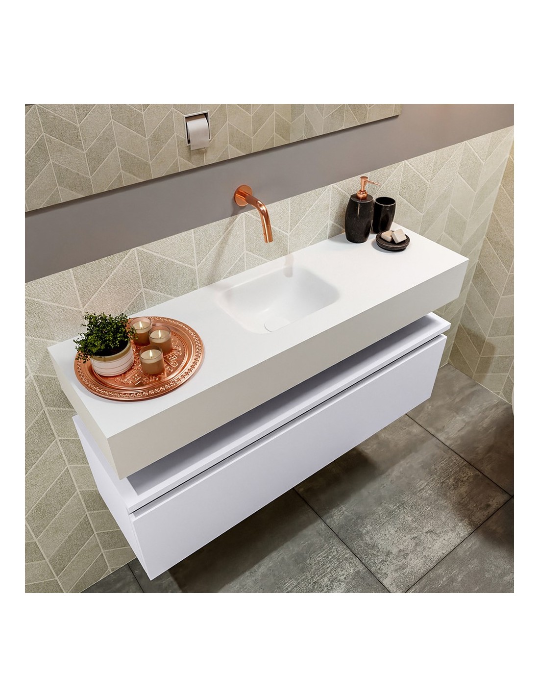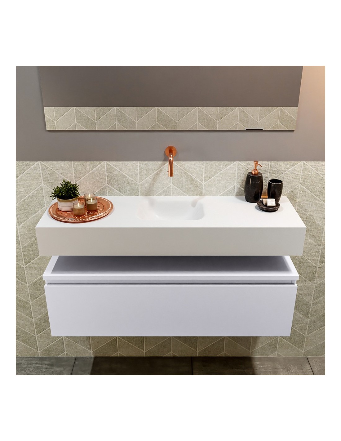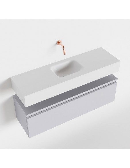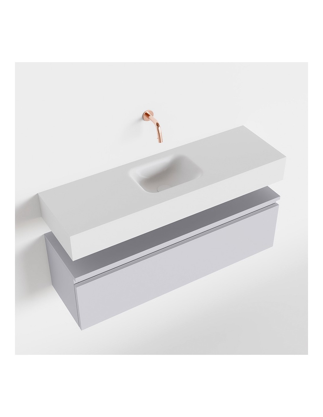 ANDOR Komplet badmiljø med midt centreret håndvask til vægmonteret armatur. Badmiljøet kommer med 1 skuffe med fuldt udtræk, og er fremstillet i MDF. Håndvasken er fremstillet i talkumsfarvet (mat hvid) solid surface. Badmiljøet måler 100 cm i bredden. Det viste armatur medfølger ikke i sættet.