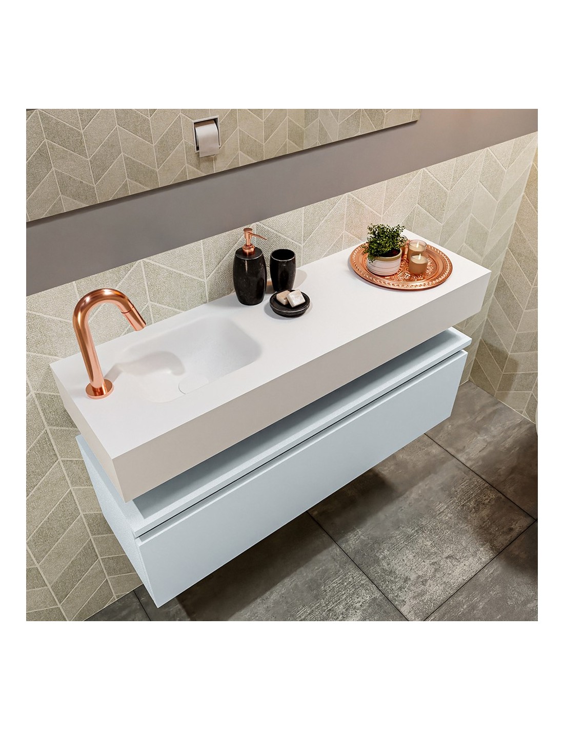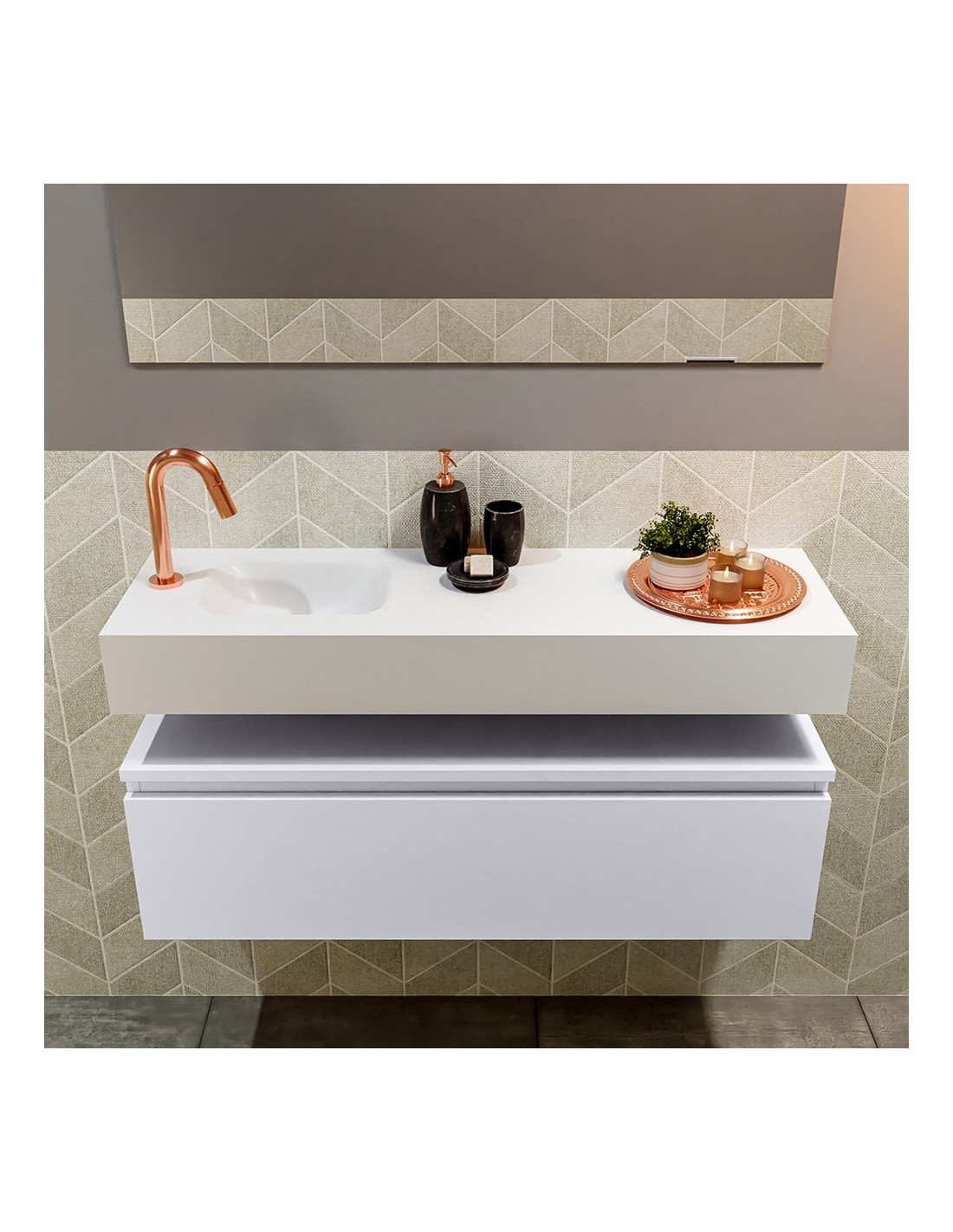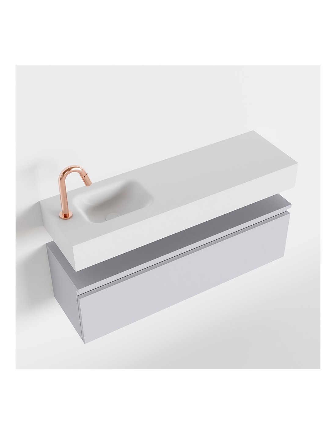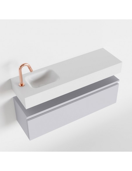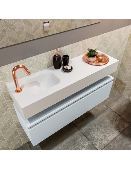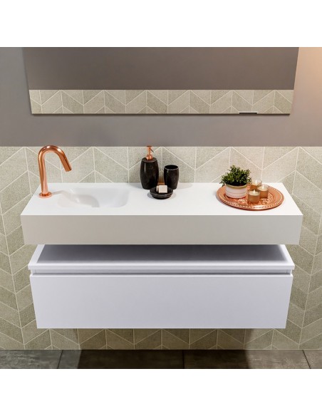 ANDOR Komplet badmiljø med venstrevendt håndvask til bordmonteret armatur. Badmiljøet kommer med 1 skuffe med fuldt udtræk, og er fremstillet i MDF. Håndvasken er fremstillet i talkumsfarvet (mat hvid) solid surface. Badmiljøet måler 100 cm i bredden. Det viste armatur medfølger ikke i sættet.
