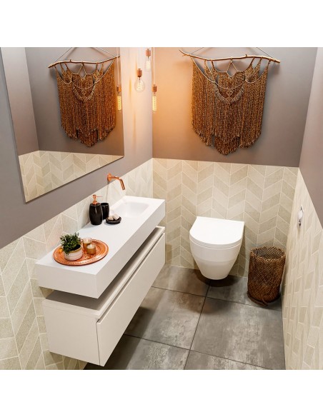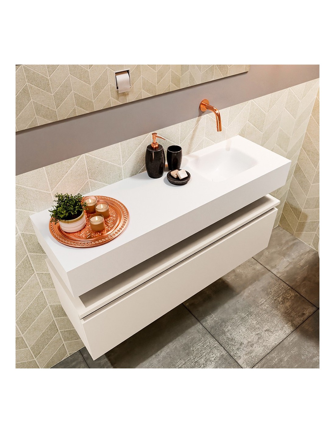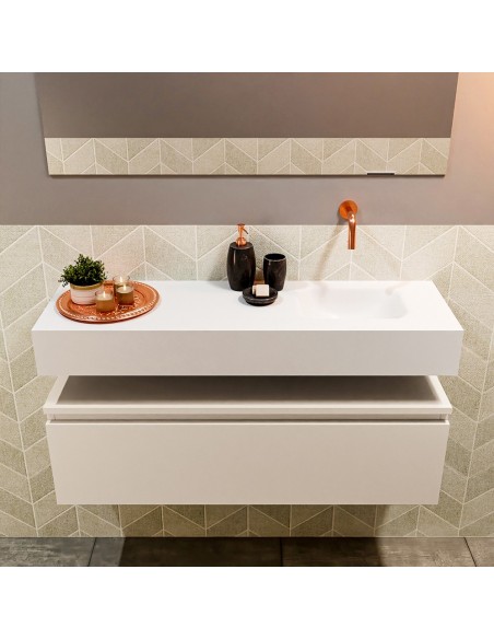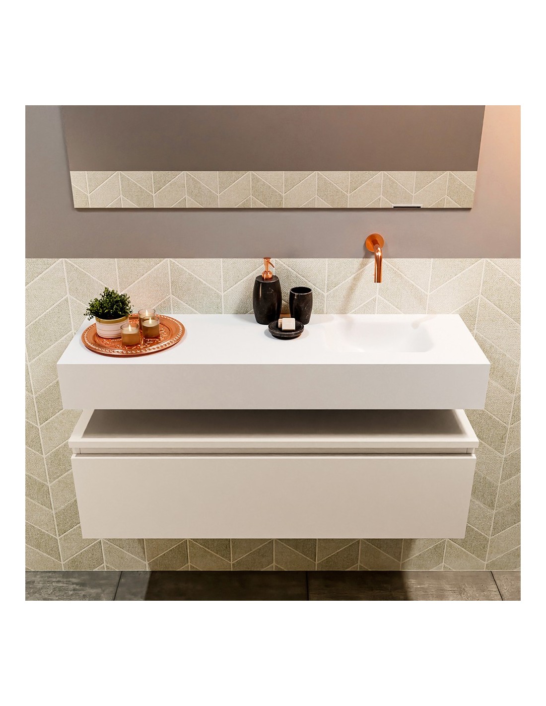ANDOR Komplet badmiljø med højrevendt håndvask til vægmonteret armatur. Badmiljøet kommer med 1 skuffe med fuldt udtræk, og er fremstillet i MDF. Håndvasken er fremstillet i talkumsfarvet (mat hvid) solid surface. Badmiljøet måler 100 cm i bredden. Det viste armatur medfølger ikke i sættet.
