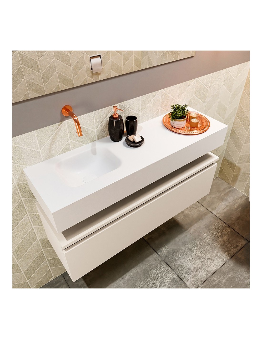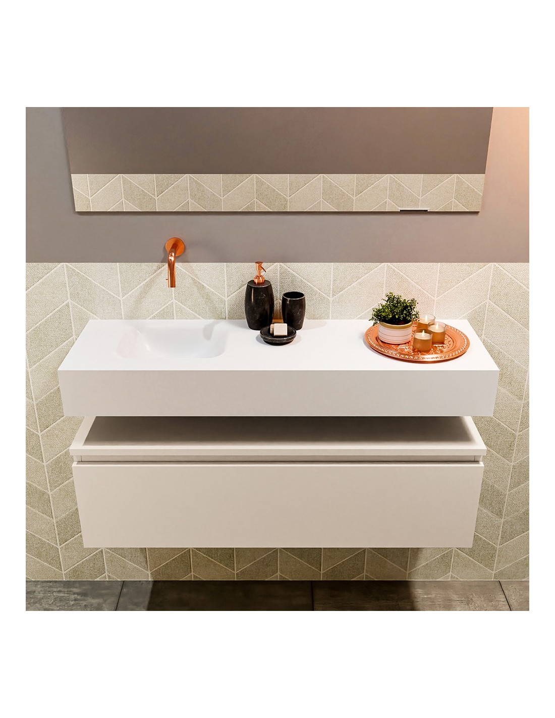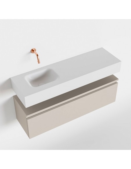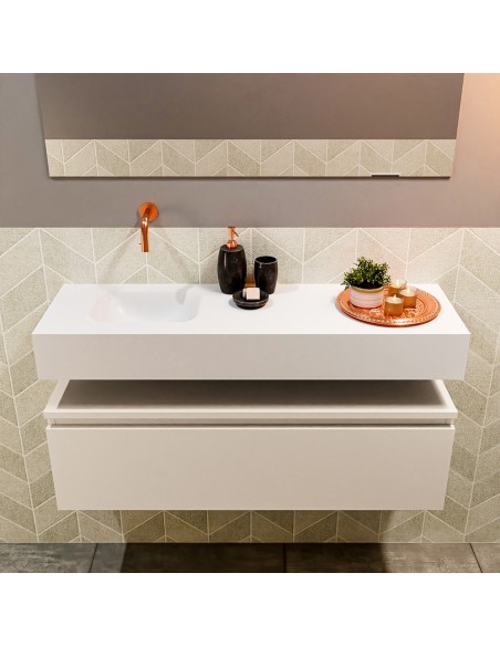 ANDOR Komplet badmiljø med venstrevendt håndvask til vægmonteret armatur. Badmiljøet kommer med 1 skuffe med fuldt udtræk, og er fremstillet i MDF. Håndvasken er fremstillet i talkumsfarvet (mat hvid) solid surface. Badmiljøet måler 100 cm i bredden. Det viste armatur medfølger ikke i sættet.