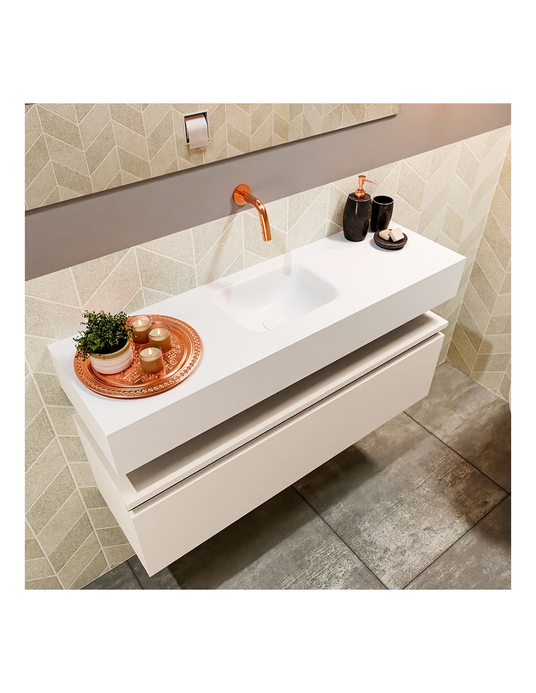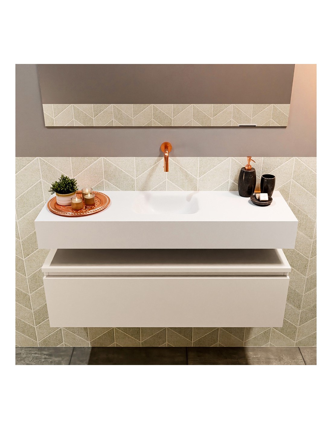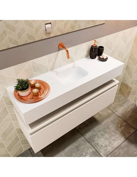ANDOR Komplet badmiljø med midt centreret håndvask til vægmonteret armatur. Badmiljøet kommer med 1 skuffe med fuldt udtræk, og er fremstillet i MDF. Håndvasken er fremstillet i talkumsfarvet (mat hvid) solid surface. Badmiljøet måler 100 cm i bredden. Det viste armatur medfølger ikke i sættet.