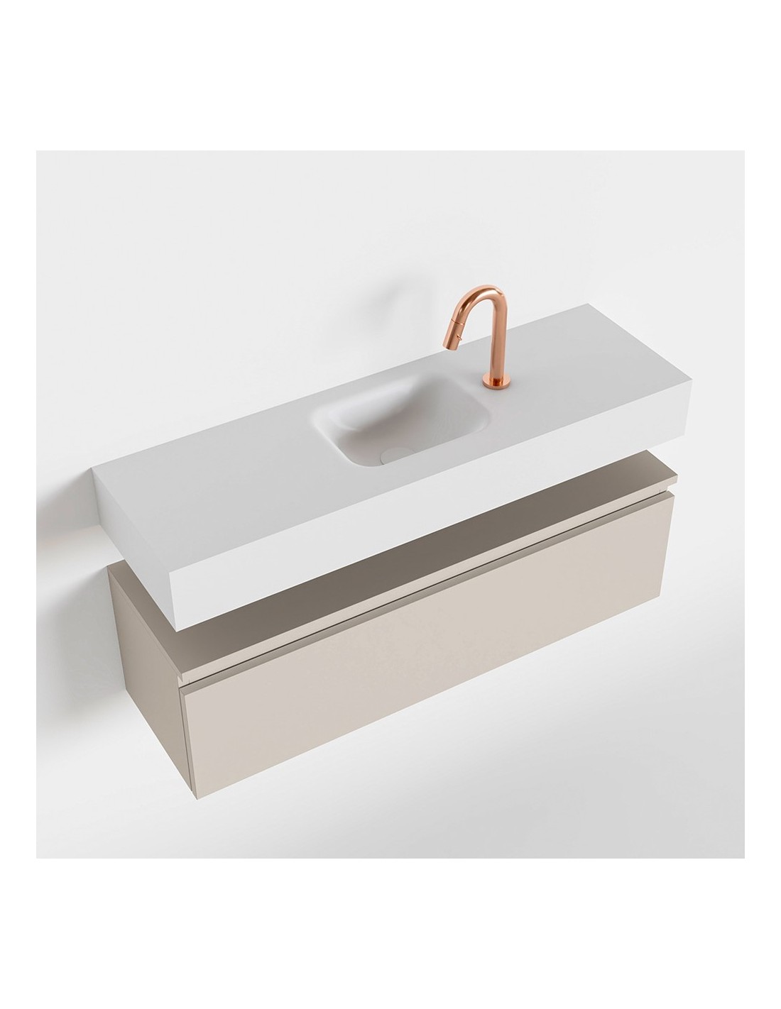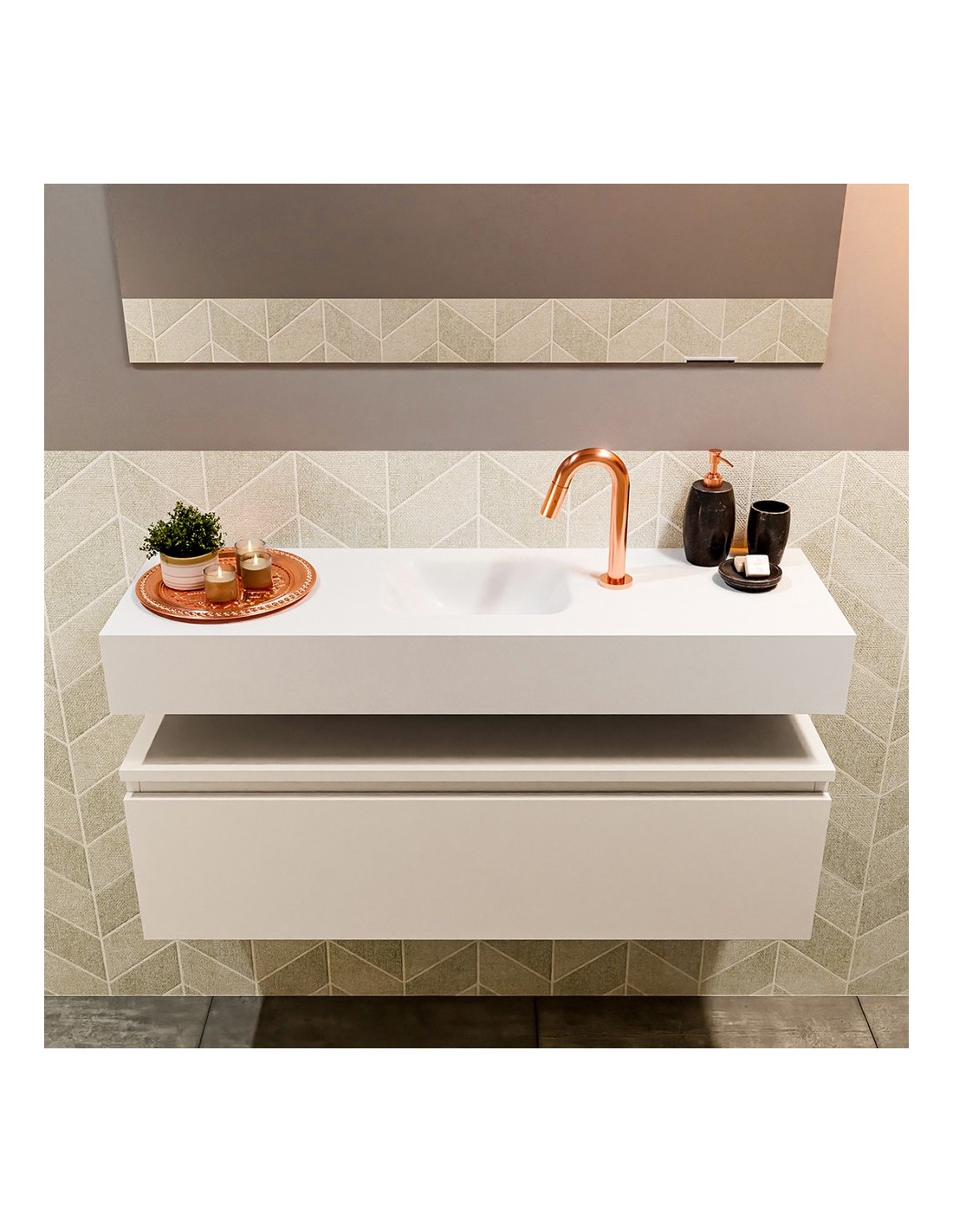 ANDOR Komplet badmiljø med midt centreret håndvask til bordmonteret armatur. Badmiljøet kommer med 1 skuffe med fuldt udtræk, og er fremstillet i MDF. Håndvasken er fremstillet i talkumsfarvet (mat hvid) solid surface. Badmiljøet måler 100 cm i bredden. Det viste armatur medfølger ikke i sættet.