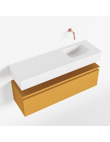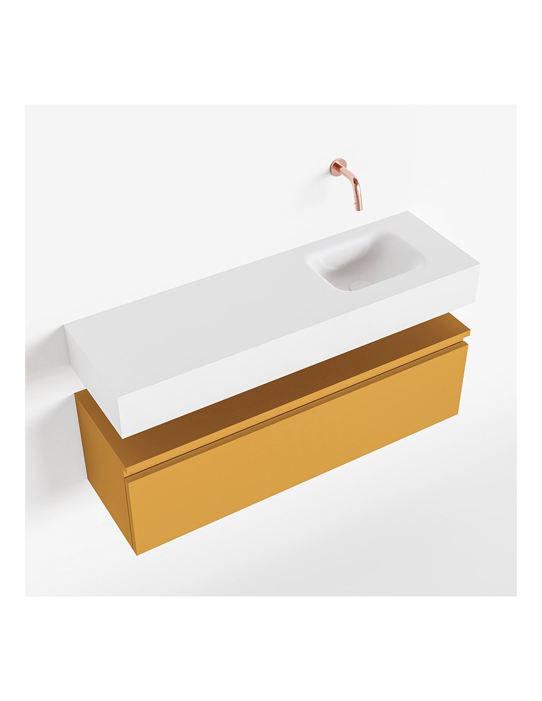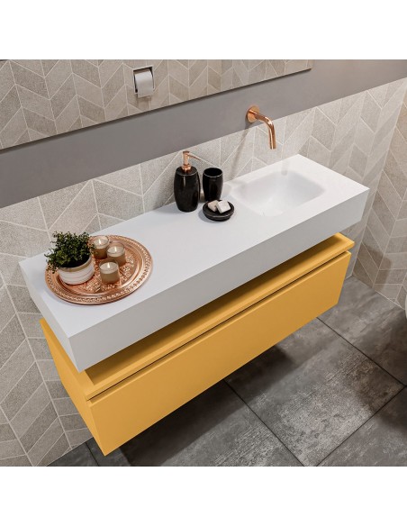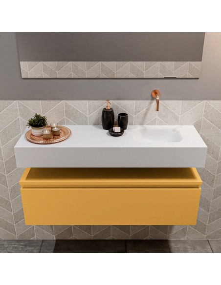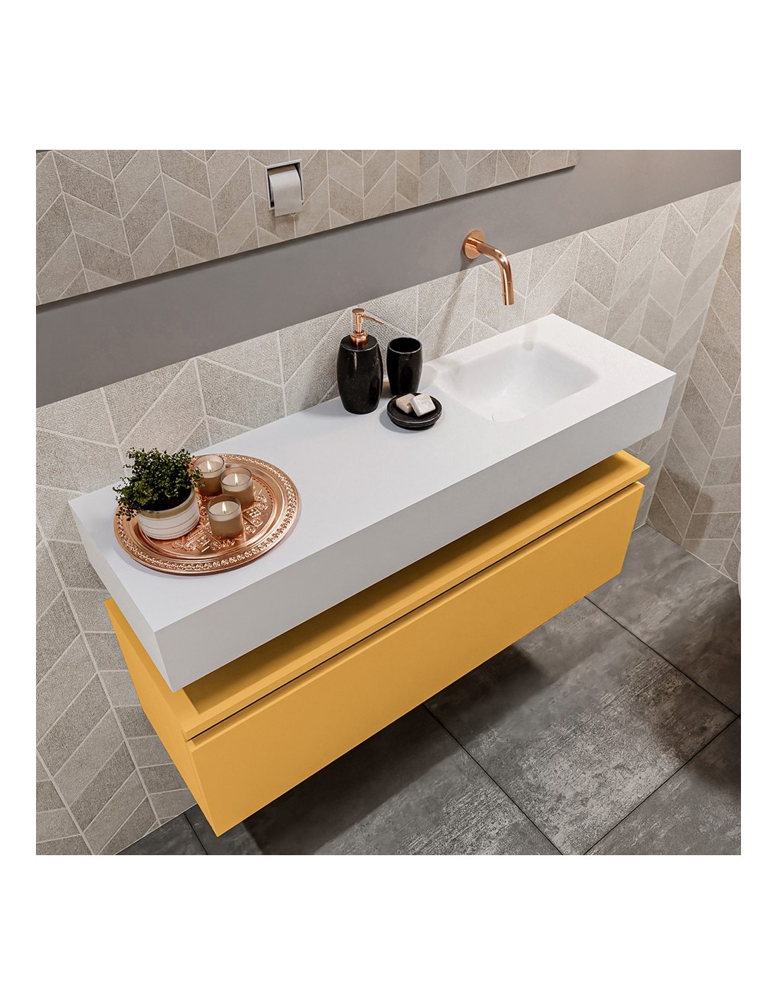 ANDOR Komplet badmiljø med højrevendt håndvask til vægmonteret armatur. Badmiljøet kommer med 1 skuffe med fuldt udtræk, og er fremstillet i MDF. Håndvasken er fremstillet i talkumsfarvet (mat hvid) solid surface. Badmiljøet måler 100 cm i bredden. Det viste armatur medfølger ikke i sættet.