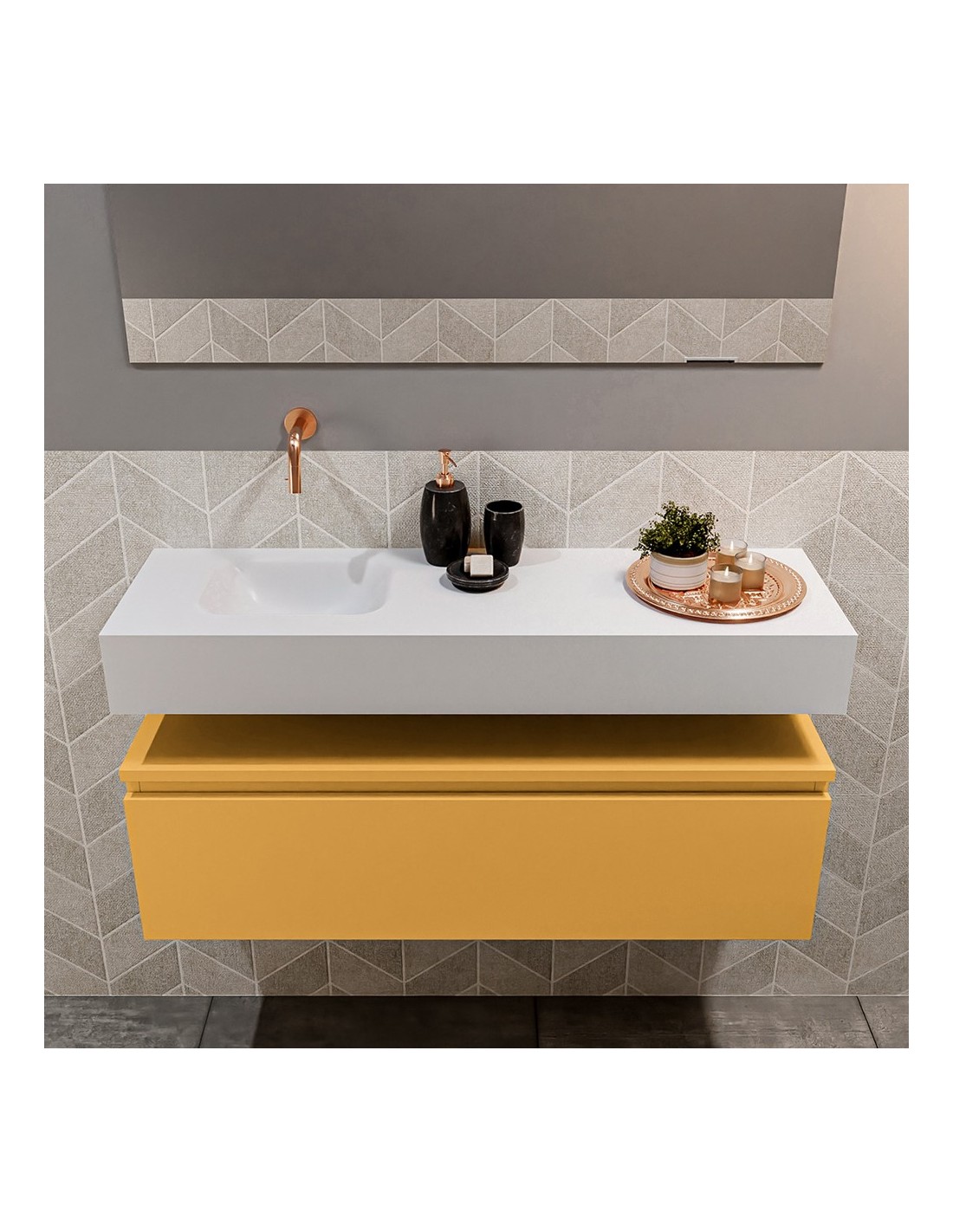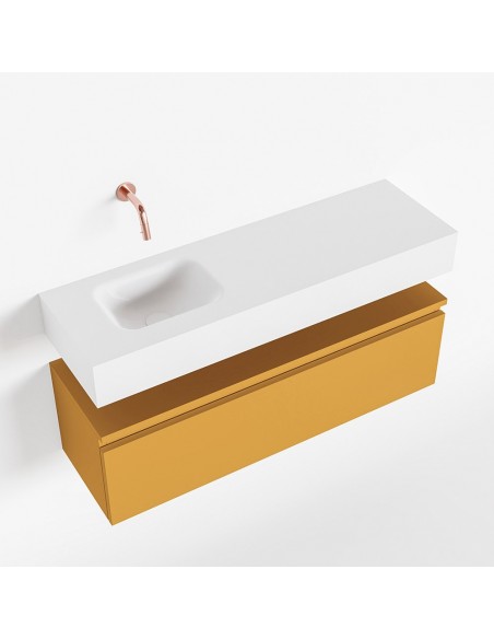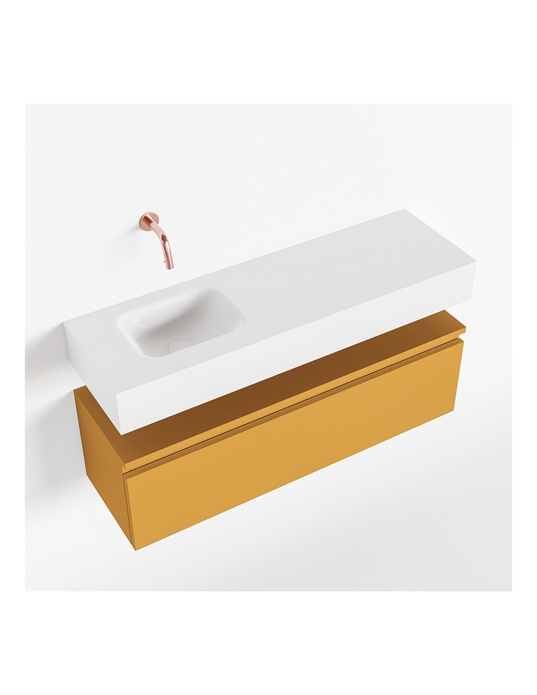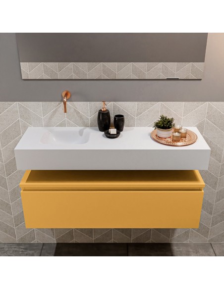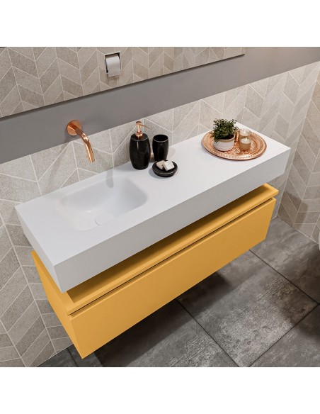 ANDOR Komplet badmiljø med venstrevendt håndvask til vægmonteret armatur. Badmiljøet kommer med 1 skuffe med fuldt udtræk, og er fremstillet i MDF. Håndvasken er fremstillet i talkumsfarvet (mat hvid) solid surface. Badmiljøet måler 100 cm i bredden. Det viste armatur medfølger ikke i sættet.