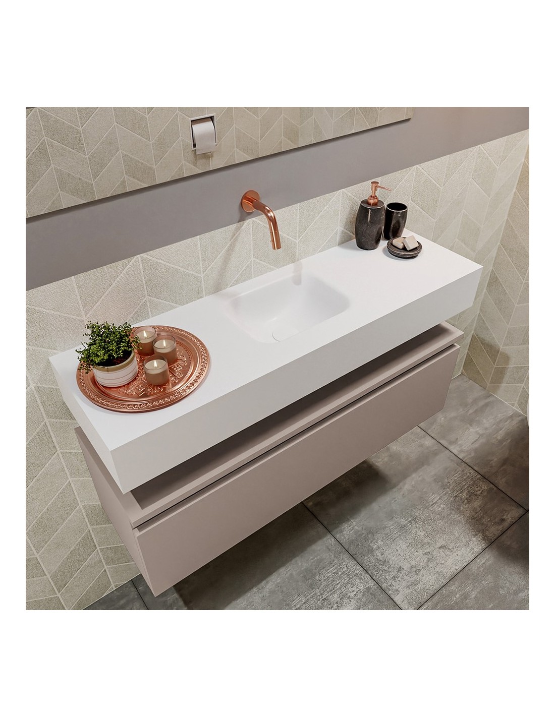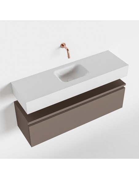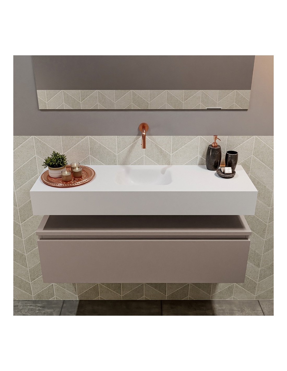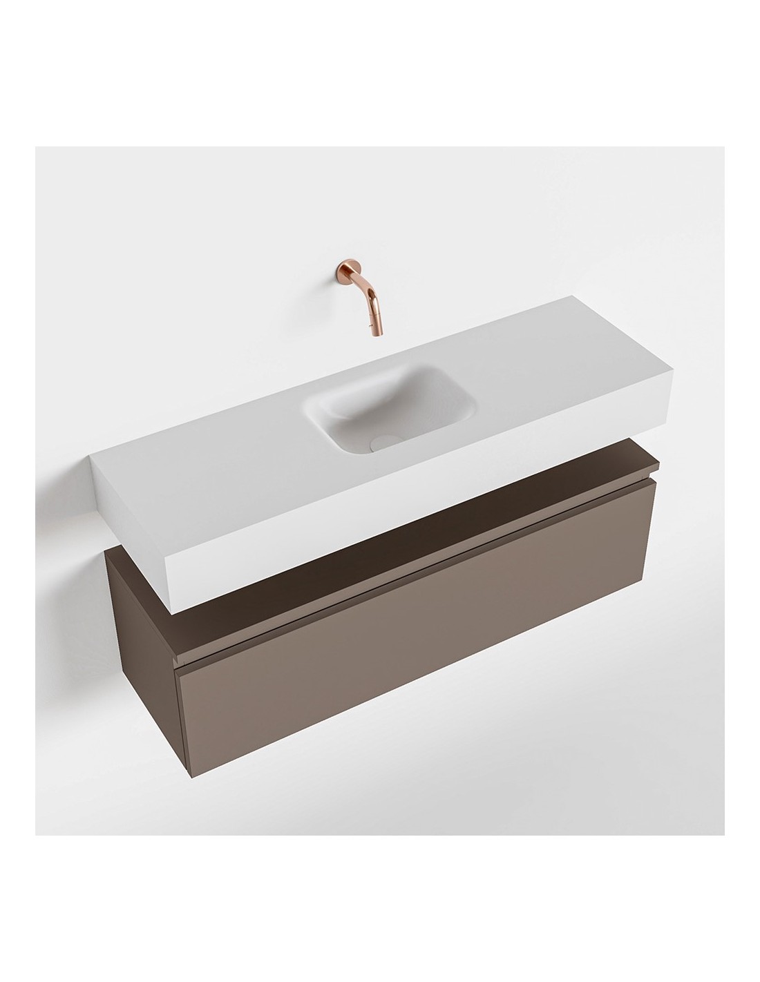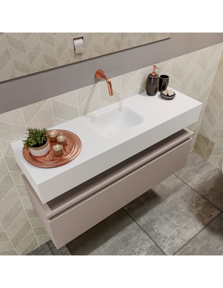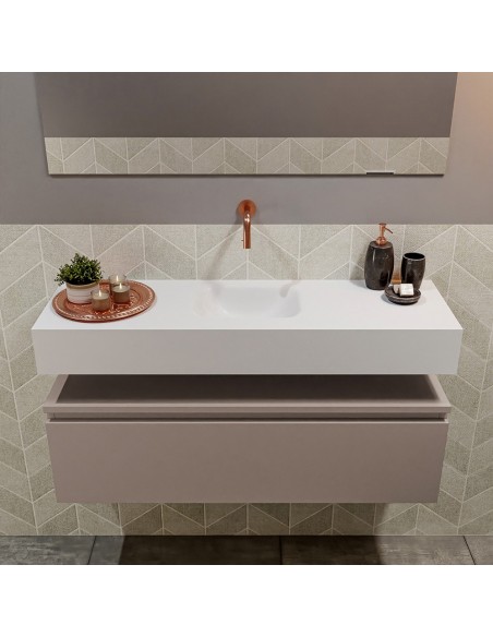 ANDOR Komplet badmiljø med midt centreret håndvask til vægmonteret armatur. Badmiljøet kommer med 1 skuffe med fuldt udtræk, og er fremstillet i MDF. Håndvasken er fremstillet i talkumsfarvet (mat hvid) solid surface. Badmiljøet måler 100 cm i bredden. Det viste armatur medfølger ikke i sættet.