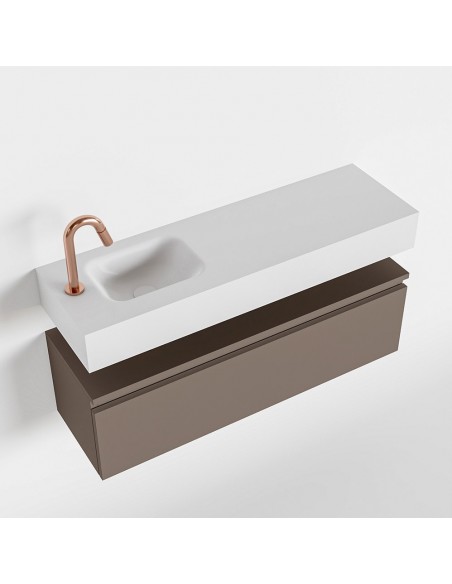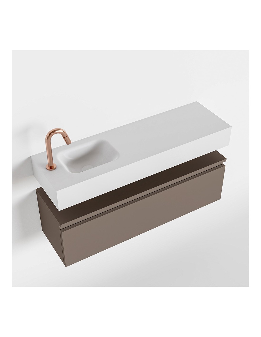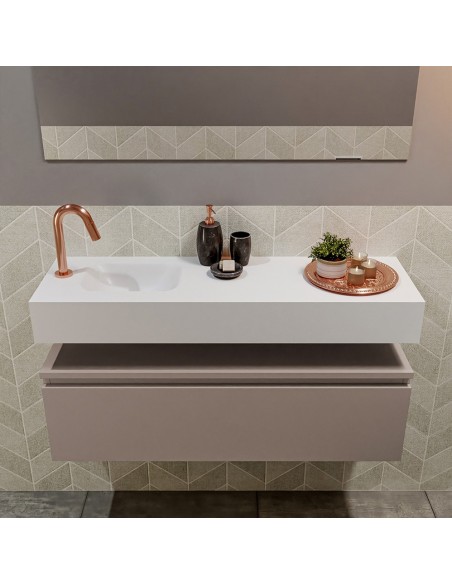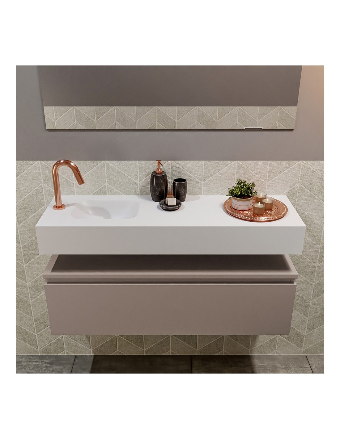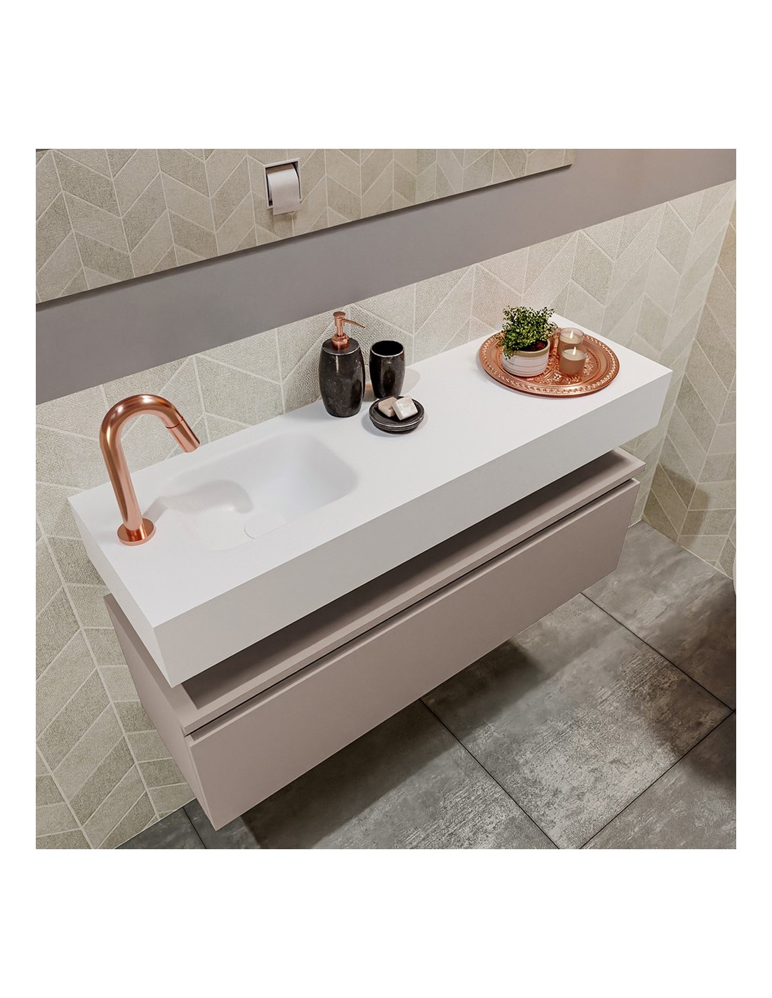 ANDOR Komplet badmiljø med venstrevendt håndvask til bordmonteret armatur. Badmiljøet kommer med 1 skuffe med fuldt udtræk, og er fremstillet i MDF. Håndvasken er fremstillet i talkumsfarvet (mat hvid) solid surface. Badmiljøet måler 100 cm i bredden. Det viste armatur medfølger ikke i sættet.