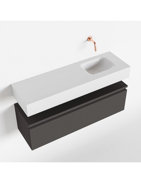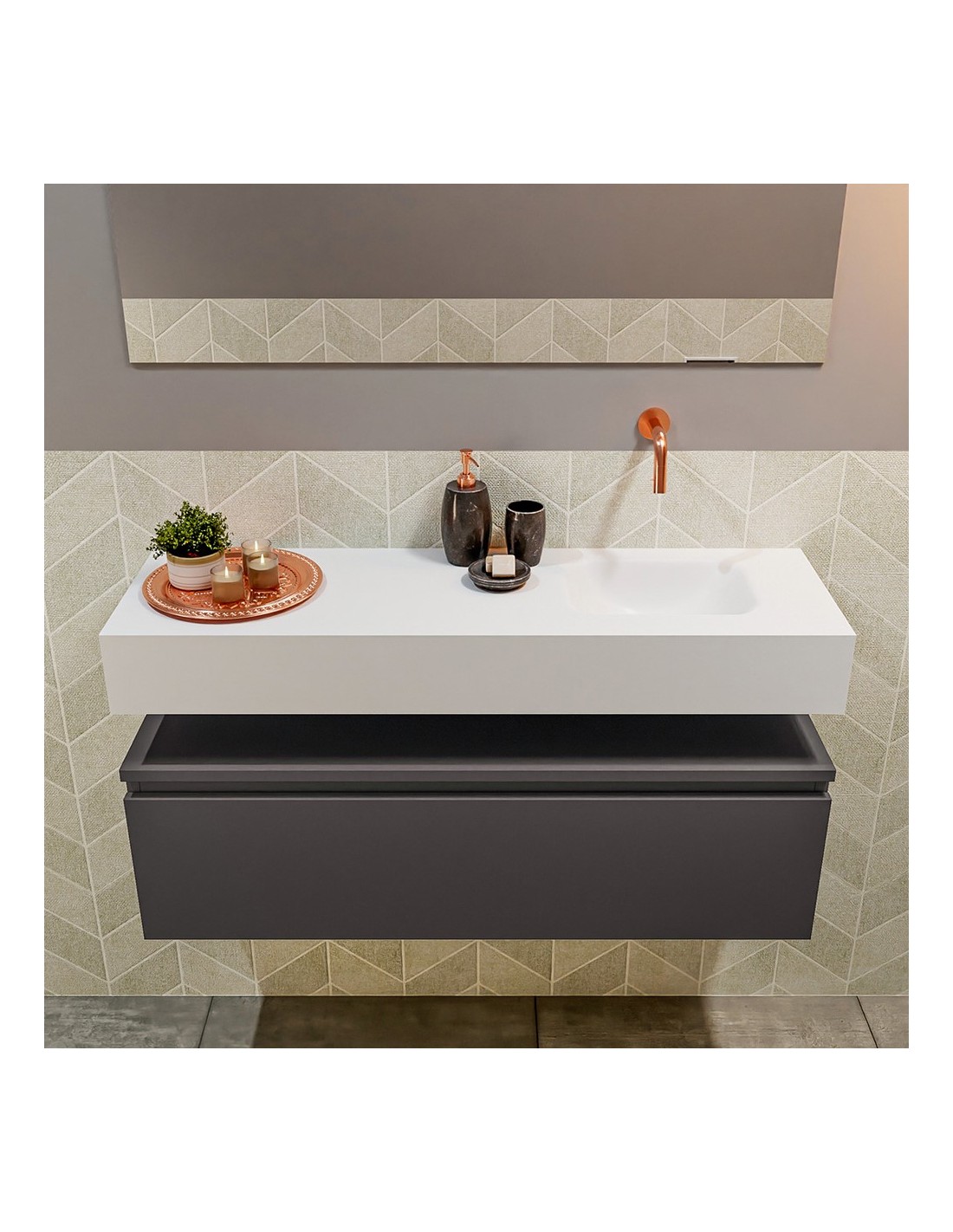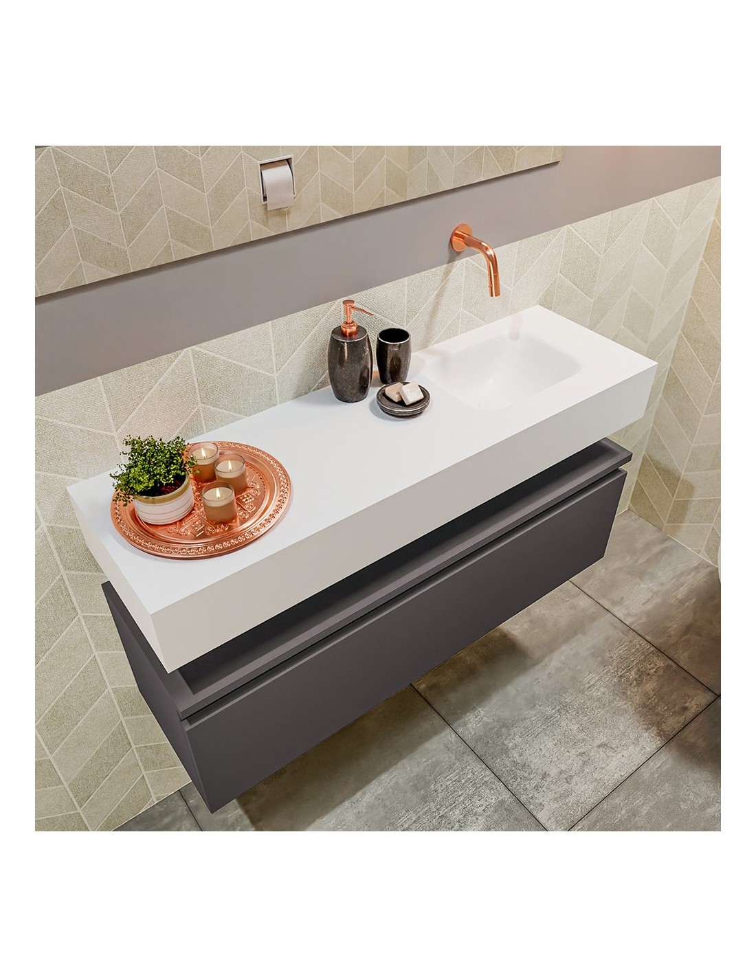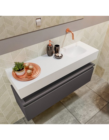ANDOR Komplet badmiljø med højrevendt håndvask til vægmonteret armatur. Badmiljøet kommer med 1 skuffe med fuldt udtræk, og er fremstillet i MDF. Håndvasken er fremstillet i talkumsfarvet (mat hvid) solid surface. Badmiljøet måler 100 cm i bredden. Det viste armatur medfølger ikke i sættet.
