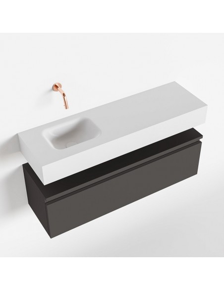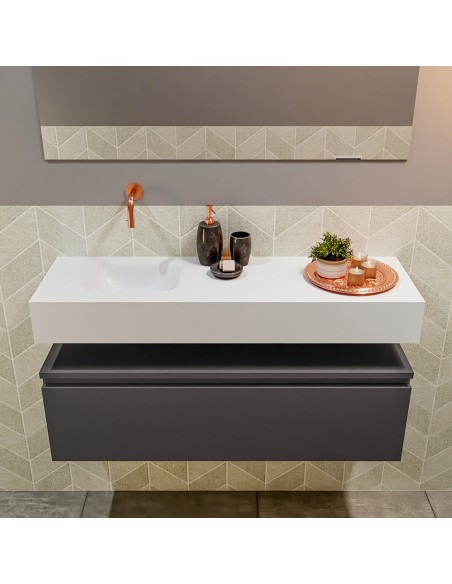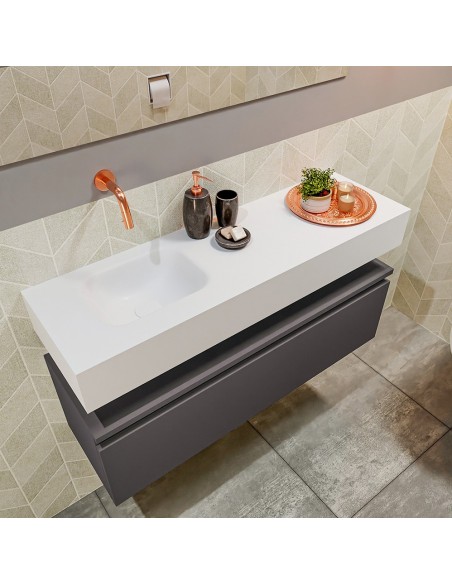 ANDOR Komplet badmiljø med venstrevendt håndvask til vægmonteret armatur. Badmiljøet kommer med 1 skuffe med fuldt udtræk, og er fremstillet i MDF. Håndvasken er fremstillet i talkumsfarvet (mat hvid) solid surface. Badmiljøet måler 100 cm i bredden. Det viste armatur medfølger ikke i sættet.