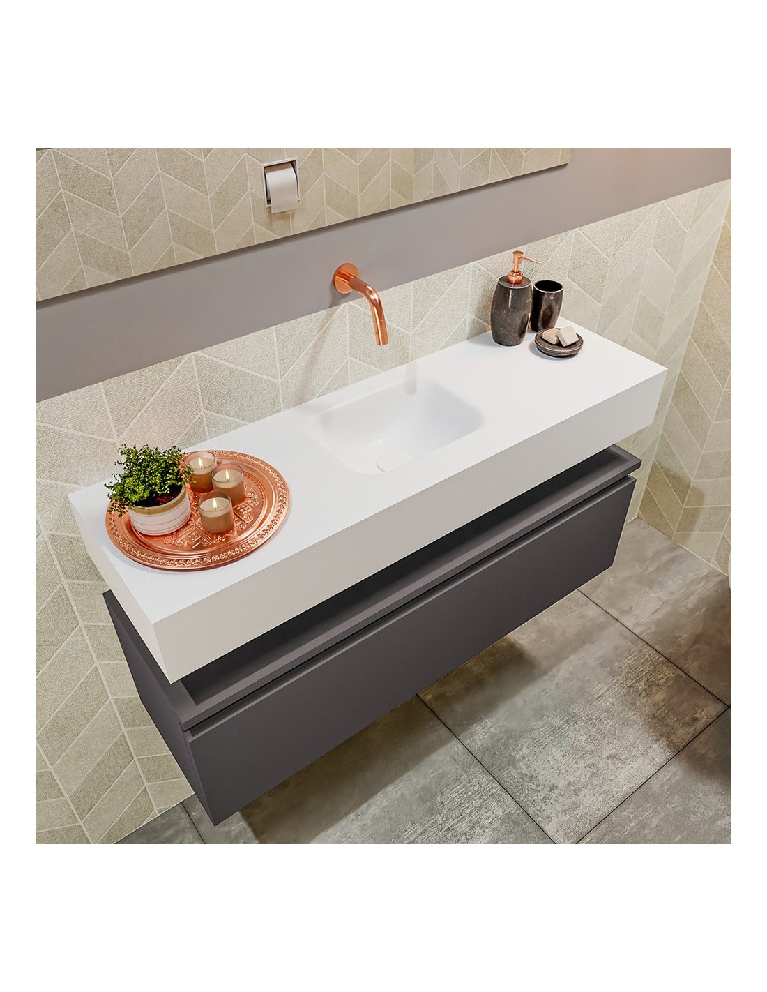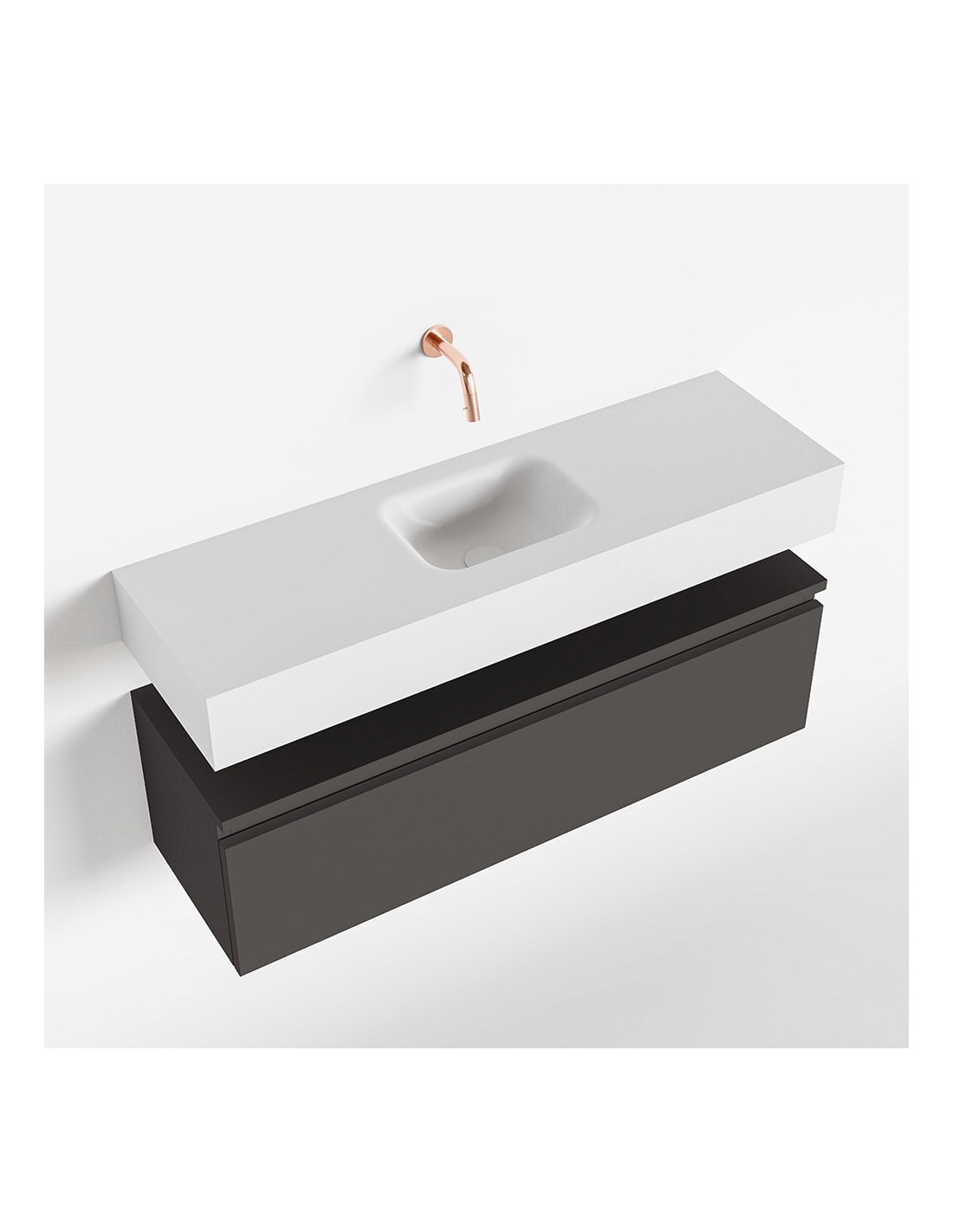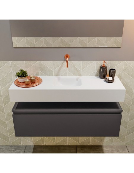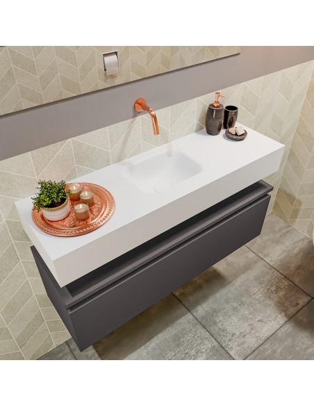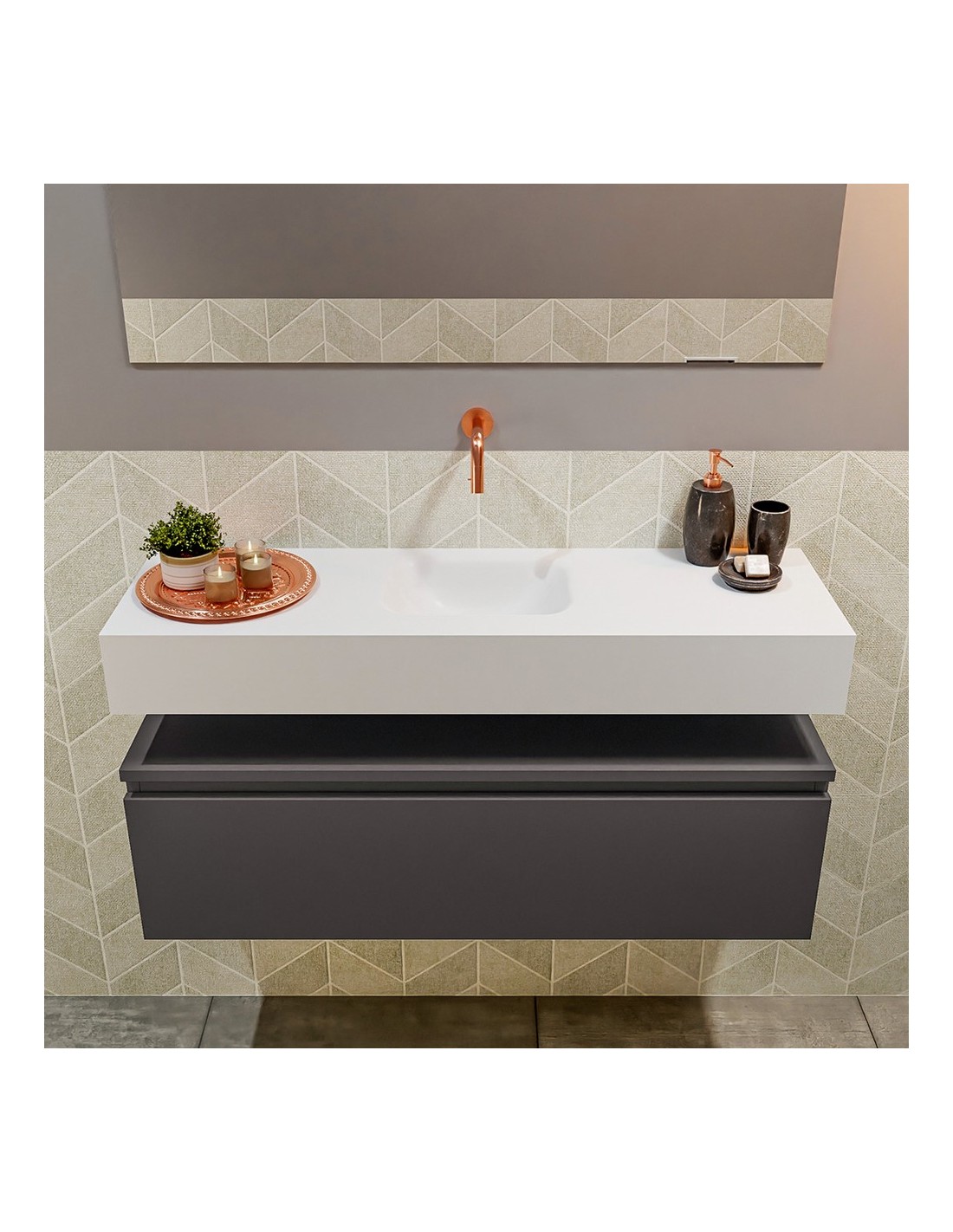 ANDOR Komplet badmiljø med midt centreret håndvask til vægmonteret armatur. Badmiljøet kommer med 1 skuffe med fuldt udtræk, og er fremstillet i MDF. Håndvasken er fremstillet i talkumsfarvet (mat hvid) solid surface. Badmiljøet måler 100 cm i bredden. Det viste armatur medfølger ikke i sættet.