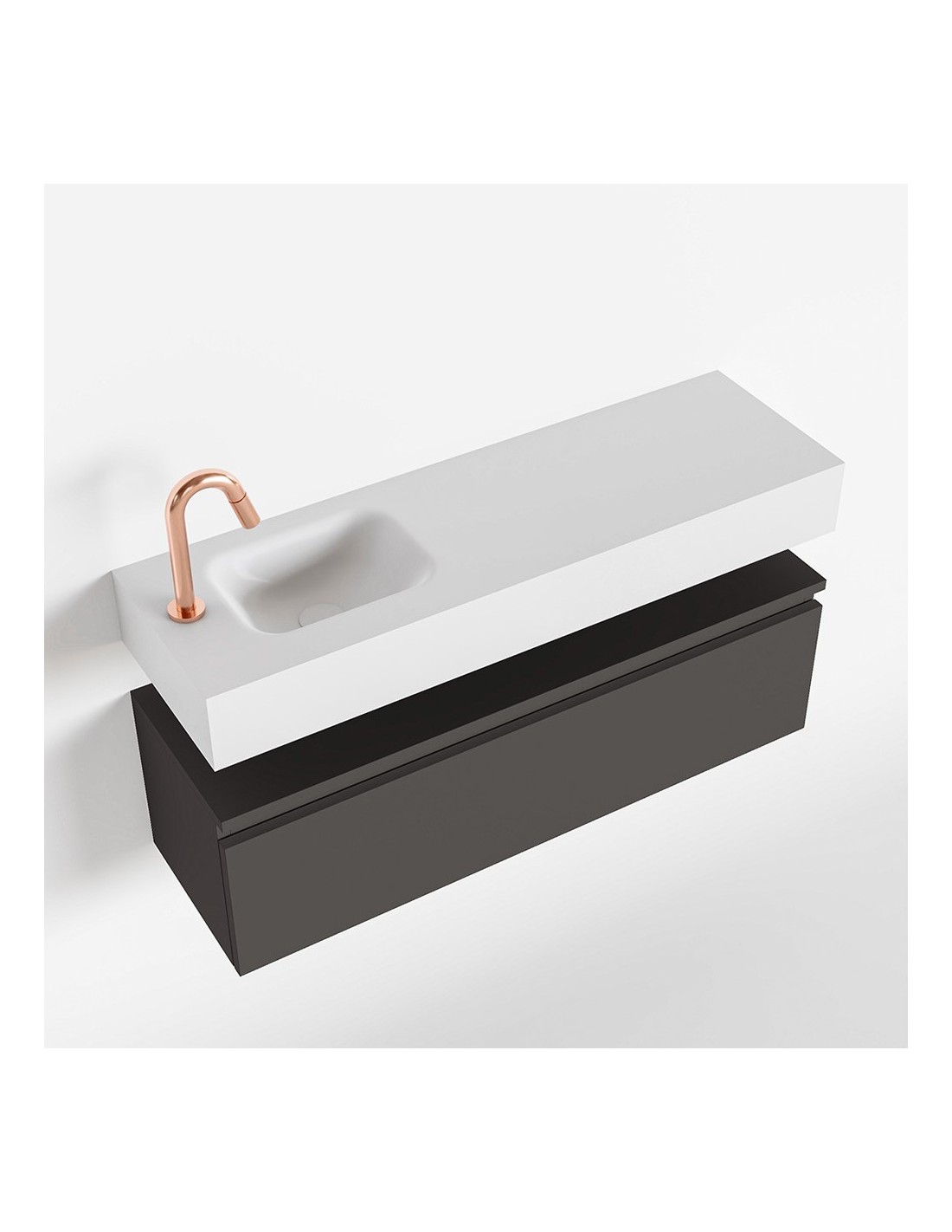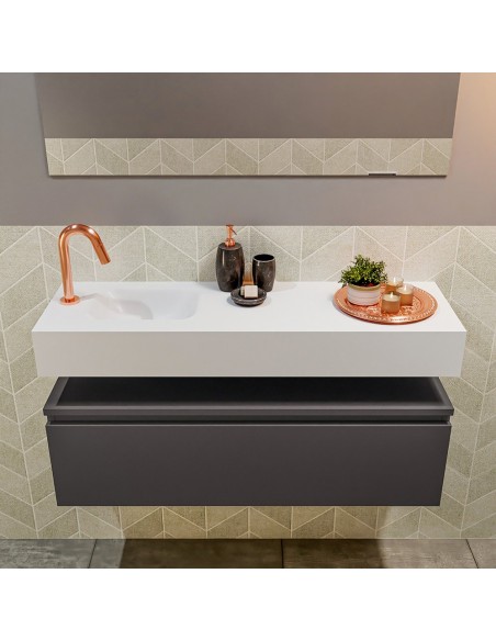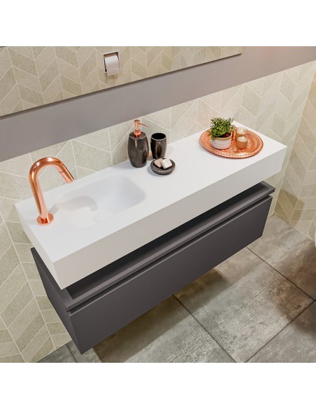 ANDOR Komplet badmiljø med venstrevendt håndvask til bordmonteret armatur. Badmiljøet kommer med 1 skuffe med fuldt udtræk, og er fremstillet i MDF. Håndvasken er fremstillet i talkumsfarvet (mat hvid) solid surface. Badmiljøet måler 100 cm i bredden. Det viste armatur medfølger ikke i sættet.
