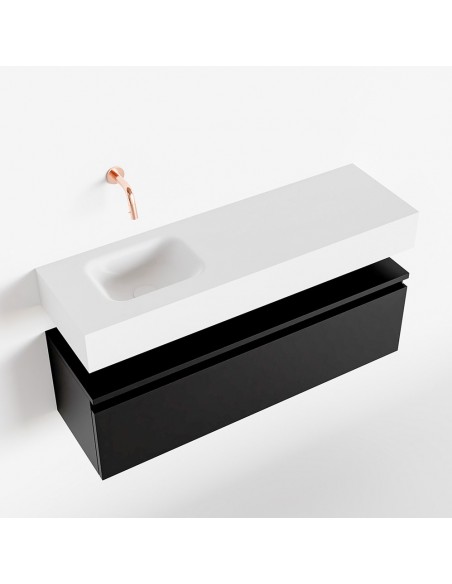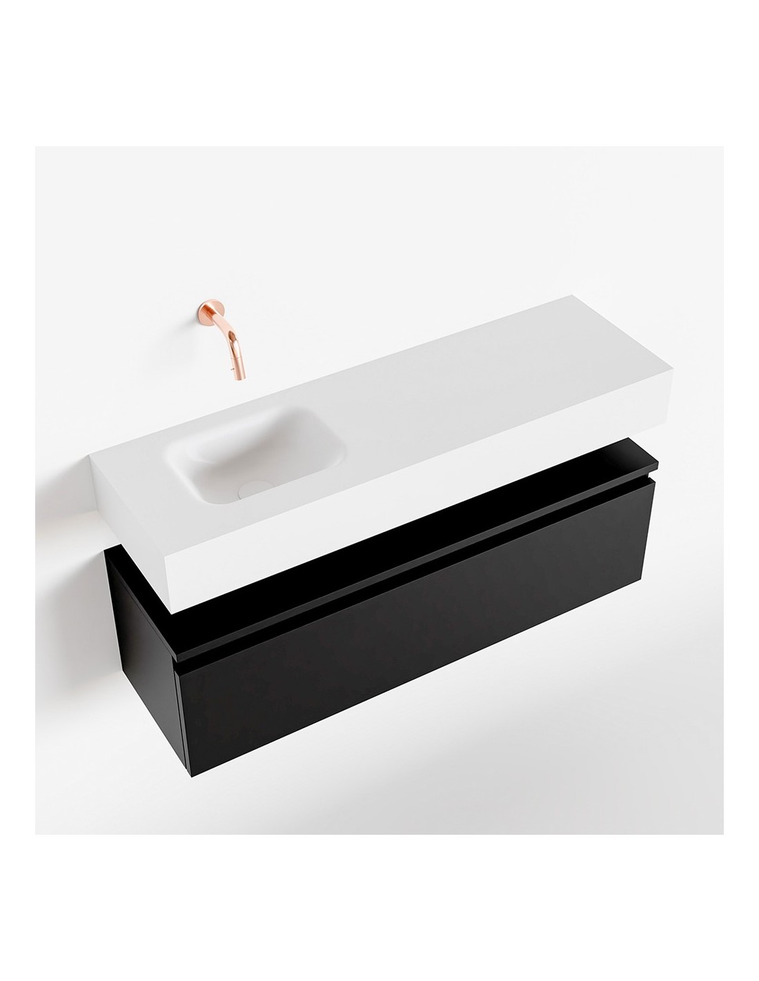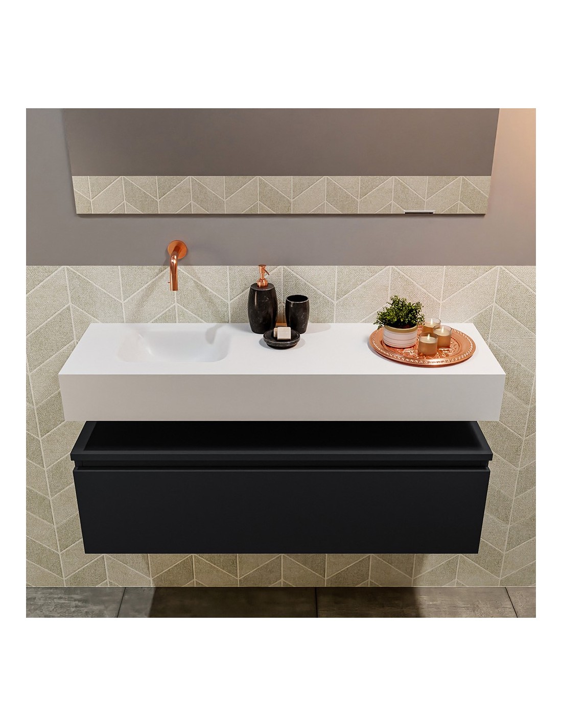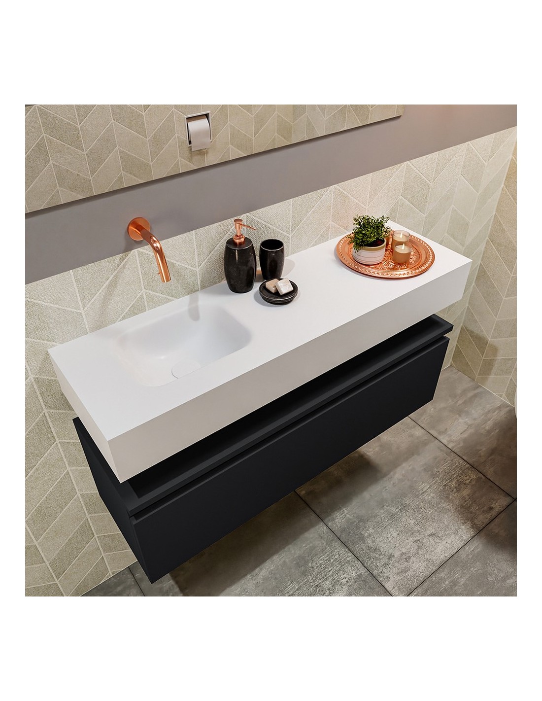 ANDOR Komplet badmiljø med venstrevendt håndvask til vægmonteret armatur. Badmiljøet kommer med 1 skuffe med fuldt udtræk, og er fremstillet i MDF. Håndvasken er fremstillet i talkumsfarvet (mat hvid) solid surface. Badmiljøet måler 100 cm i bredden. Det viste armatur medfølger ikke i sættet.