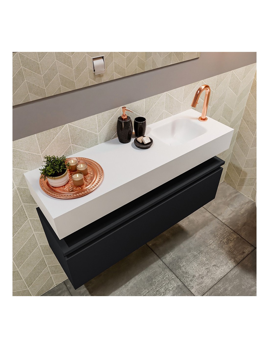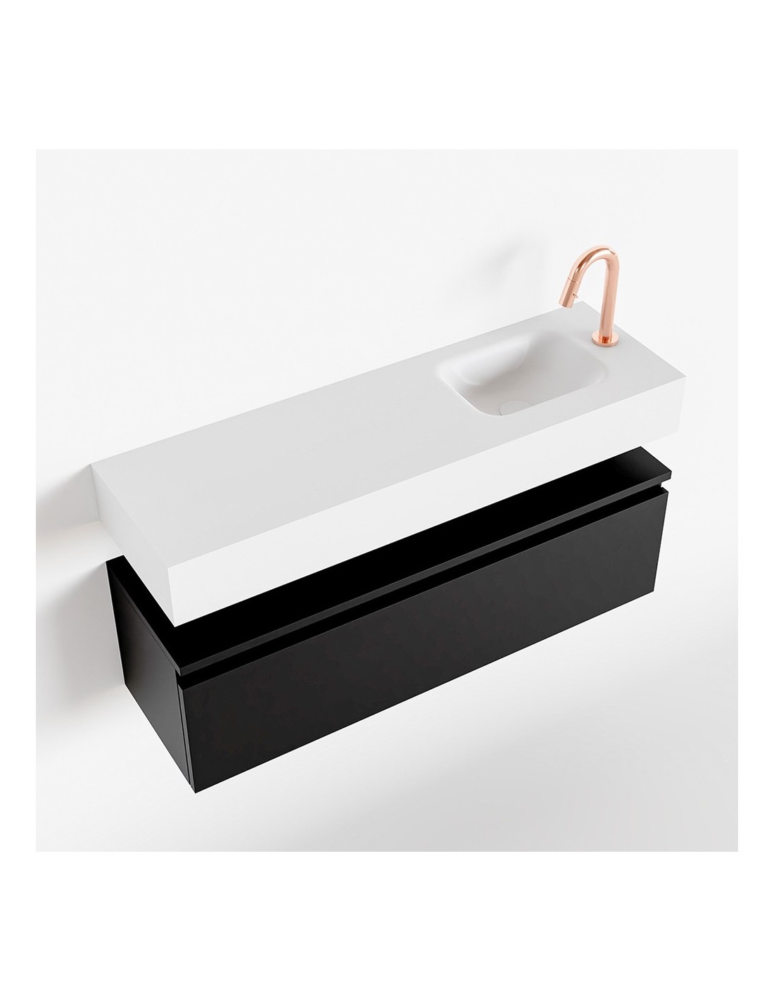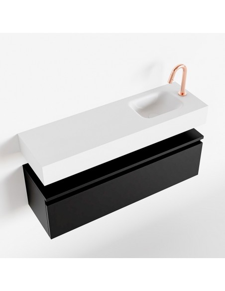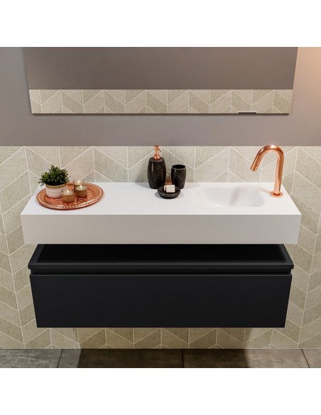 ANDOR Komplet badmiljø med højrevendt håndvask til bordmonteret armatur. Badmiljøet kommer med 1 skuffe med fuldt udtræk, og er fremstillet i MDF. Håndvasken er fremstillet i talkumsfarvet (mat hvid) solid surface. Badmiljøet måler 100 cm i bredden. Det viste armatur medfølger ikke i sættet.