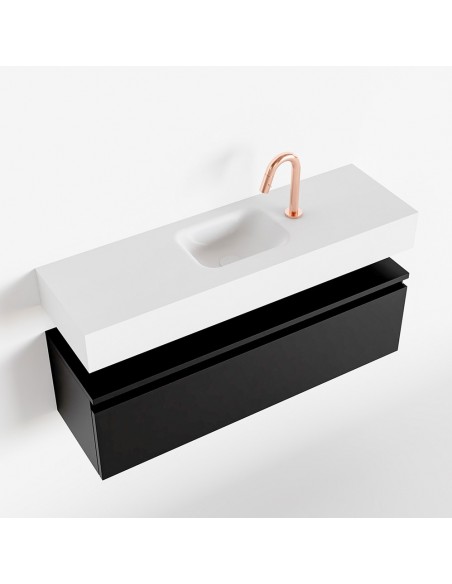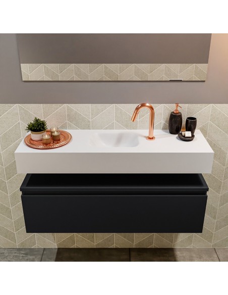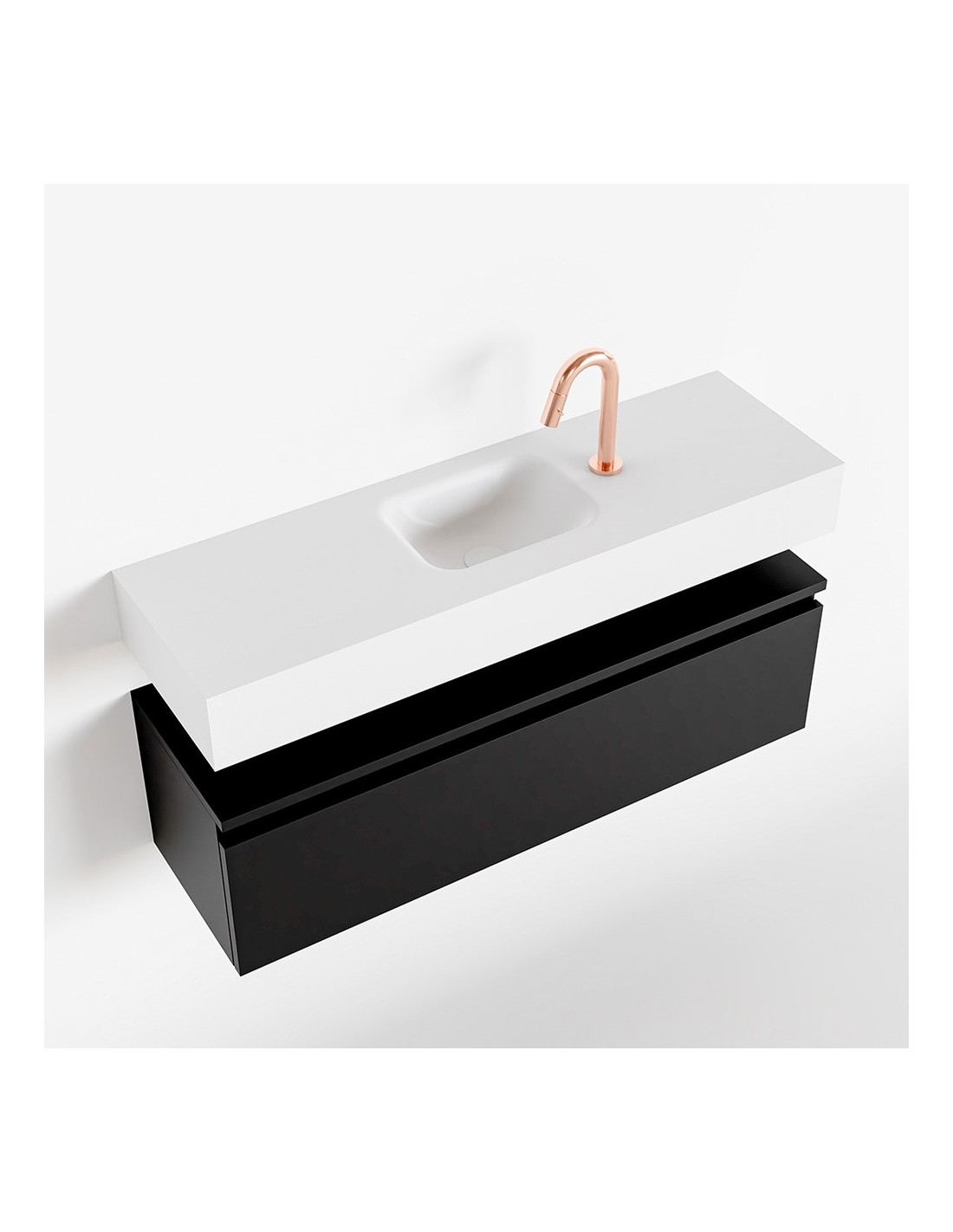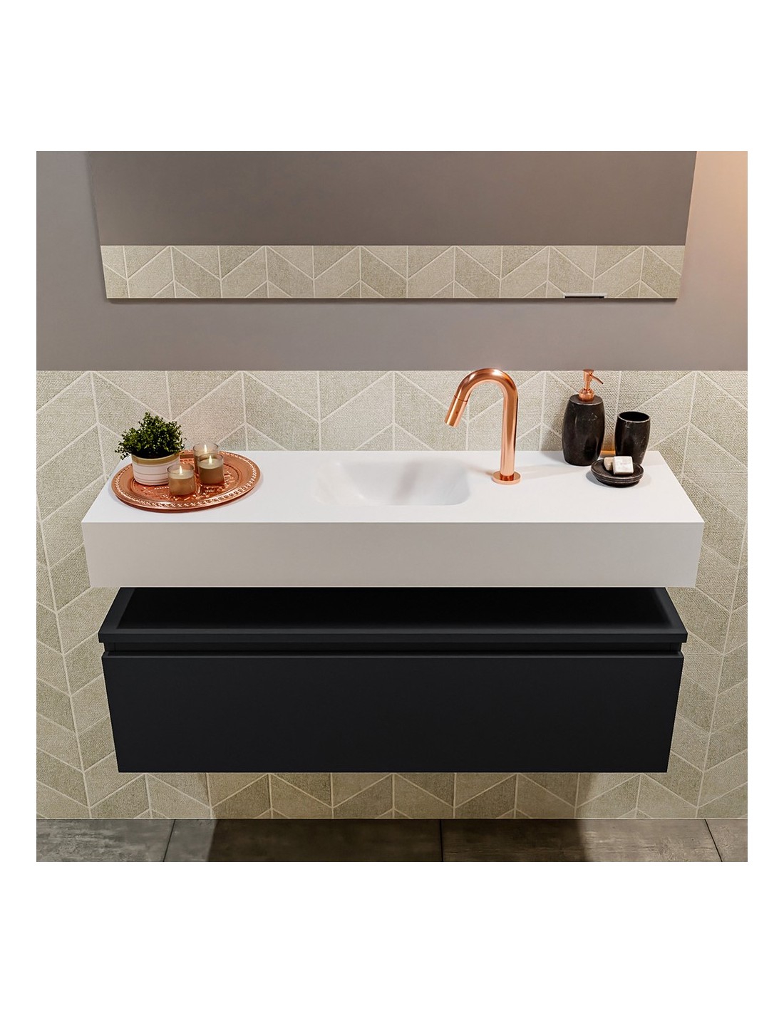 ANDOR Komplet badmiljø med midt centreret håndvask til bordmonteret armatur. Badmiljøet kommer med 1 skuffe med fuldt udtræk, og er fremstillet i MDF. Håndvasken er fremstillet i talkumsfarvet (mat hvid) solid surface. Badmiljøet måler 100 cm i bredden. Det viste armatur medfølger ikke i sættet.